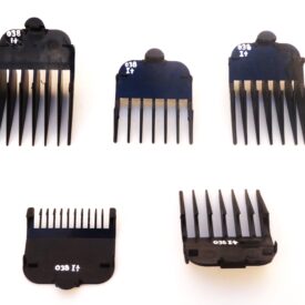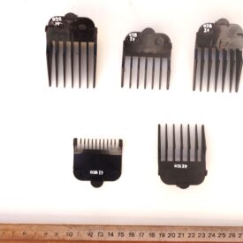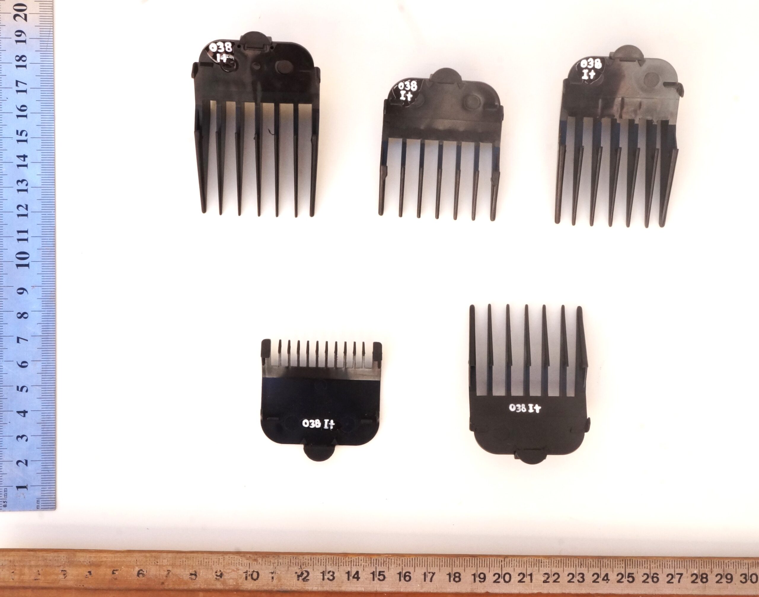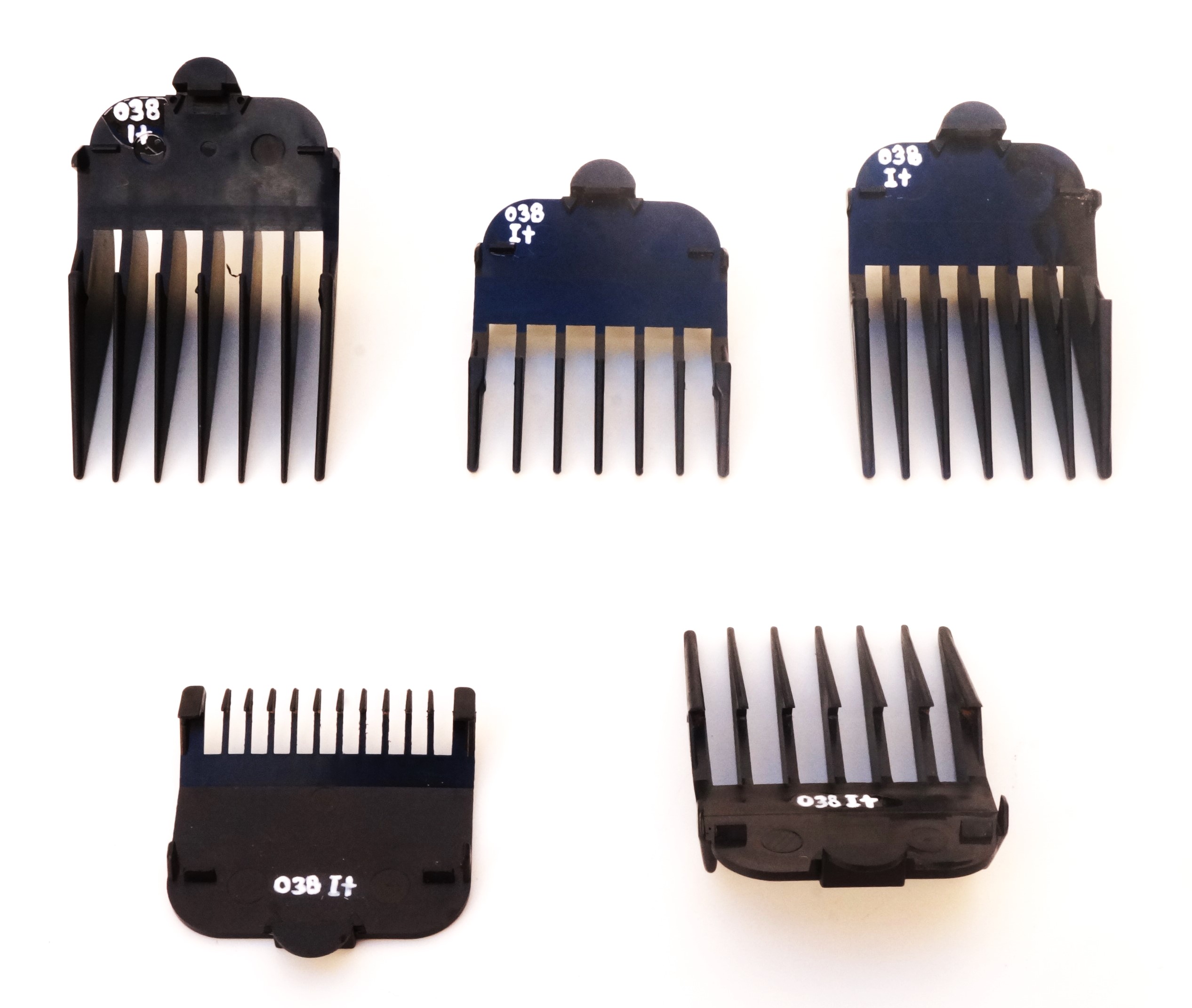 Junto à maquina, foram doados cinco pentes pretos de plástico numerados: pente nº 1 com 4,5 cm de comprimento; pente nº 2 com 6,5 cm de comprimento; pente nº 3 com 7 cm de comprimento; pente nº 4 com 7,5 cm de comprimento e; pente nº 7 com 8 cm de comprimento.
