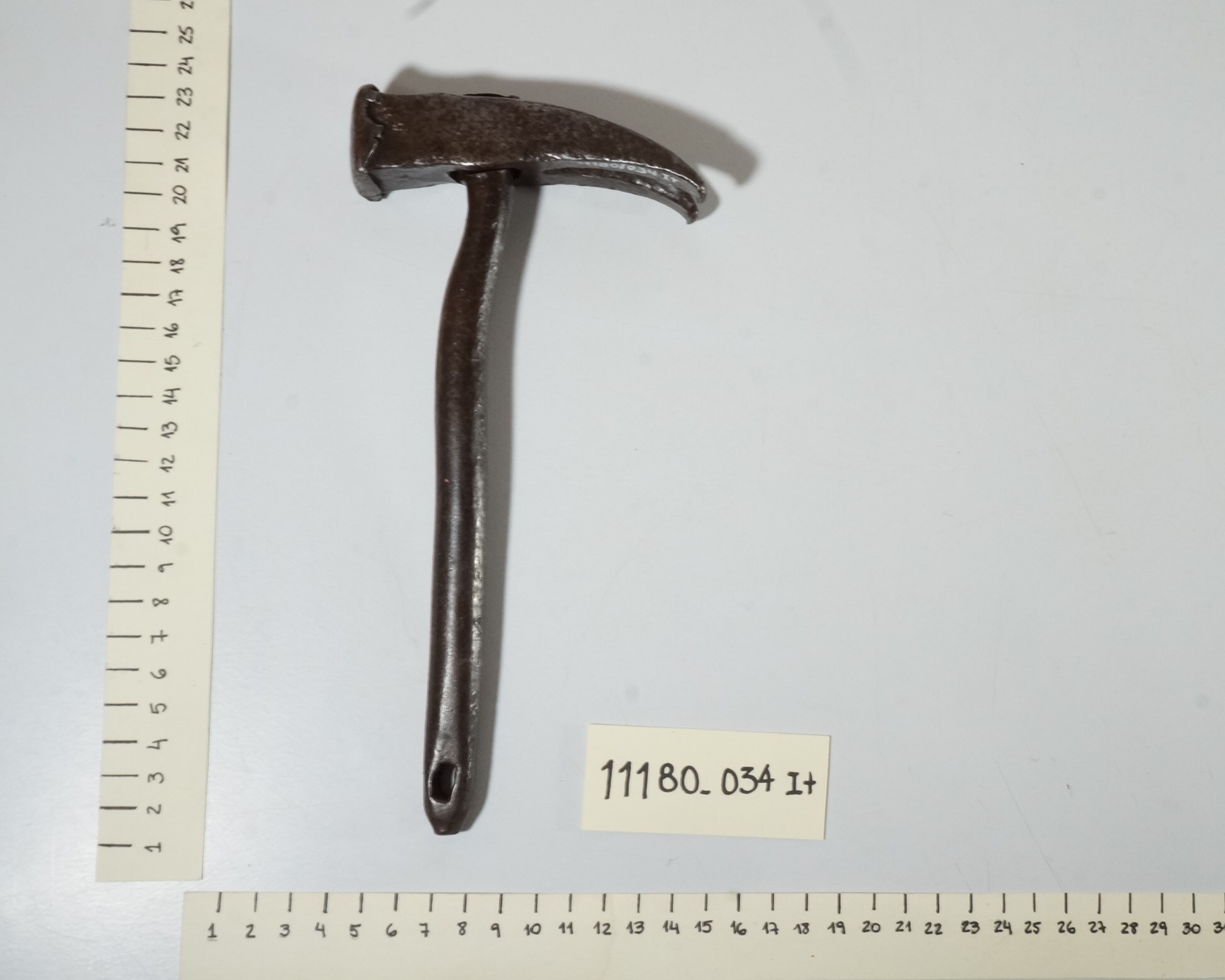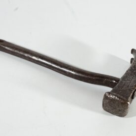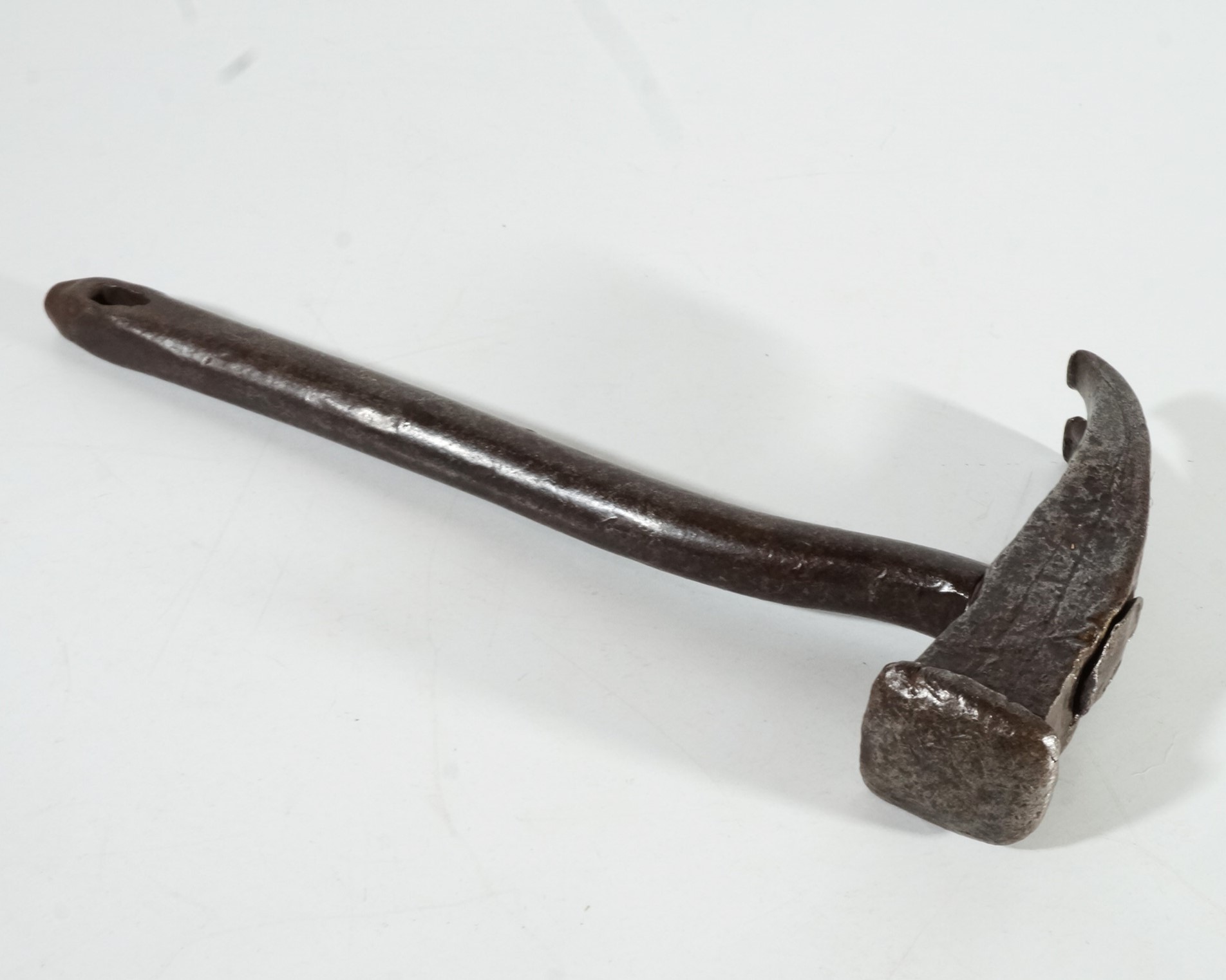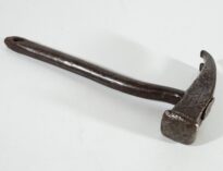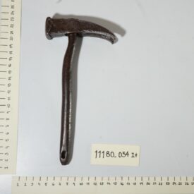 Martelo composto por duas partes, cabeça e cabo, ambas de ferro escuro. Modelo tipo martelo de unha, tem a função dupla de martelar e remover pregos de diferentes superfícies.