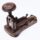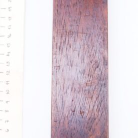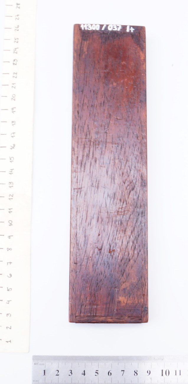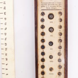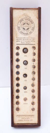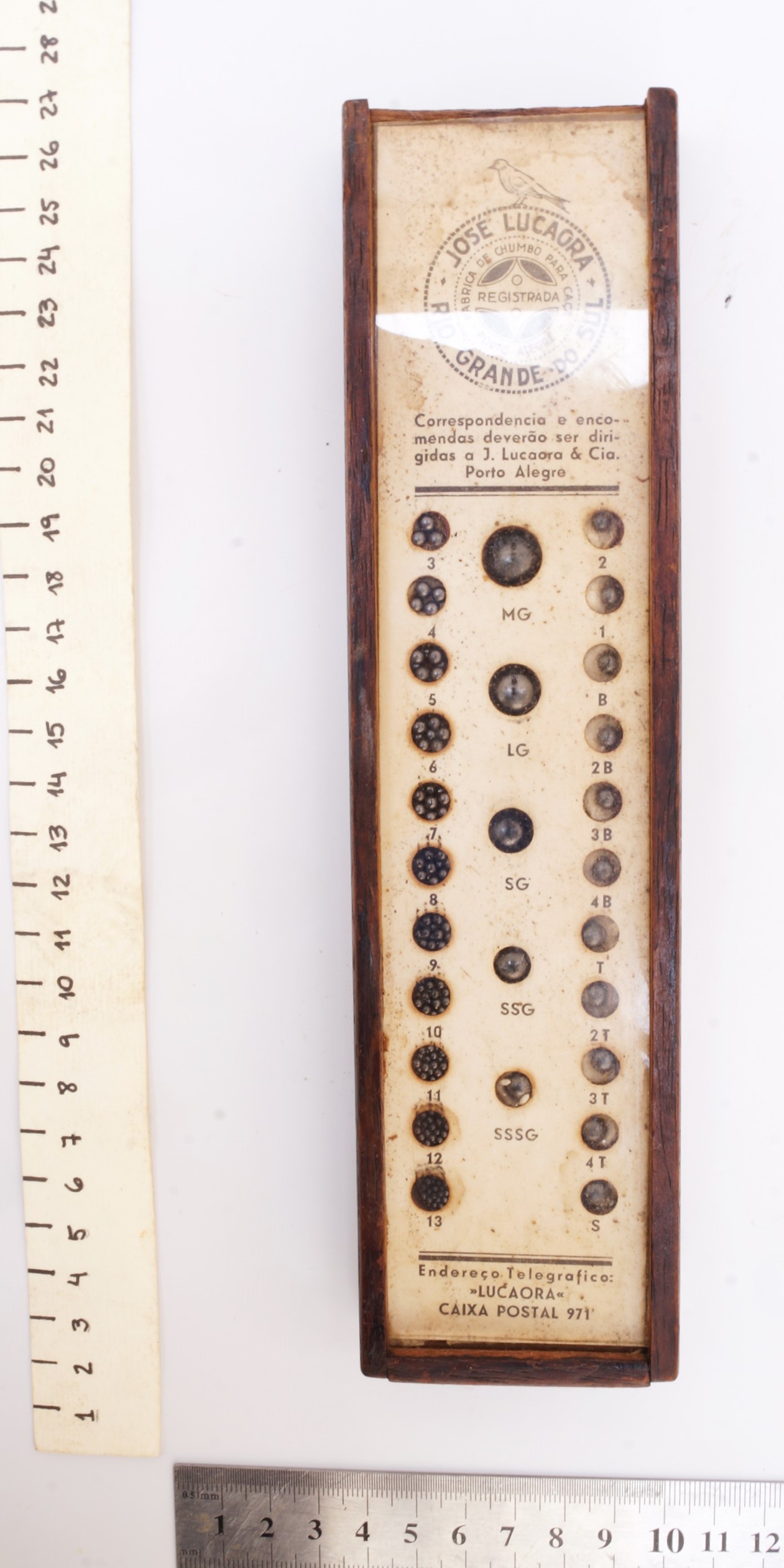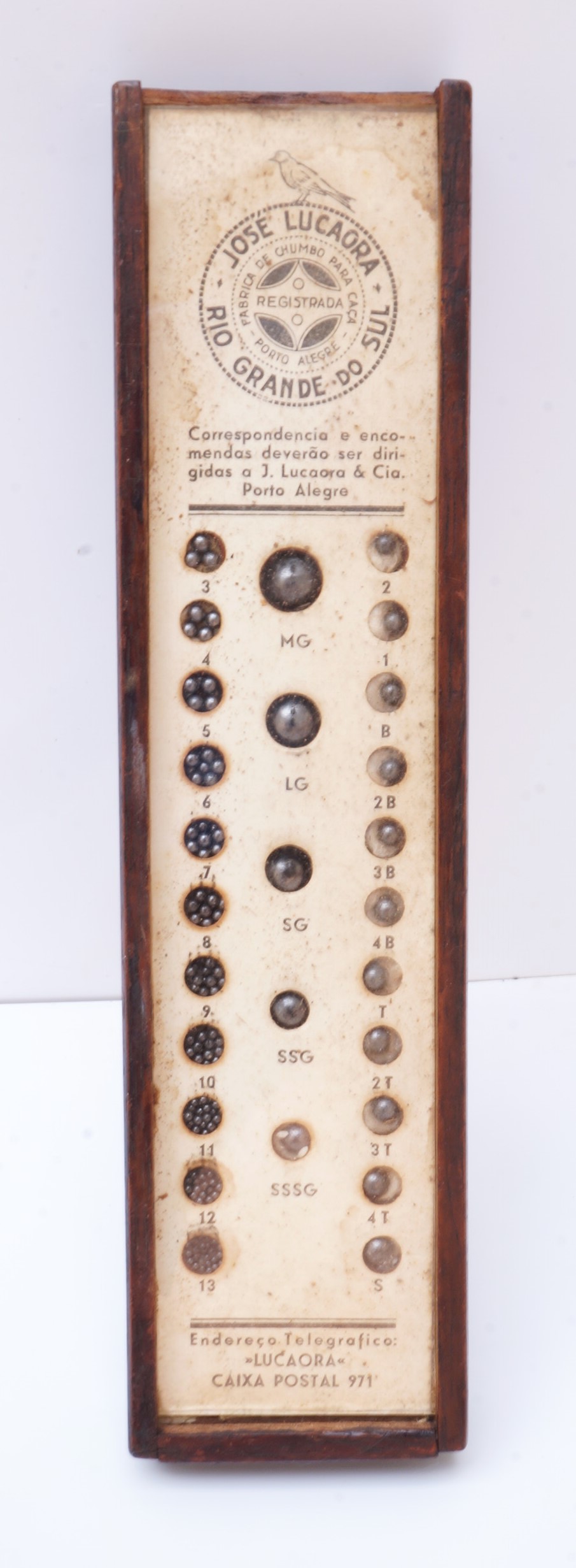Mostruário retangular de madeira. Um visor de plástico transparente revela um rótulo de papel branco e amostras de chumbo. No topo do papel foi impresso em tinta preta a etiqueta redonda da fabricante “JOSÉ LUCAORA | RIO GRANDE DO SUL | FÁBRICA DE CHUMBO PARA CAÇA – PORTO ALEGRE | REGISTRADA”, na qual senta a imagem de um passarinho. Abaixo da etiqueta há o texto “Correspondência e encomendas deverão ser dirigidas a J. Lucaora & Cia. Porto Alegre”. Em seguida há três colunas de amostras de chumbo, as quais são reveladas por aberturas circulares no papel. Na base do papel foi impresso “Endereço Telegrafico: >LUCAORA< CAIXA POSTAL 971”.