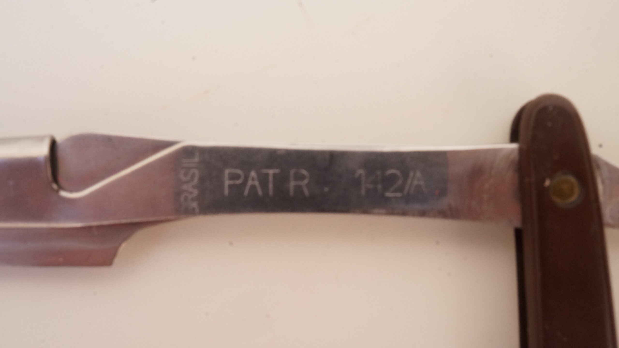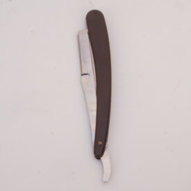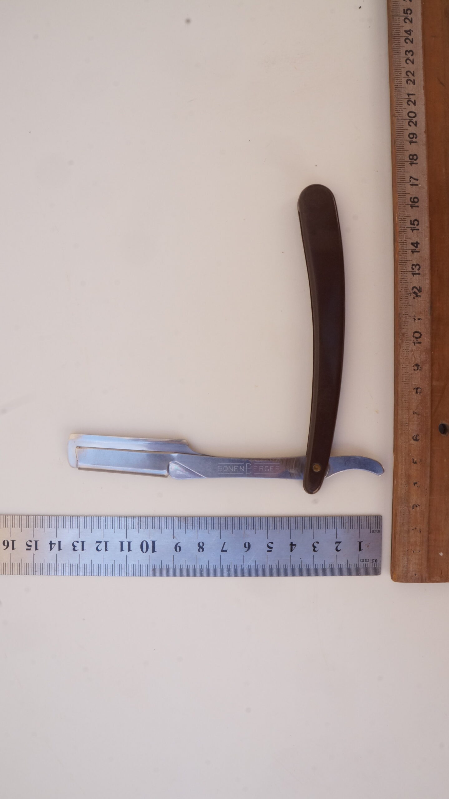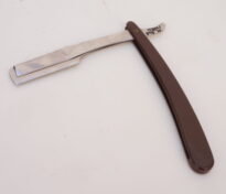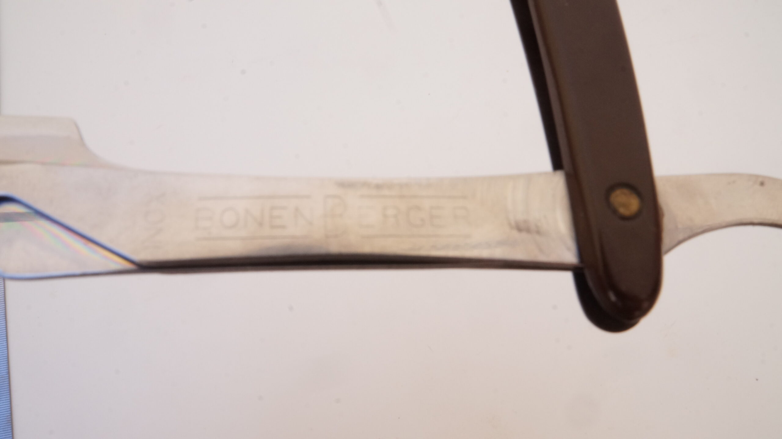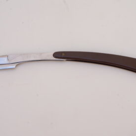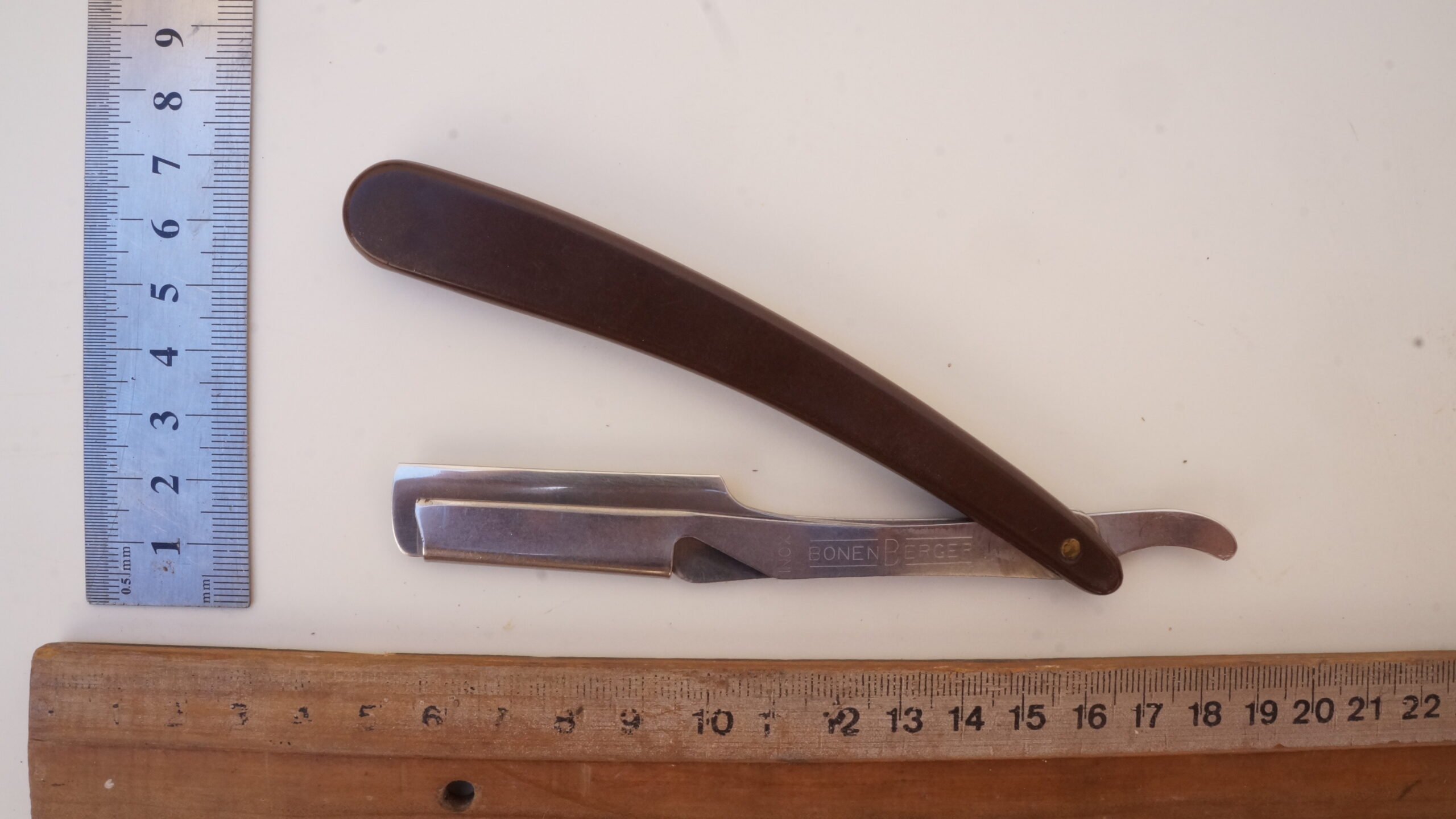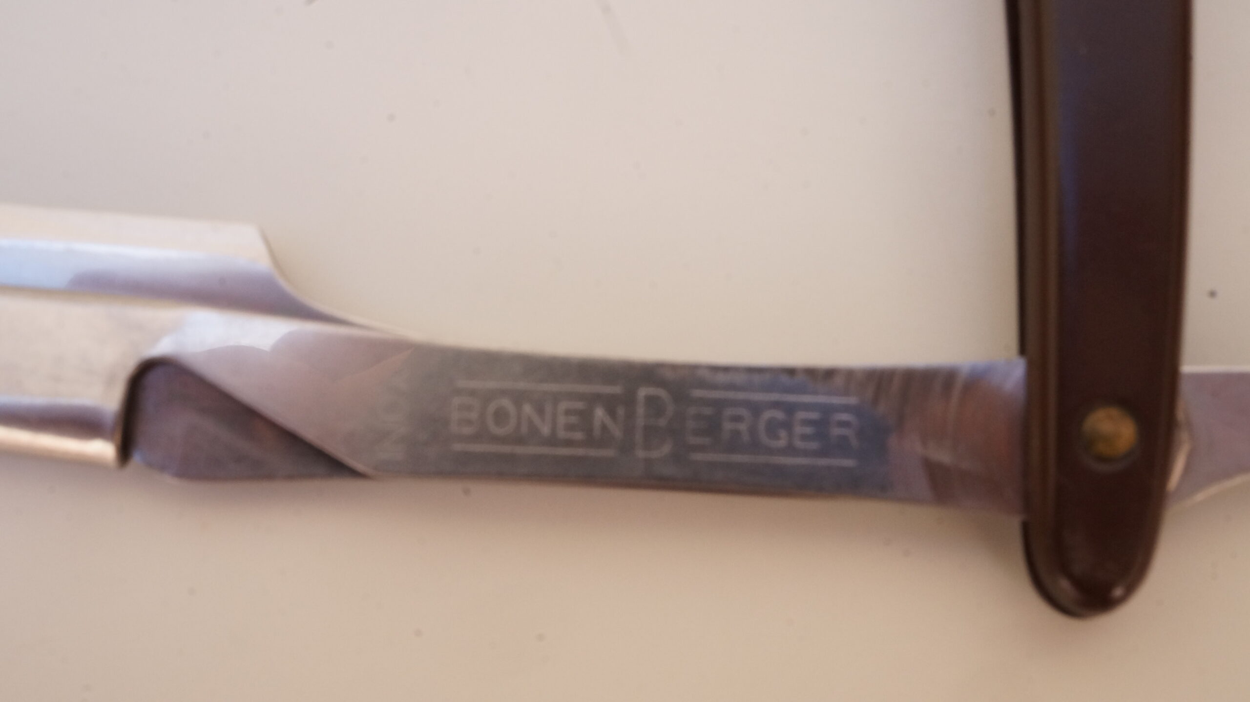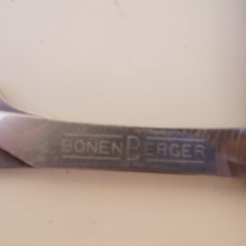 Navalhete com haste de metal prateado e cabo de plástico castanho escuro. A haste possui uma cauda curva, um compartimento para encaixe de lâminas e uma estrutura de fixação. O compartimento e a estrutura se separam entre si, mantendo-se presos ao cabo de plástico por um parafuso. Na espiga da haste há as inscrições, em baixo relevo, “INOX | BONEN BERGER” e no lado contrário, “BRASIL | PAT R 142/A“.