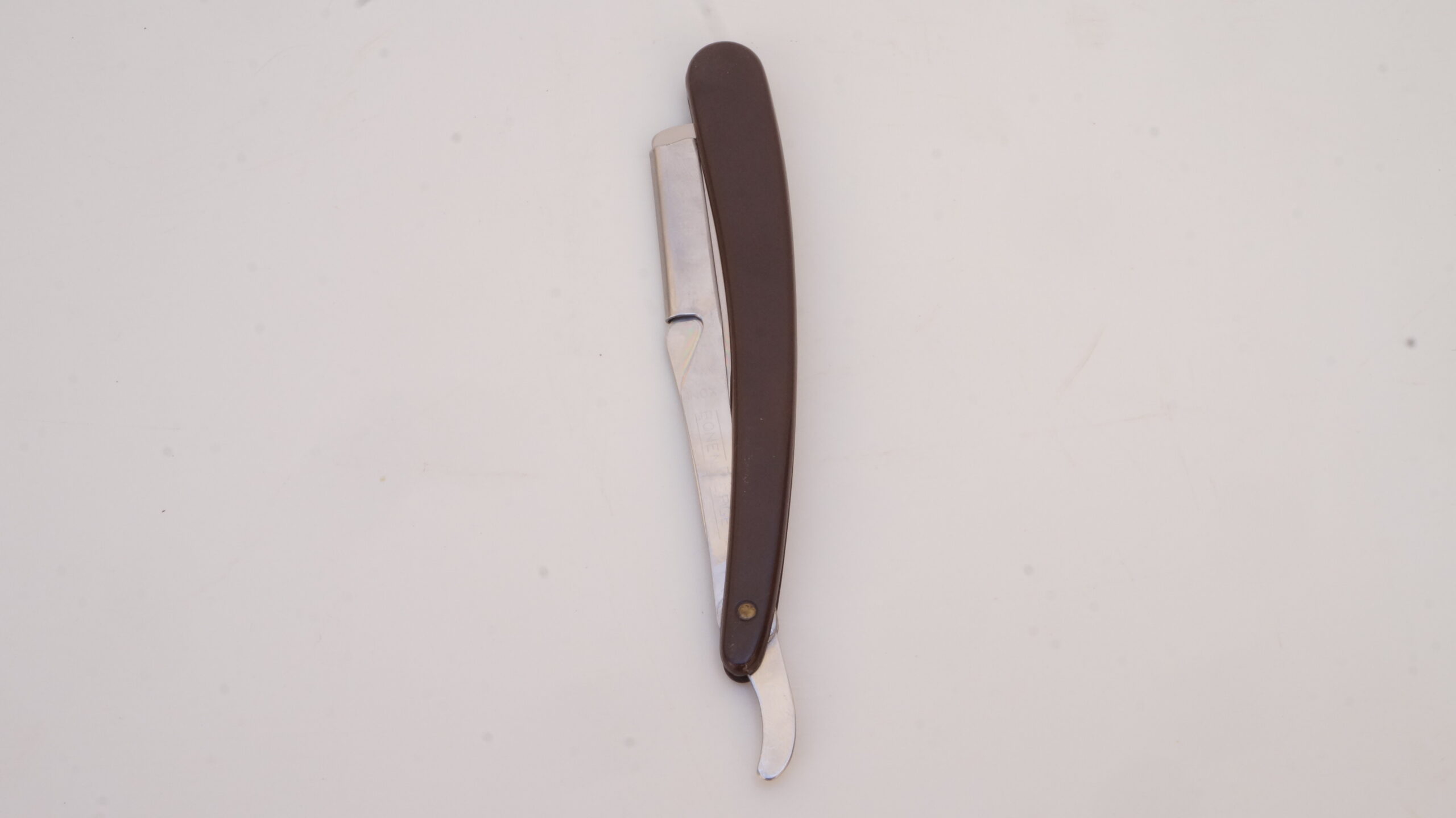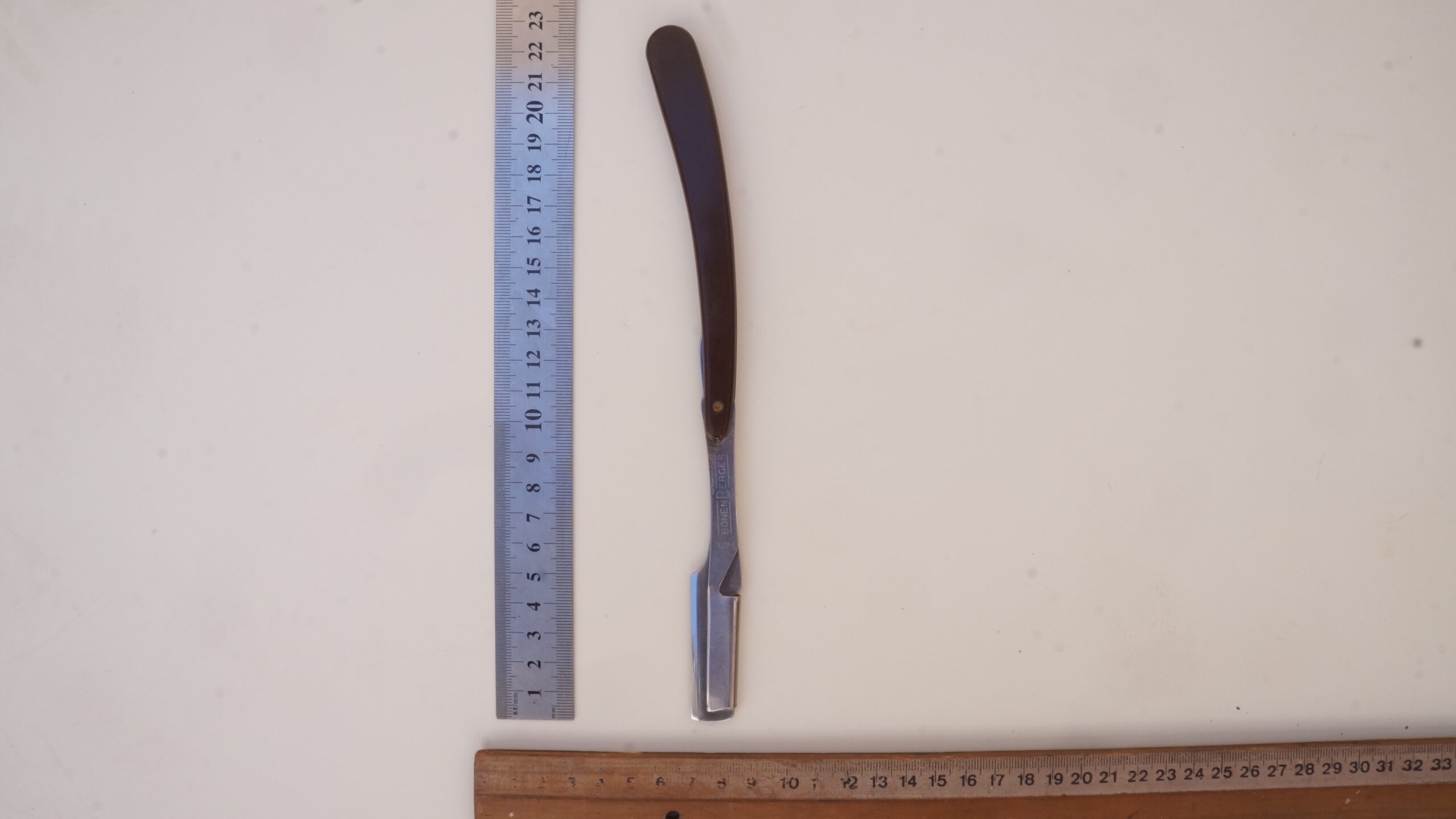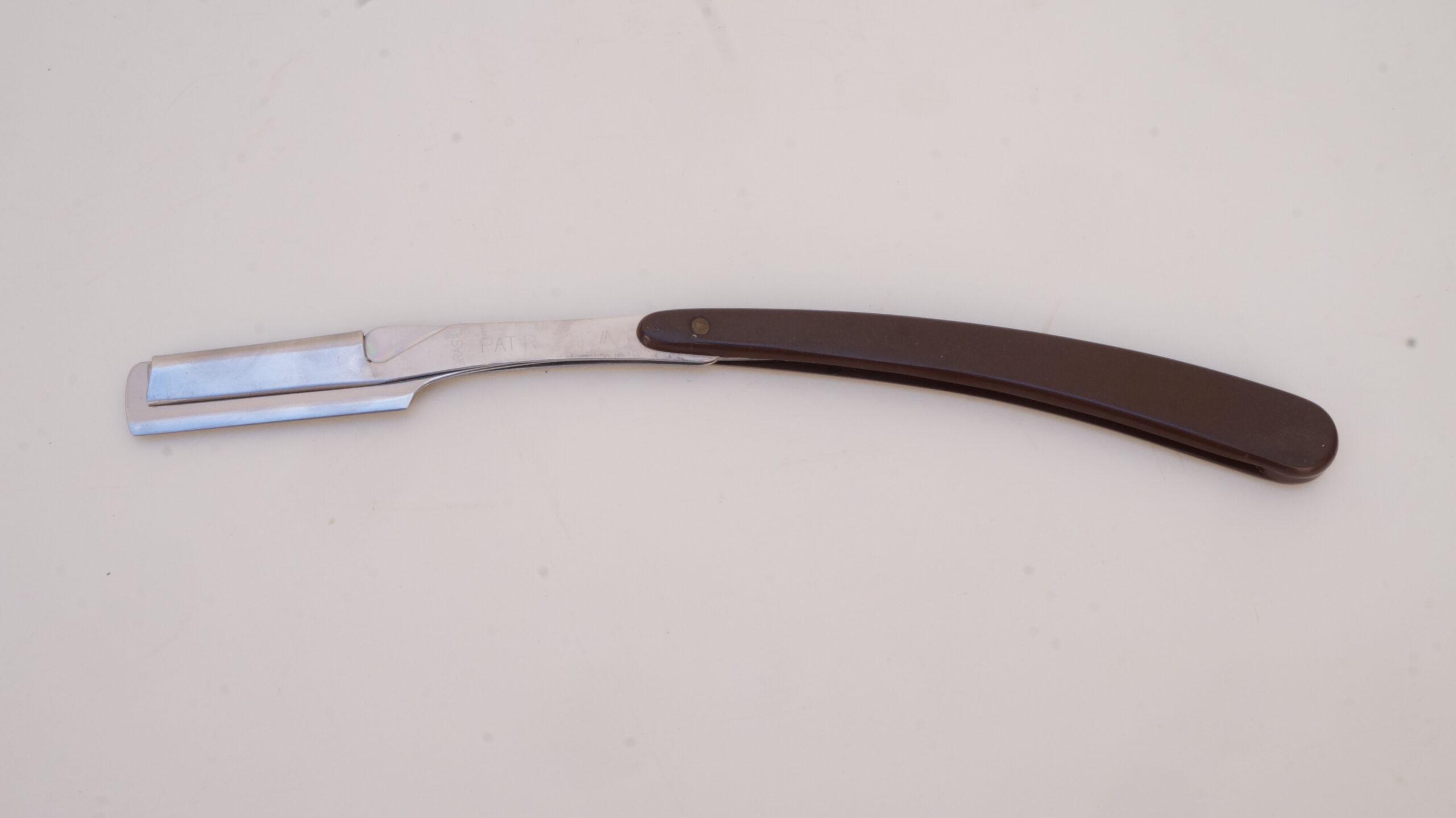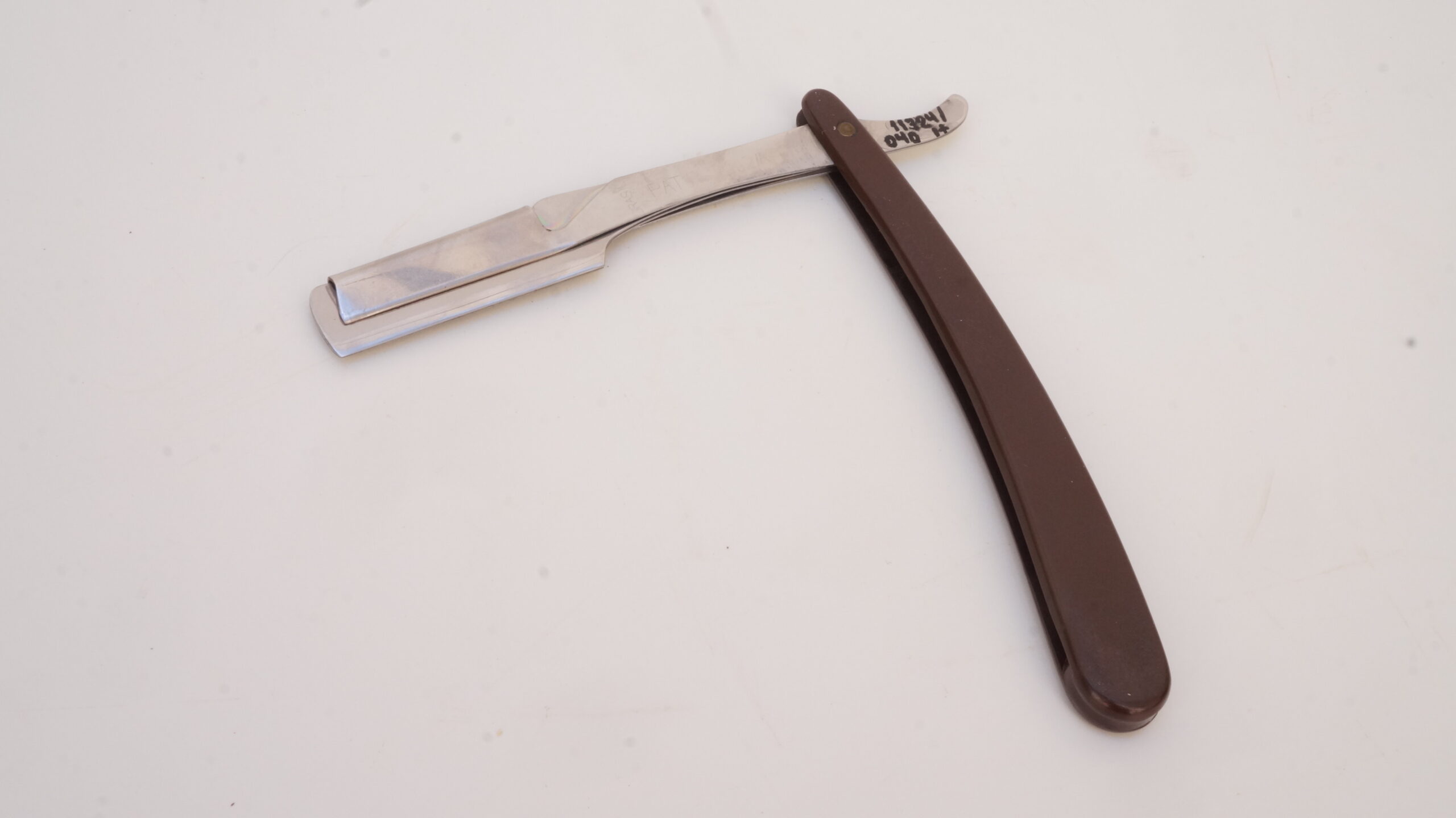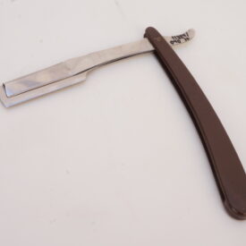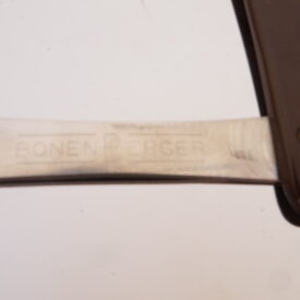 Navalhete com haste de metal prateado e cabo de plástico castanho escuro. A haste possui uma cauda curva, um compartimento para encaixe de lâminas e uma estrutura de fixação. O compartimento e a estrutura se separam entre si, mantendo-se presos ao cabo de plástico por um parafuso. Na espiga da haste há as inscrições, em baixo relevo, “INOX | BONEN BERGER” e no lado contrário, “BRASIL | PAT R 142/A“.