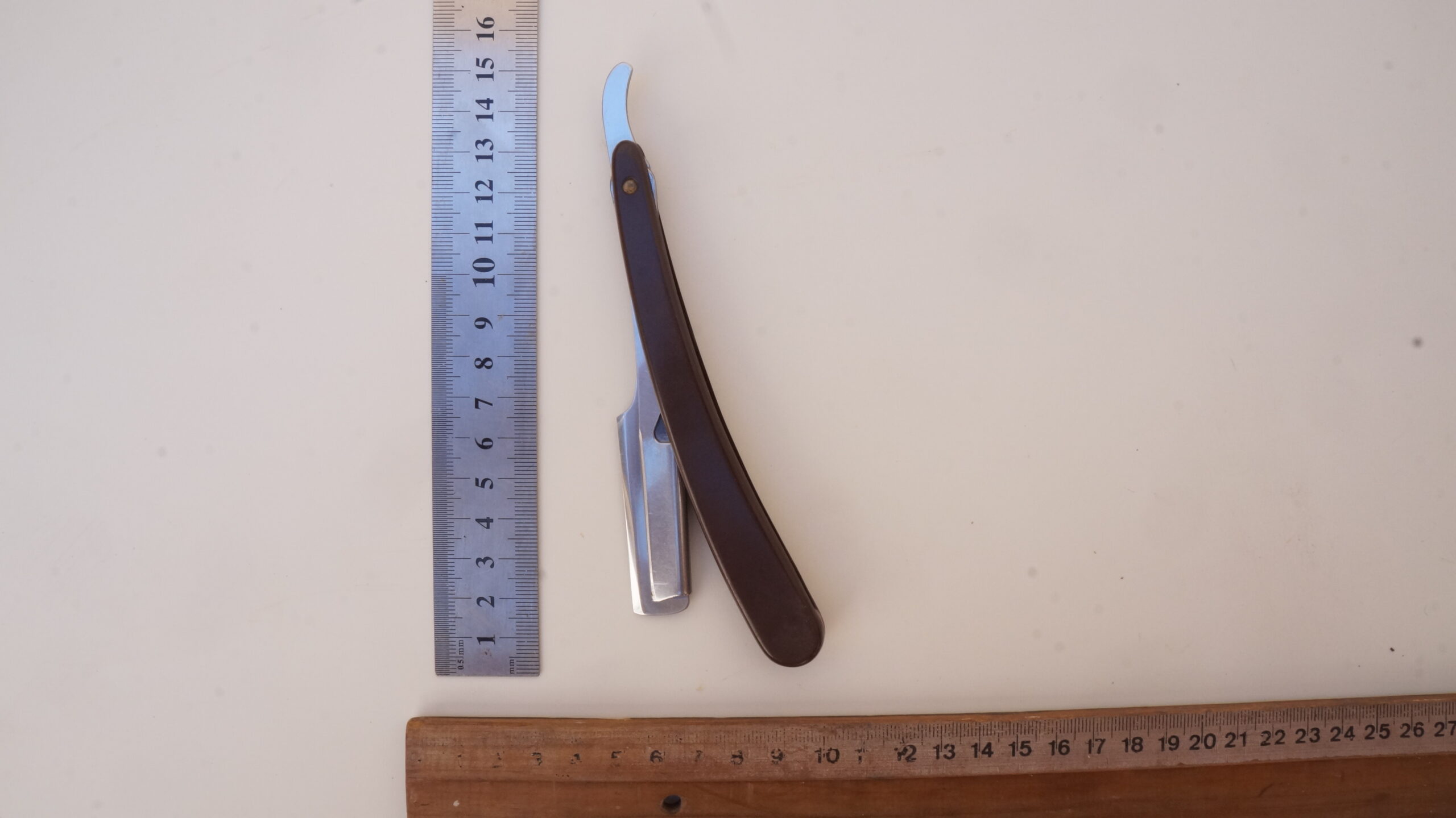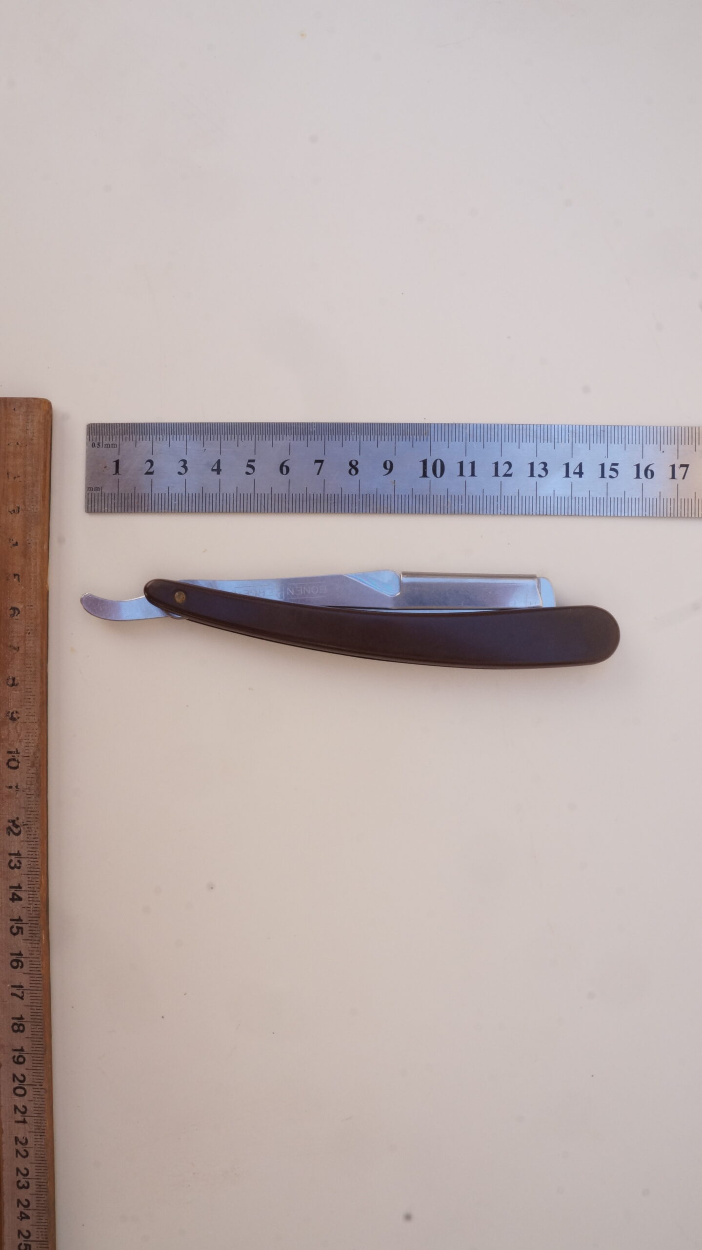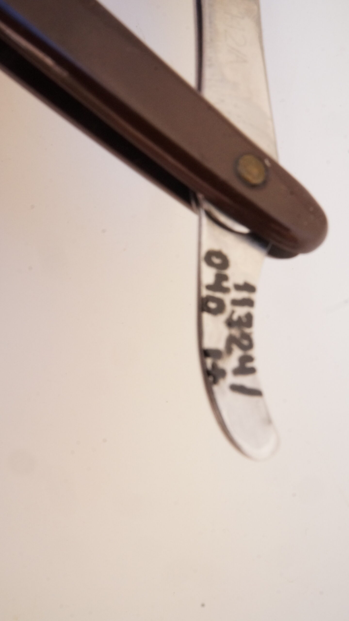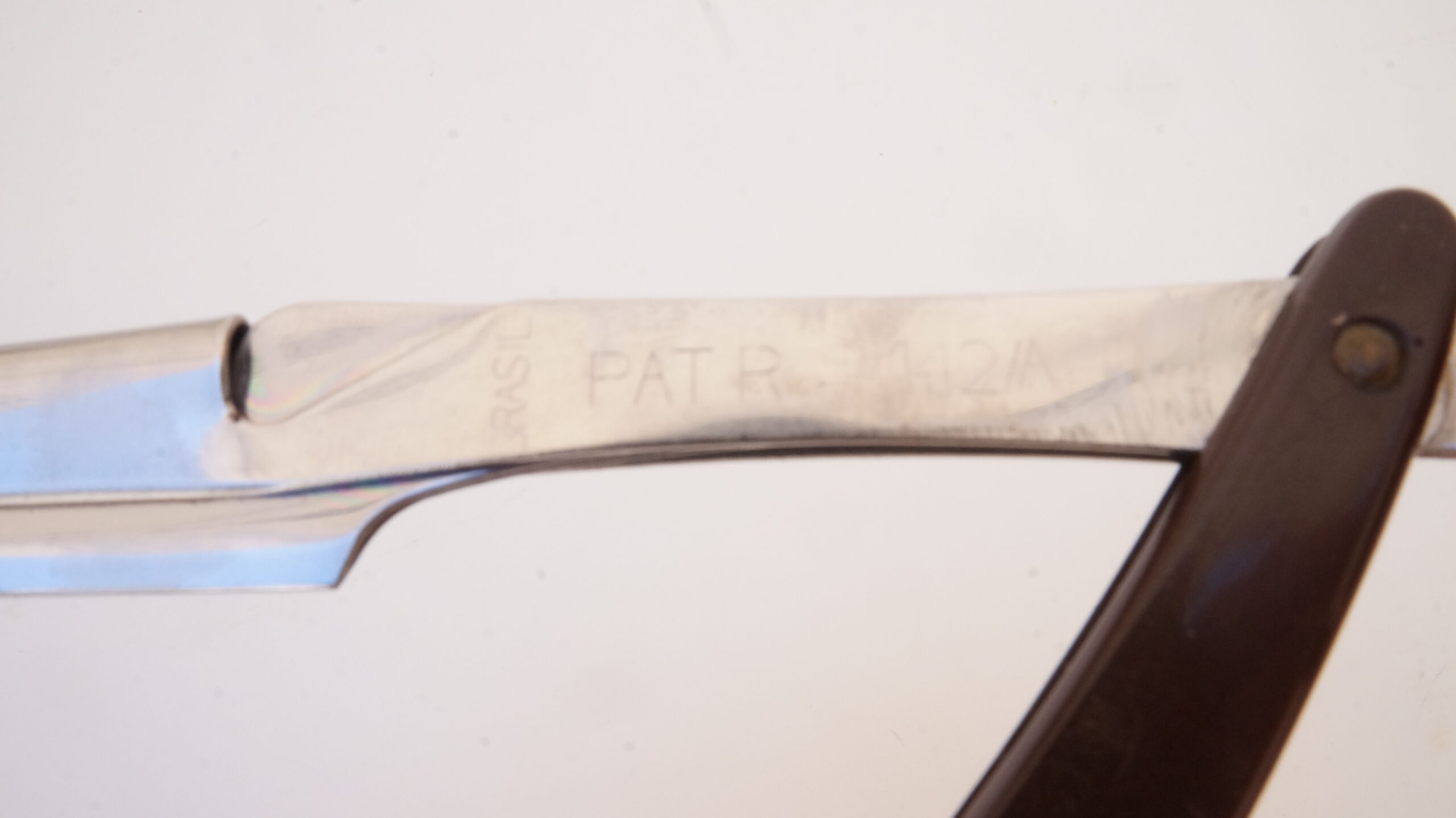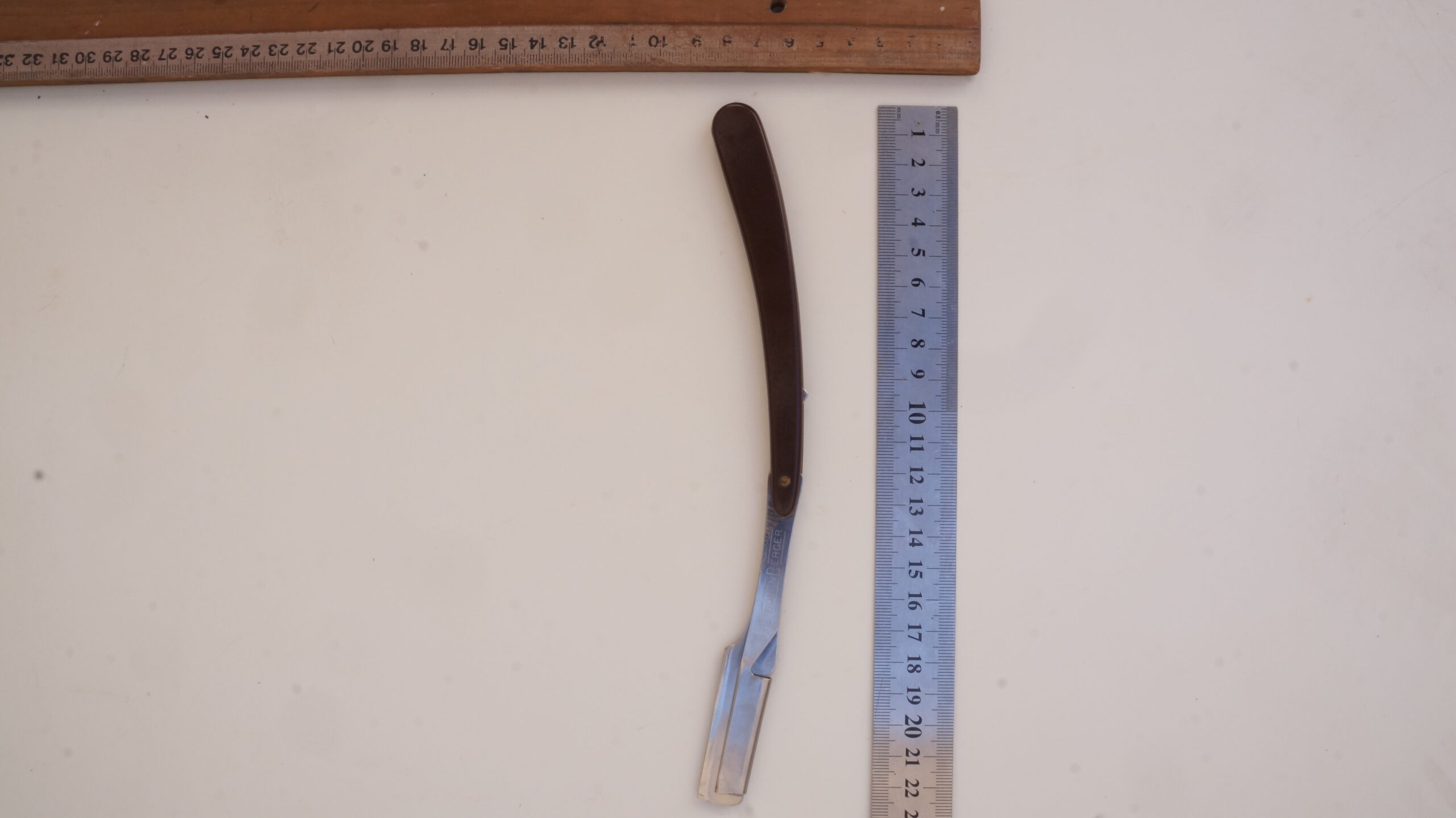 Navalhete com haste de metal prateado e cabo de plástico castanho escuro. A haste possui uma cauda curva, um compartimento para encaixe de lâminas e uma estrutura de fixação. O compartimento e a estrutura se separam entre si, mantendo-se presos ao cabo de plástico por um parafuso. Na espiga da haste há as inscrições, em baixo relevo, “INOX | BONEN BERGER” e no lado contrário, “BRASIL | PAT R 142/A“.