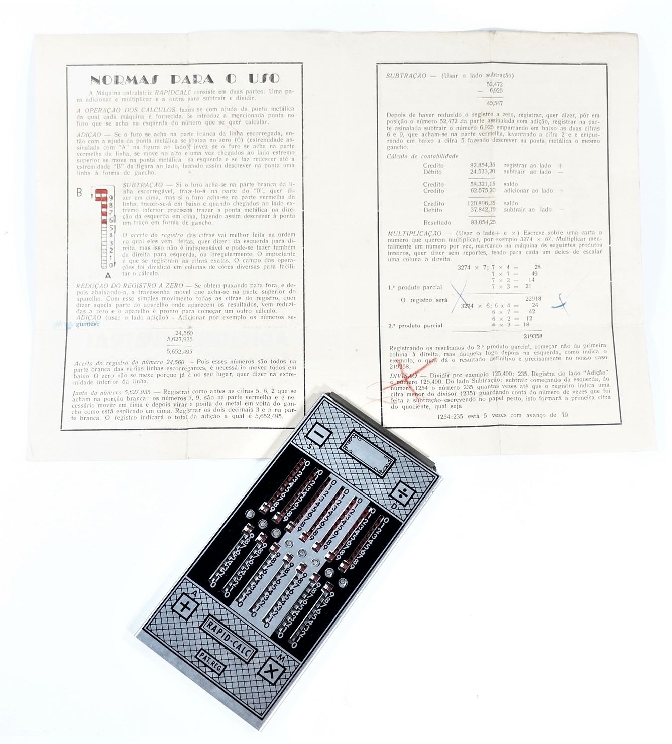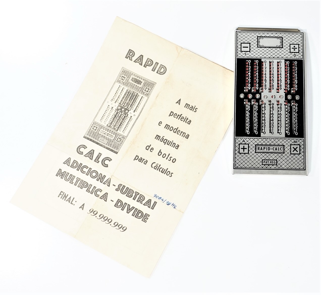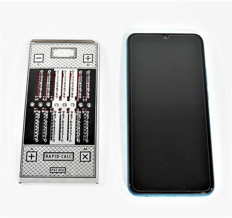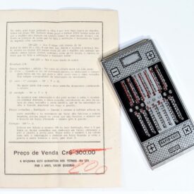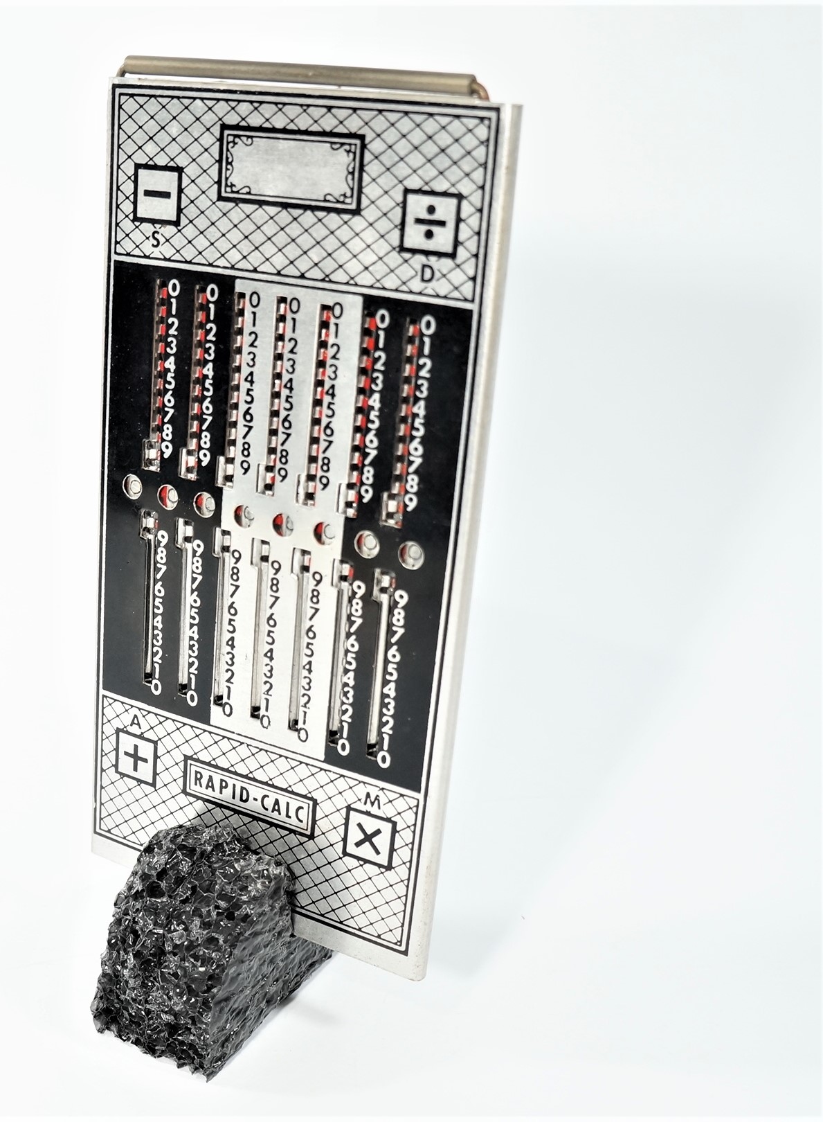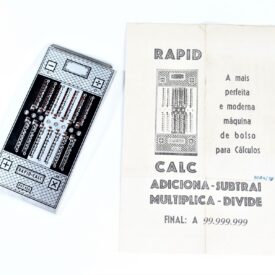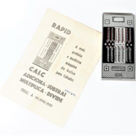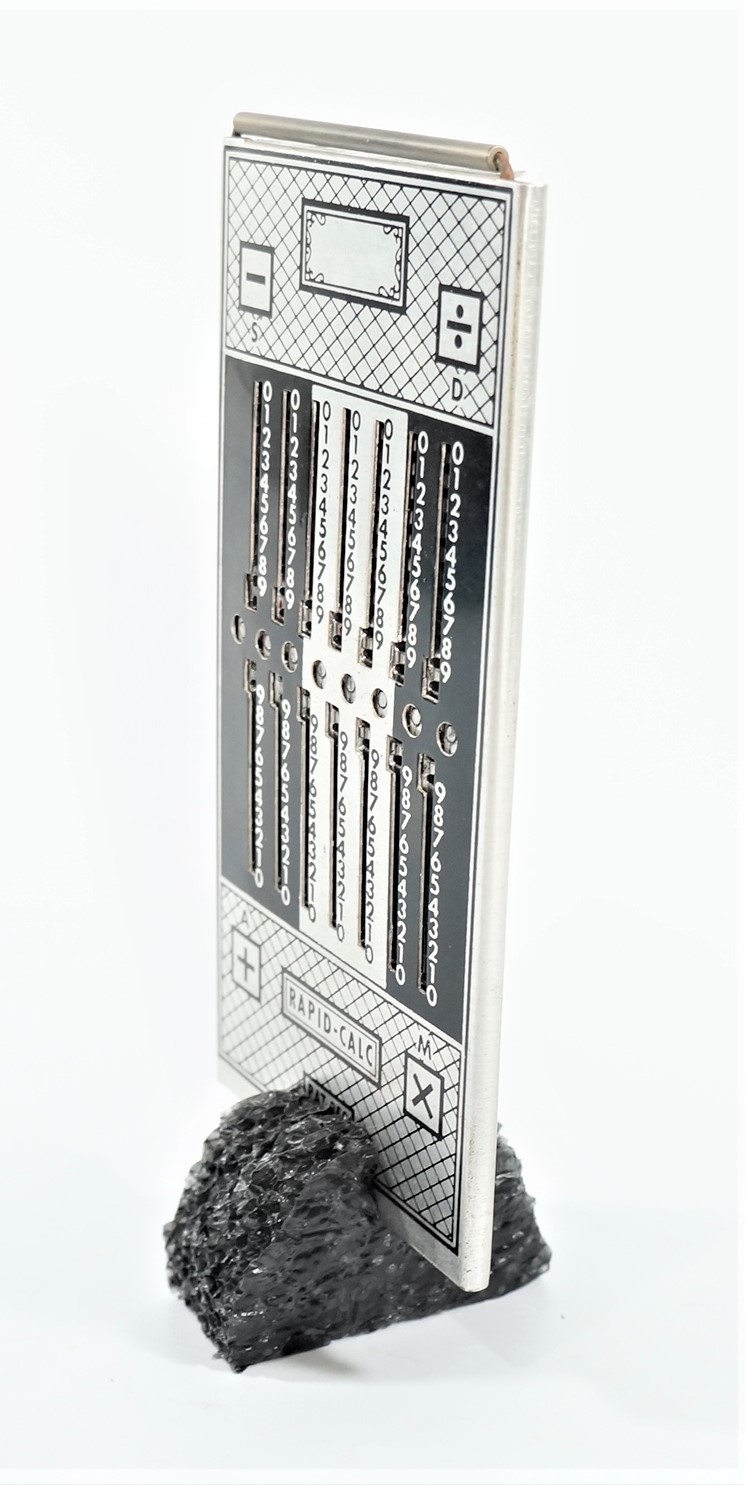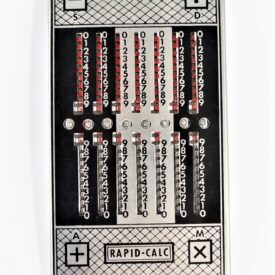 Calculadora manual, sem componentes eletrônicos, da marca Rapid-Calc. Formato retangular com várias colunas verticais. Interface composta por botões deslizantes, usados para inserir ou calcular valores manualmente. Efetua as quatro operações de adicionar, subtrair, multiplicar e dividir. Dividida em duas partes, uma para adicionar e multiplicar e outra para subtrair e dividir. Cálculos básicos ou contábeis, com operação mecânica por meio de ponta metálica a ser inserida no furo à esquerda do número que se quer calcular.