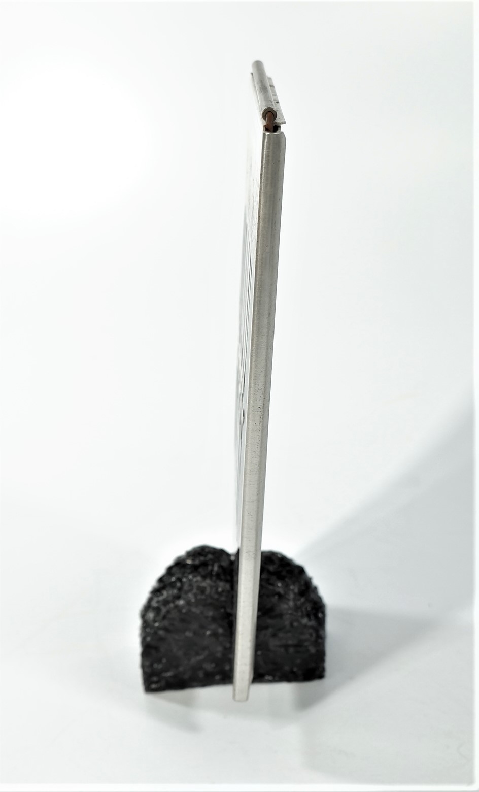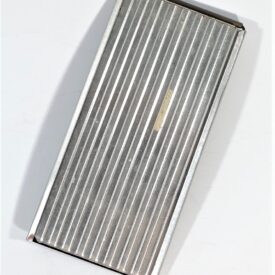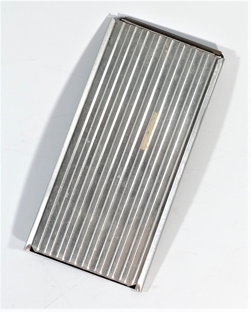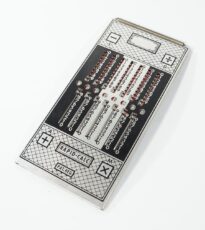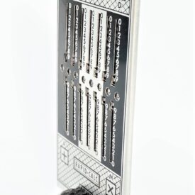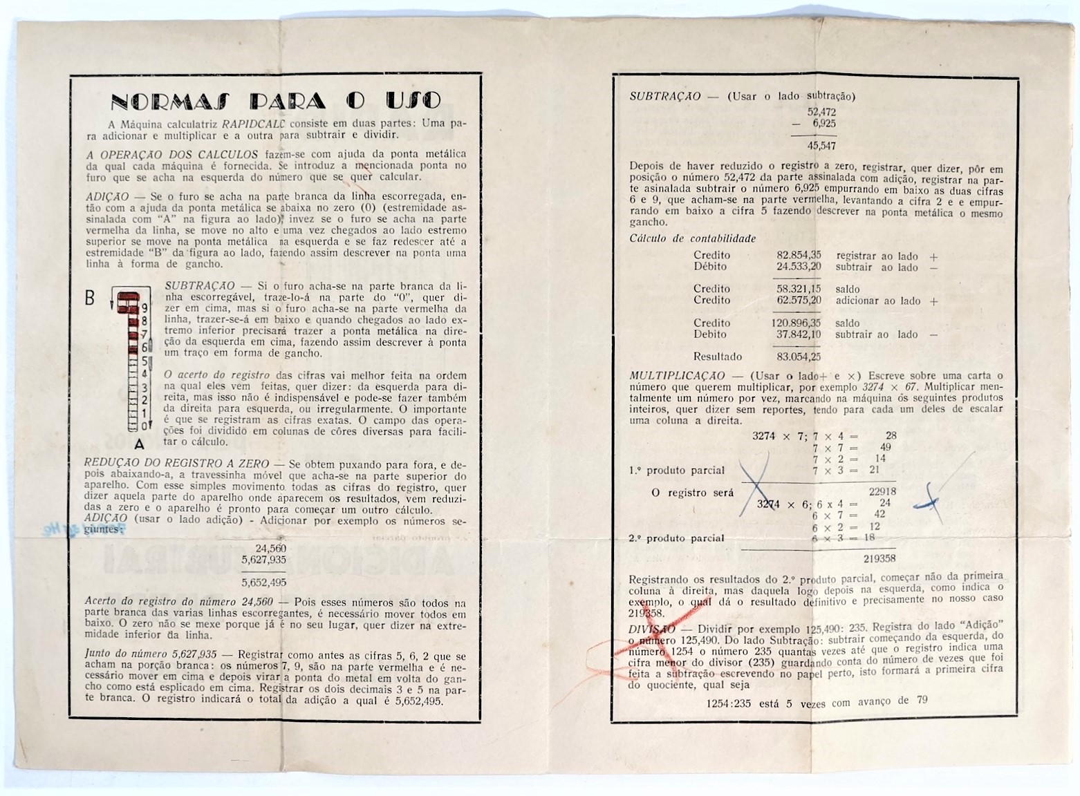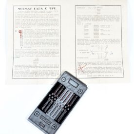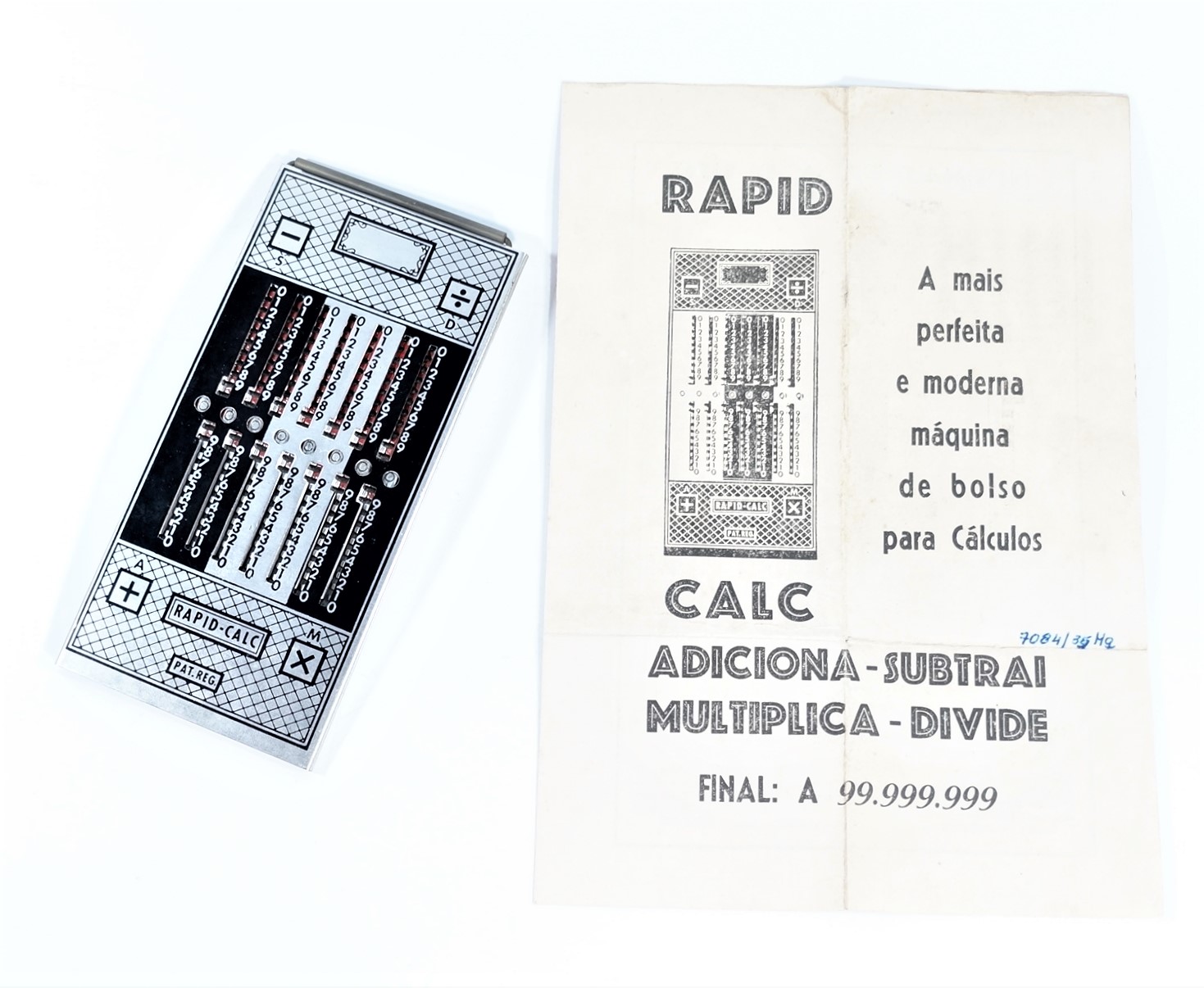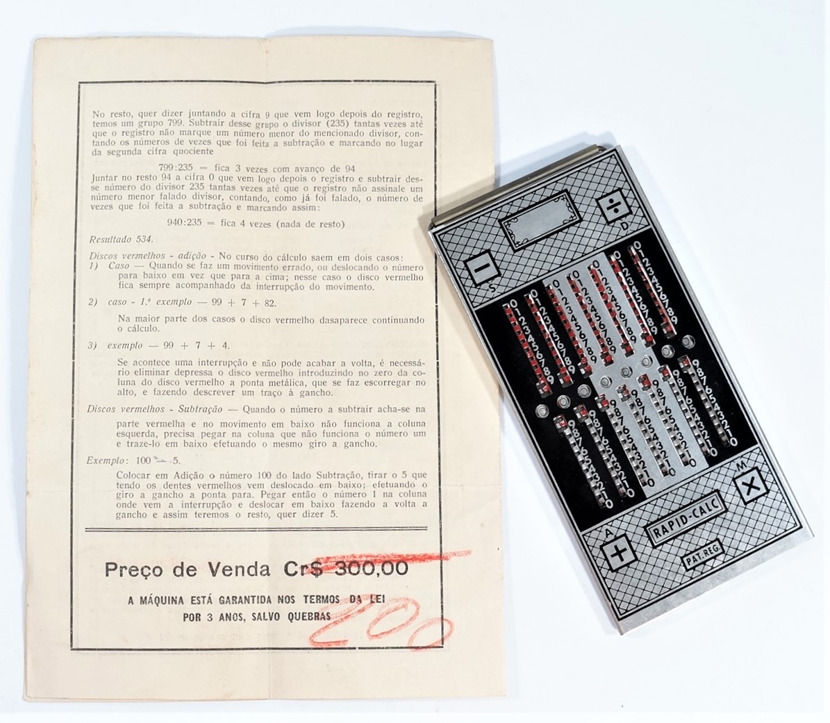 Calculadora manual, sem componentes eletrônicos, da marca Rapid-Calc. Formato retangular com várias colunas verticais. Interface composta por botões deslizantes, usados para inserir ou calcular valores manualmente. Efetua as quatro operações de adicionar, subtrair, multiplicar e dividir. Dividida em duas partes, uma para adicionar e multiplicar e outra para subtrair e dividir. Cálculos básicos ou contábeis, com operação mecânica por meio de ponta metálica a ser inserida no furo à esquerda do número que se quer calcular.