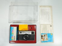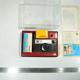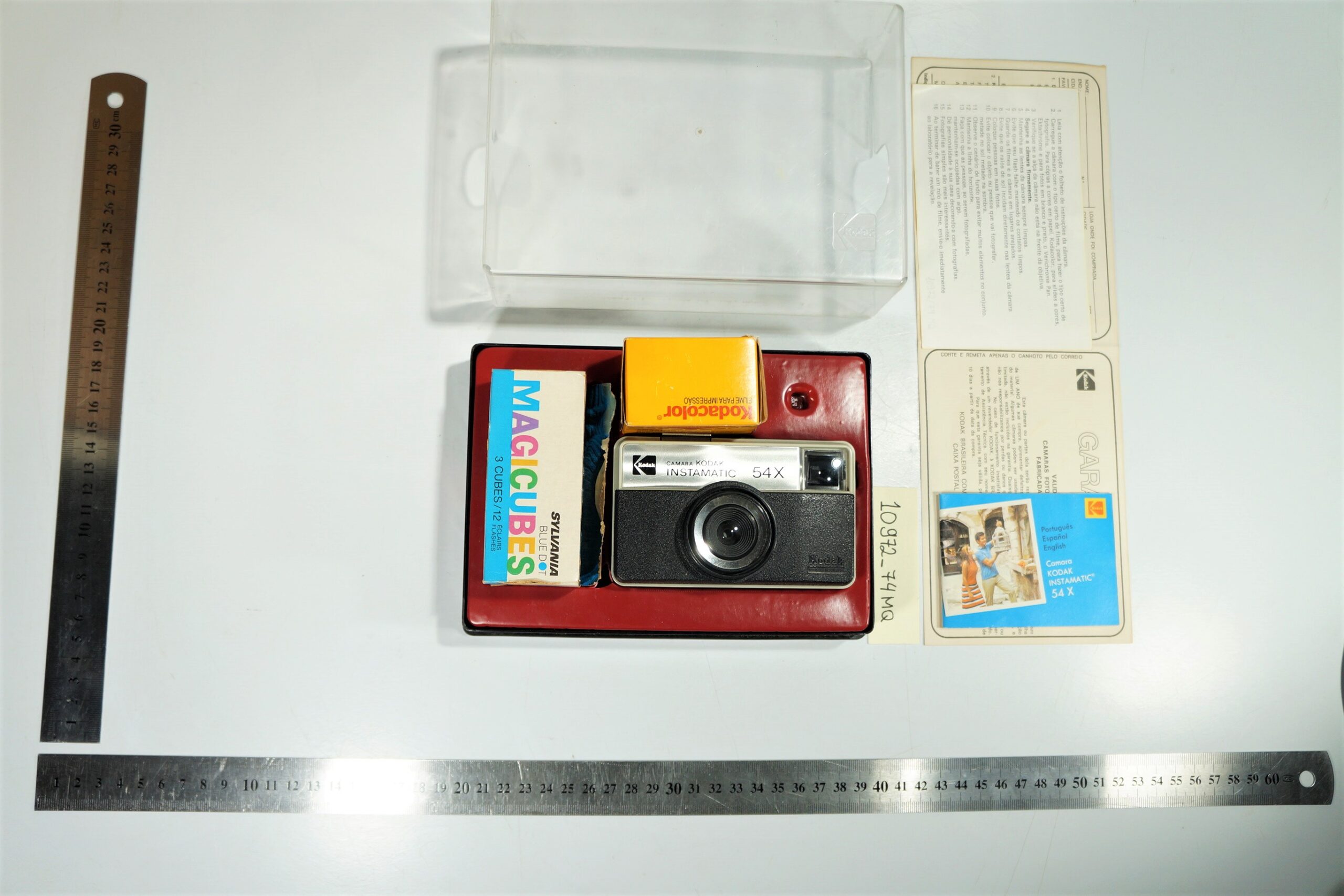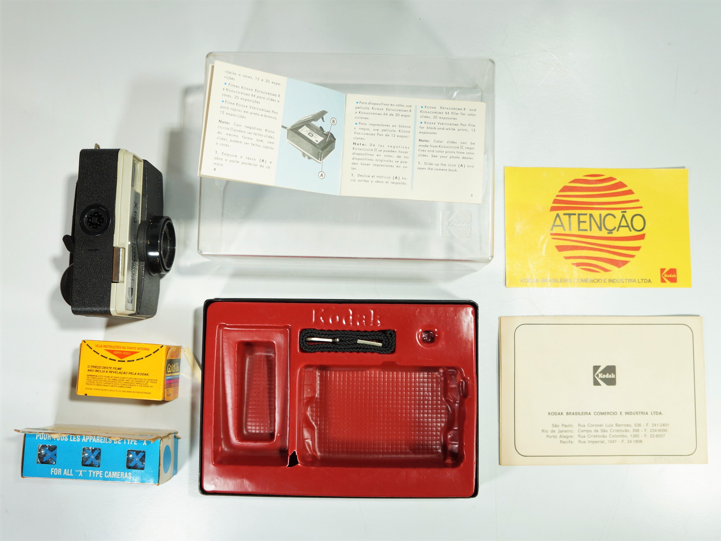 Máquina fotográfica Kodak Instamatic 54x, acondicionada em sua caixa original com base nas cores preta e vermelha e tampa de acrílico transparente. O conjunto inclui uma caixa de flashes Sylvania Blue Dot Magicubes, um filme Kodak Plus de 12 poses lacrado, além dos termos de garantia, manual de uso e recomendações. A câmera apresenta design compacto e funcional, típico da linha Instamatic, voltada para uso doméstico e amador.