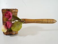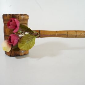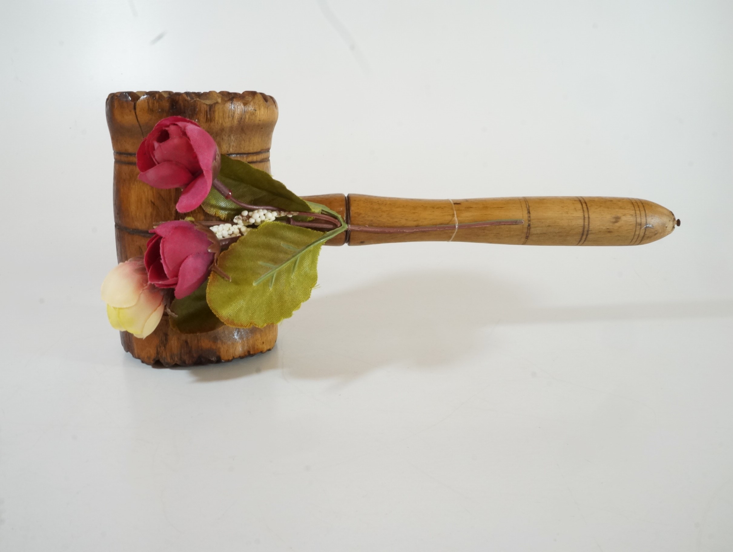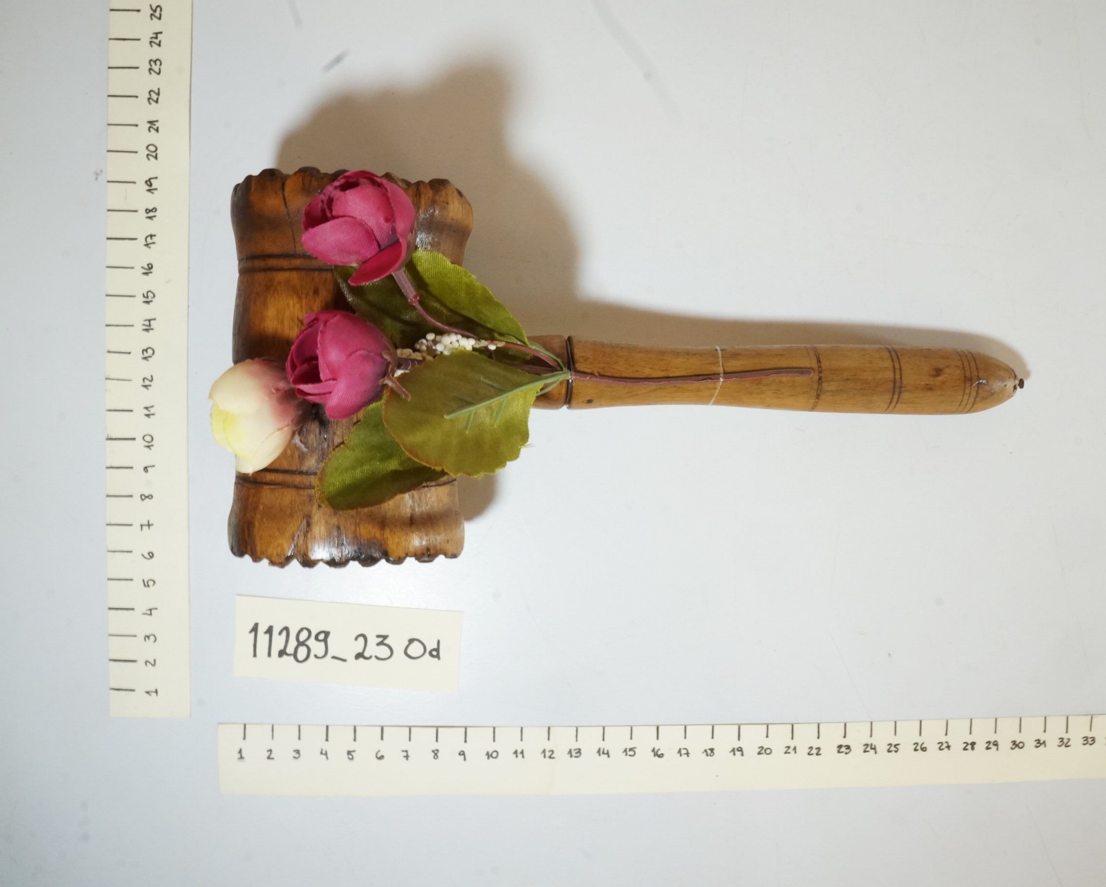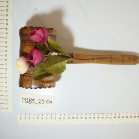 Objeto de madeira composto por cabo acoplado a um cilindro que possui, em suas faces, elevações e sulcos esculpidos na madeira e sulcos circulares decorativos. Ao cabo, prende-se um enfeite composto por duas flores cor de vinho e uma amarelada, três folhas verdes e duas hastes com pontas brancas.