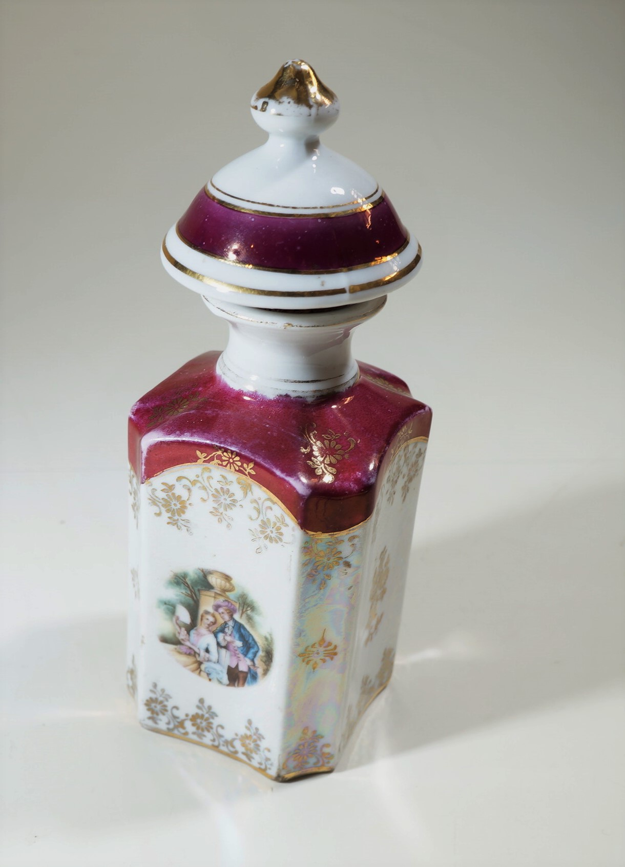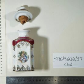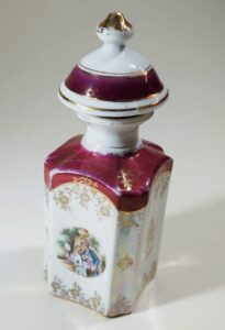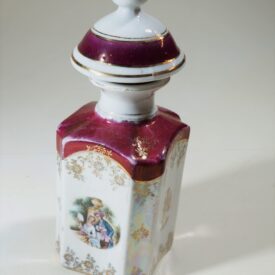 Frasco para perfume de porcelana, com tampa. Corpo com forma hexagonal; predominância da cor branca com padrões dourados. Parte superior e tampa em bordô com detalhes em dourado. Tampa com um pomo dourado no topo, combinando com o estilo da parte superior. Ilustração em um dos lados do frasco de uma cena com uma mulher e um homem em trajes históricos remetendo à nobreza, em um cenário paisagístico.