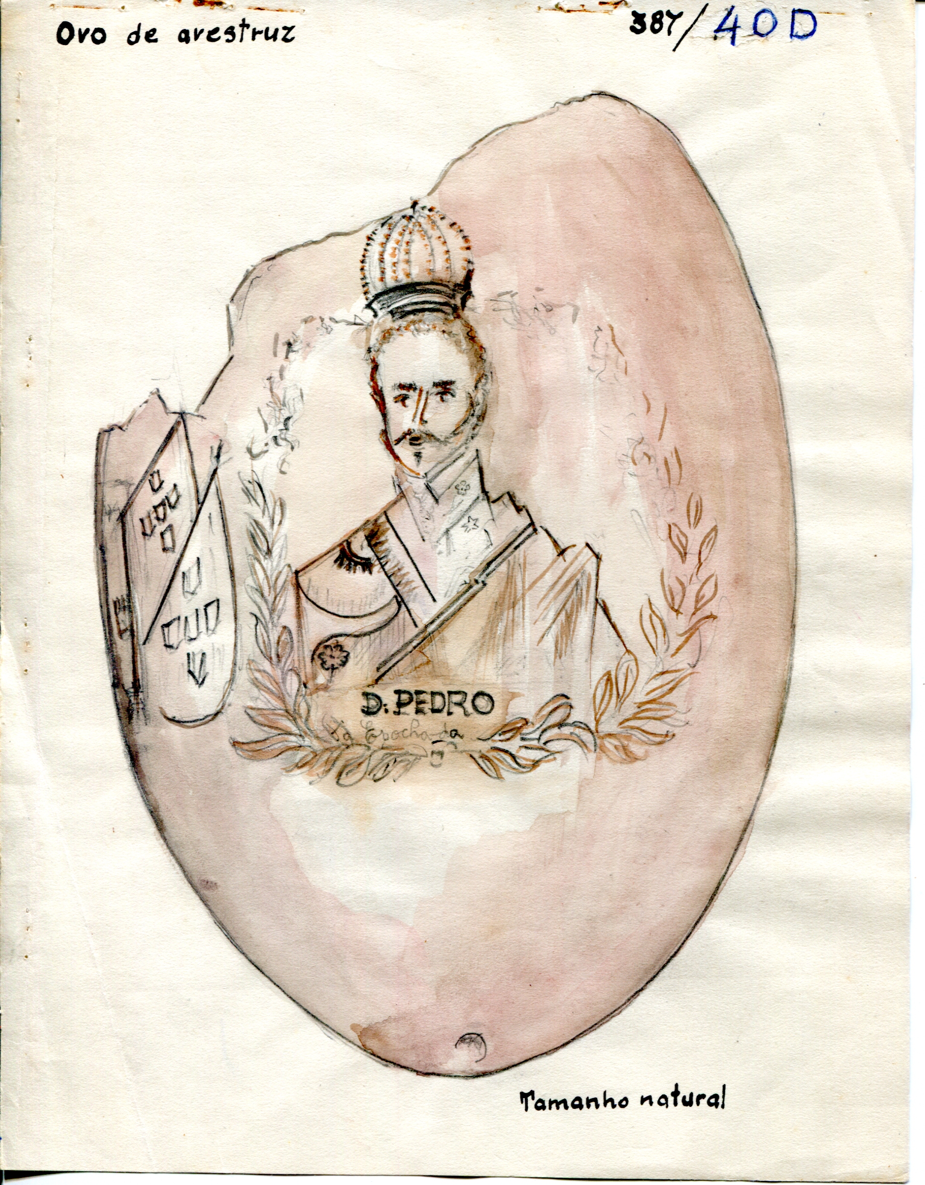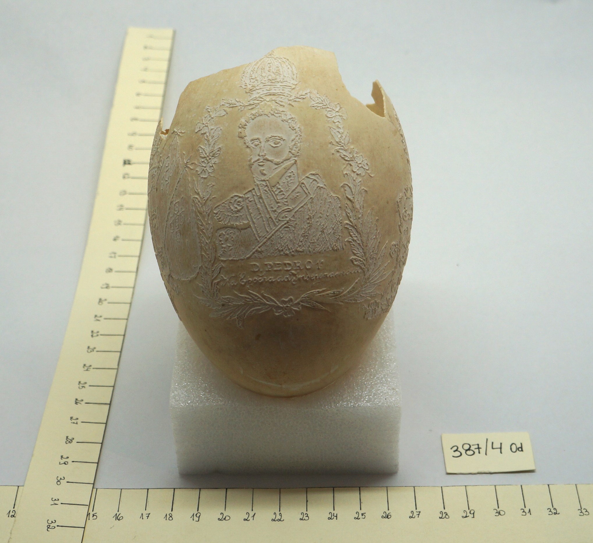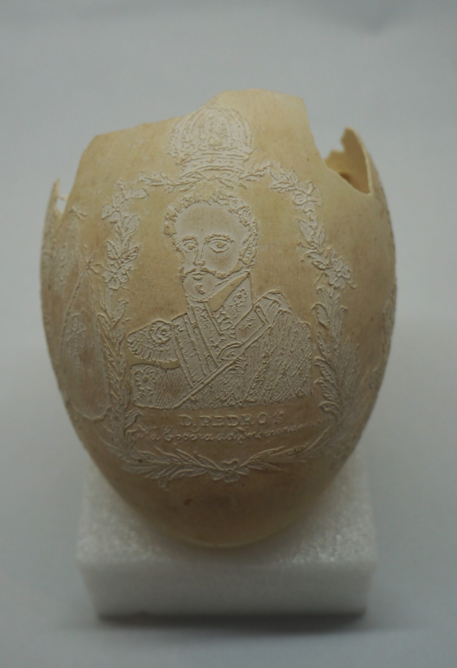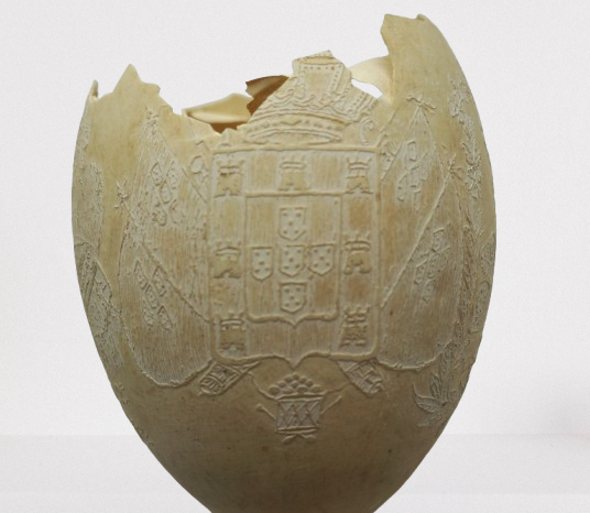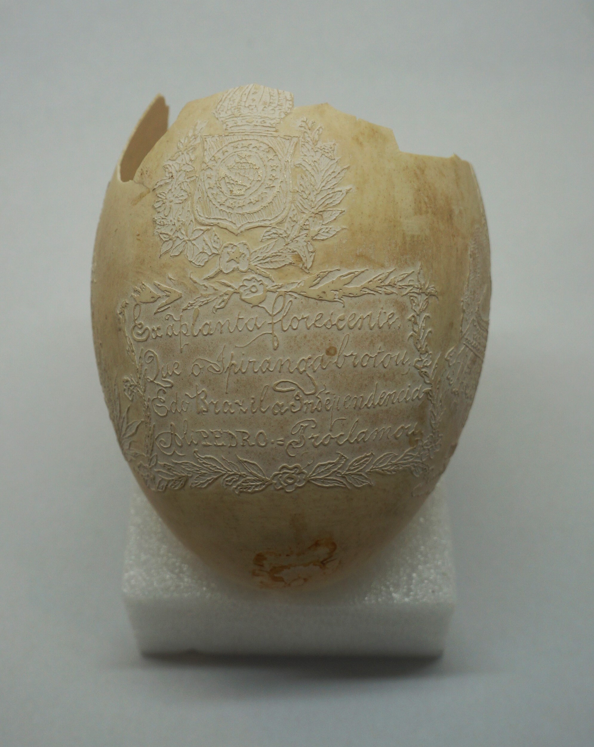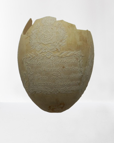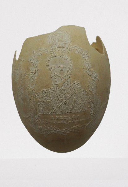 Por um processo químico, foram feitos vários desenhos (traços em relevo) sobre a casca do ovo. Cabeça de mulher com o dístico "D. Maria 2ª, Rainha de Portugal", tendo ao lado as armas da Coroa Portuguesa; cabeça de homem com a legenda "D. Pedro 1º na Época da Independência". Vê-se ainda o escudo do Império do Brasil tendo embaixo, emoldurado de flores, a quadrinha "Exãplanta florescente,/Que o Ipiranga brotou,/E do Brazil a Independência/Ali PEDRO a proclamou".