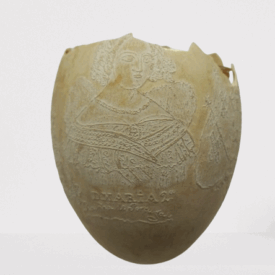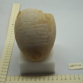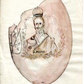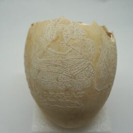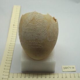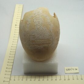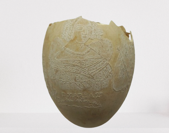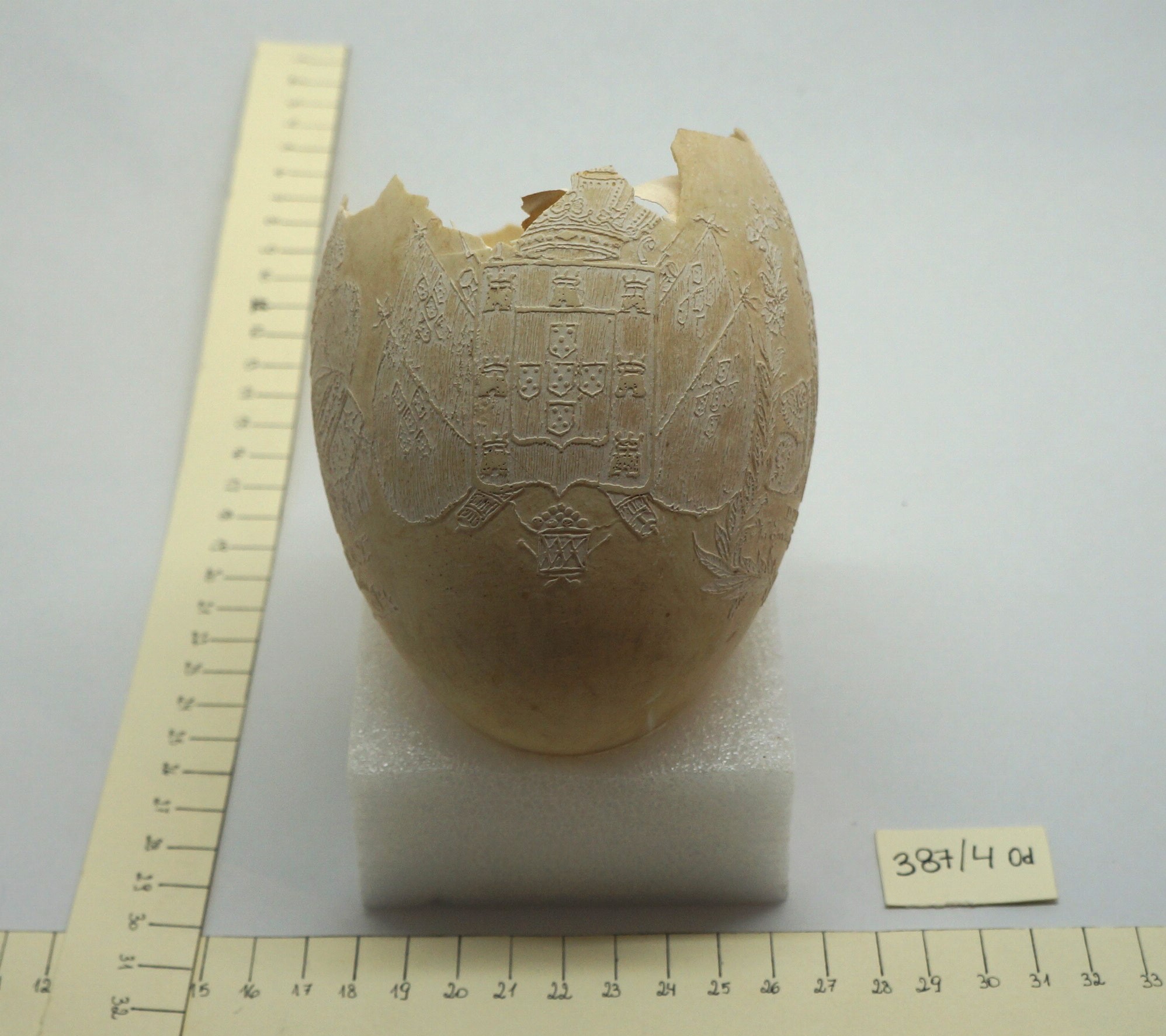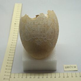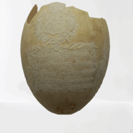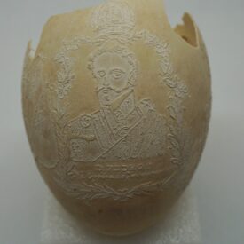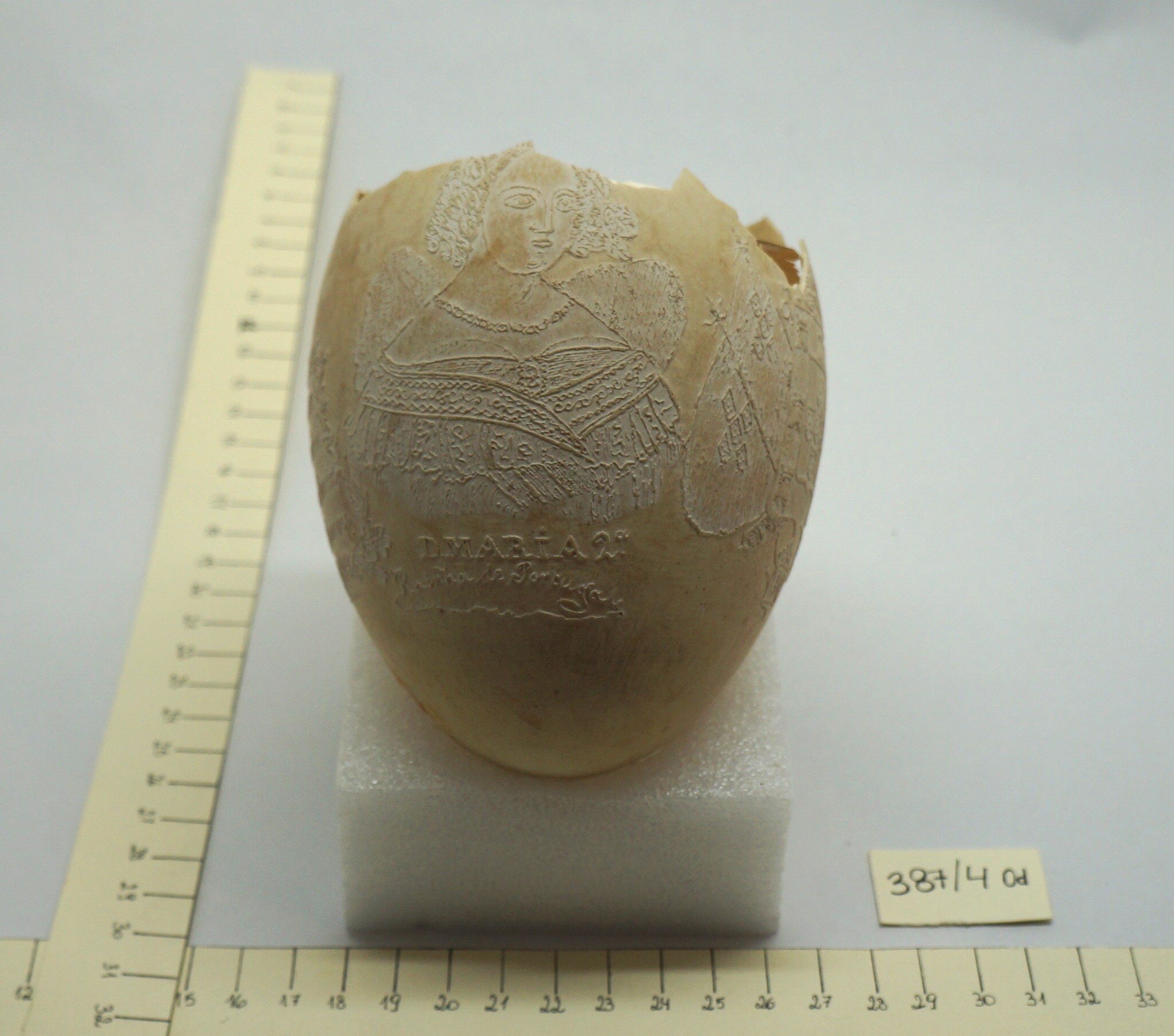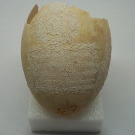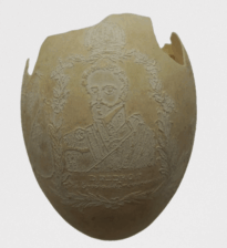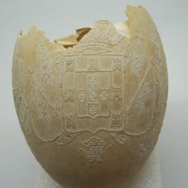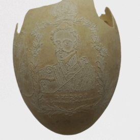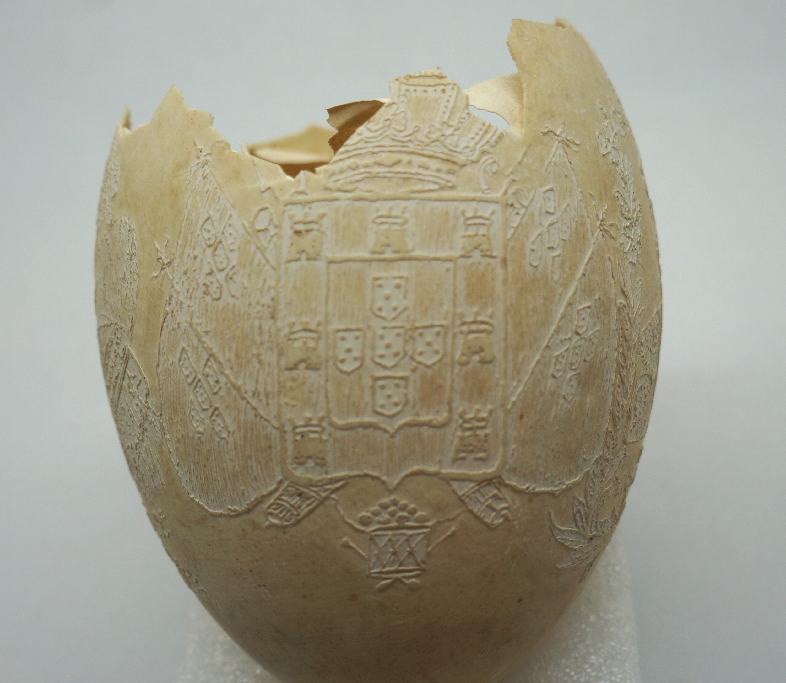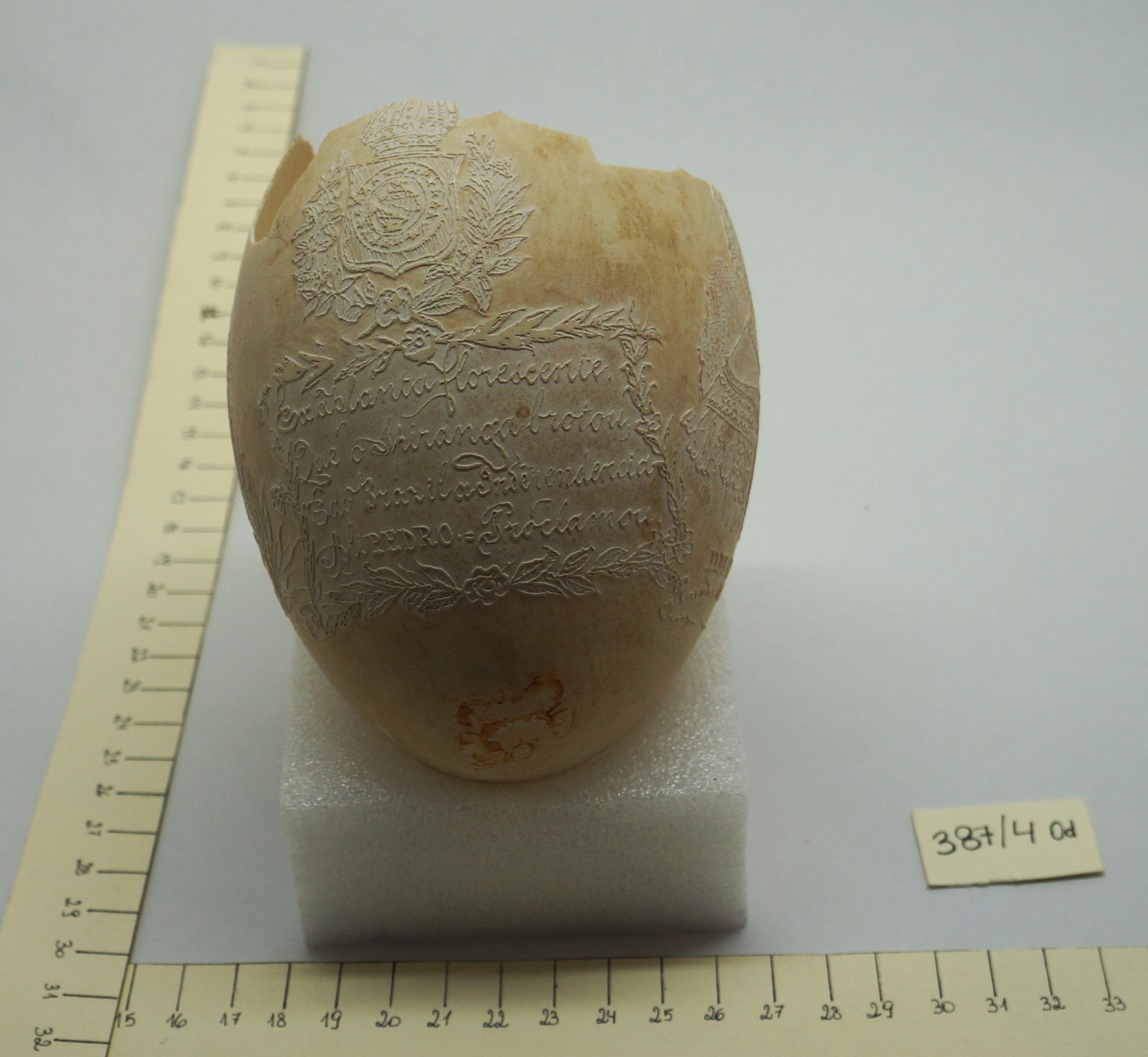 Por um processo químico, foram feitos vários desenhos (traços em relevo) sobre a casca do ovo. Cabeça de mulher com o dístico "D. Maria 2ª, Rainha de Portugal", tendo ao lado as armas da Coroa Portuguesa; cabeça de homem com a legenda "D. Pedro 1º na Época da Independência". Vê-se ainda o escudo do Império do Brasil tendo embaixo, emoldurado de flores, a quadrinha "Exãplanta florescente,/Que o Ipiranga brotou,/E do Brazil a Independência/Ali PEDRO a proclamou".