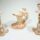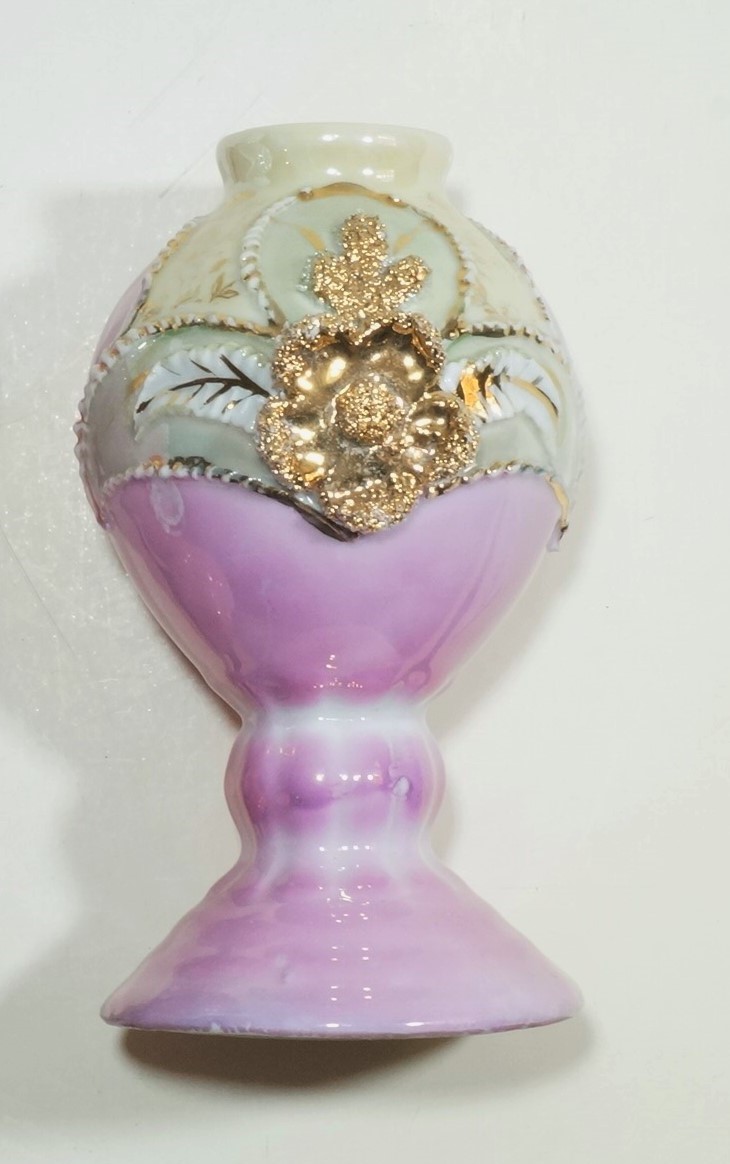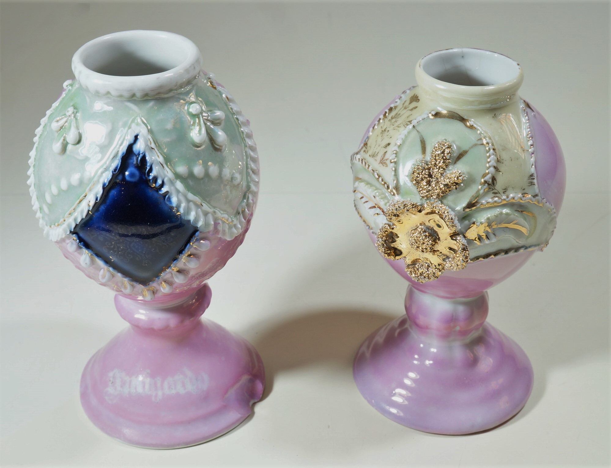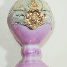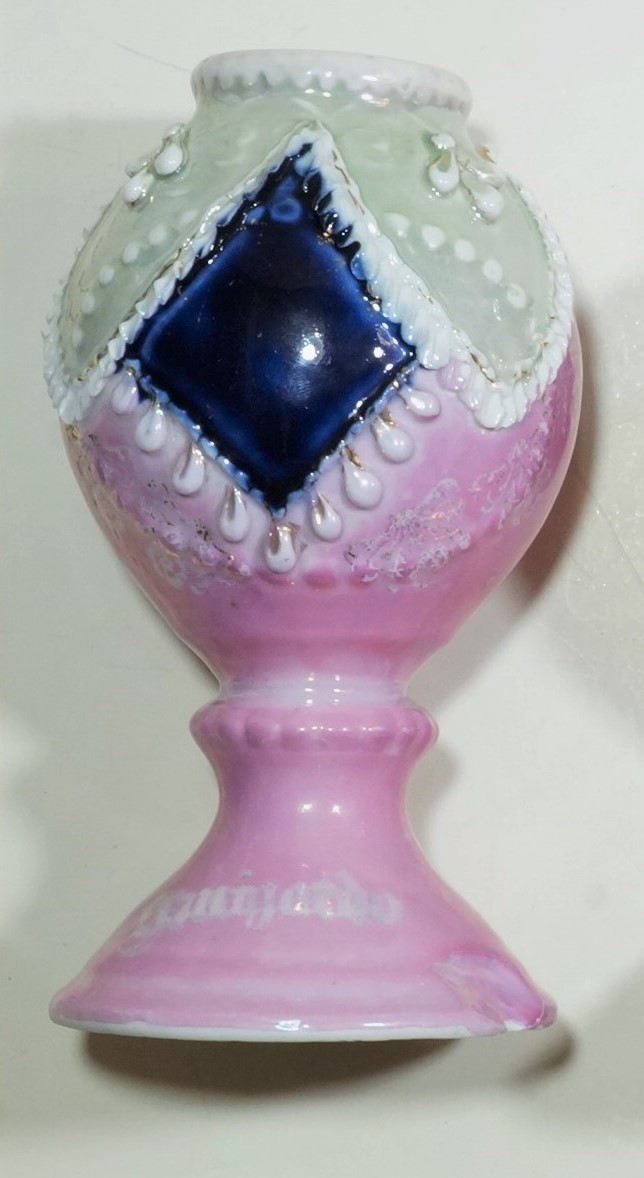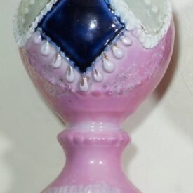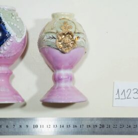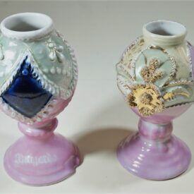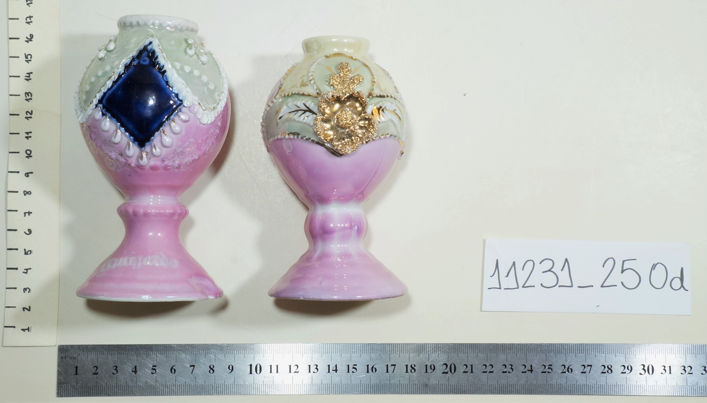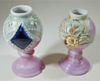 Vasos na cor rosa, com decoração verde e detalhes em branco e dourado. O objeto maior possui um detalhe em azul, formato semelhante a um losango. O segundo objeto, menor, possui uma flor dourada como elemento de sua decoração e o número 76 escrito do lado interno da base.