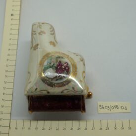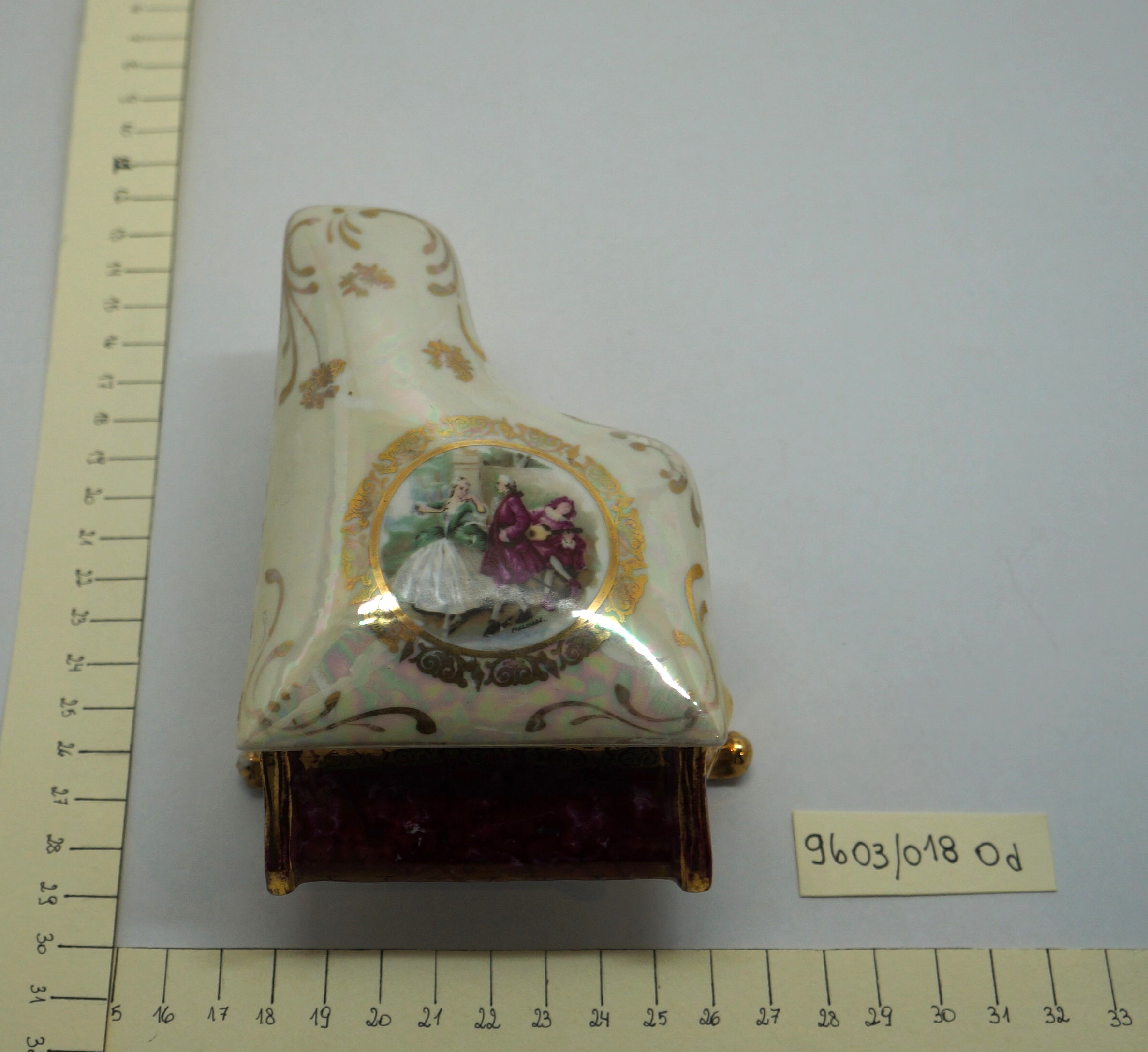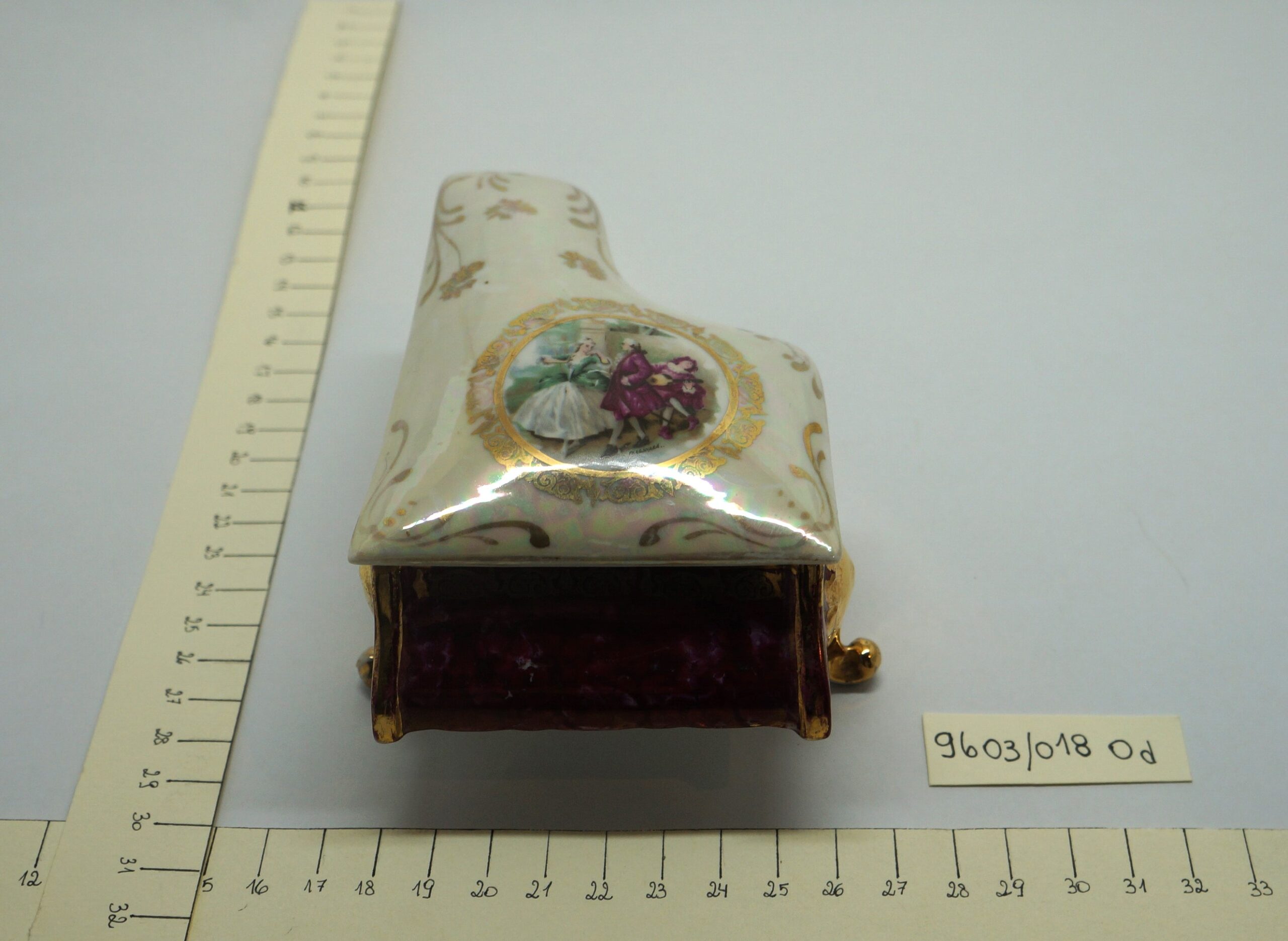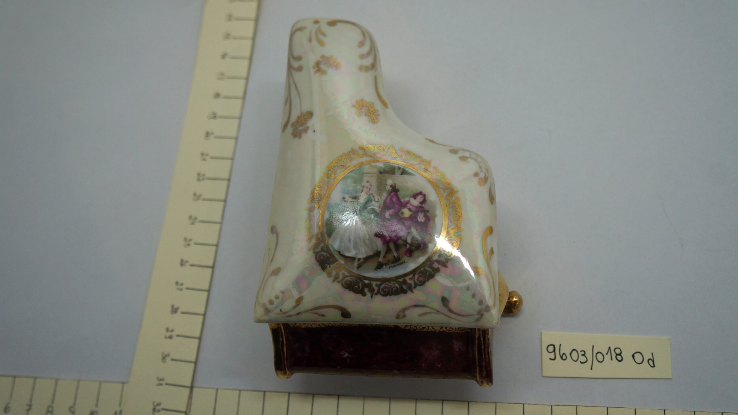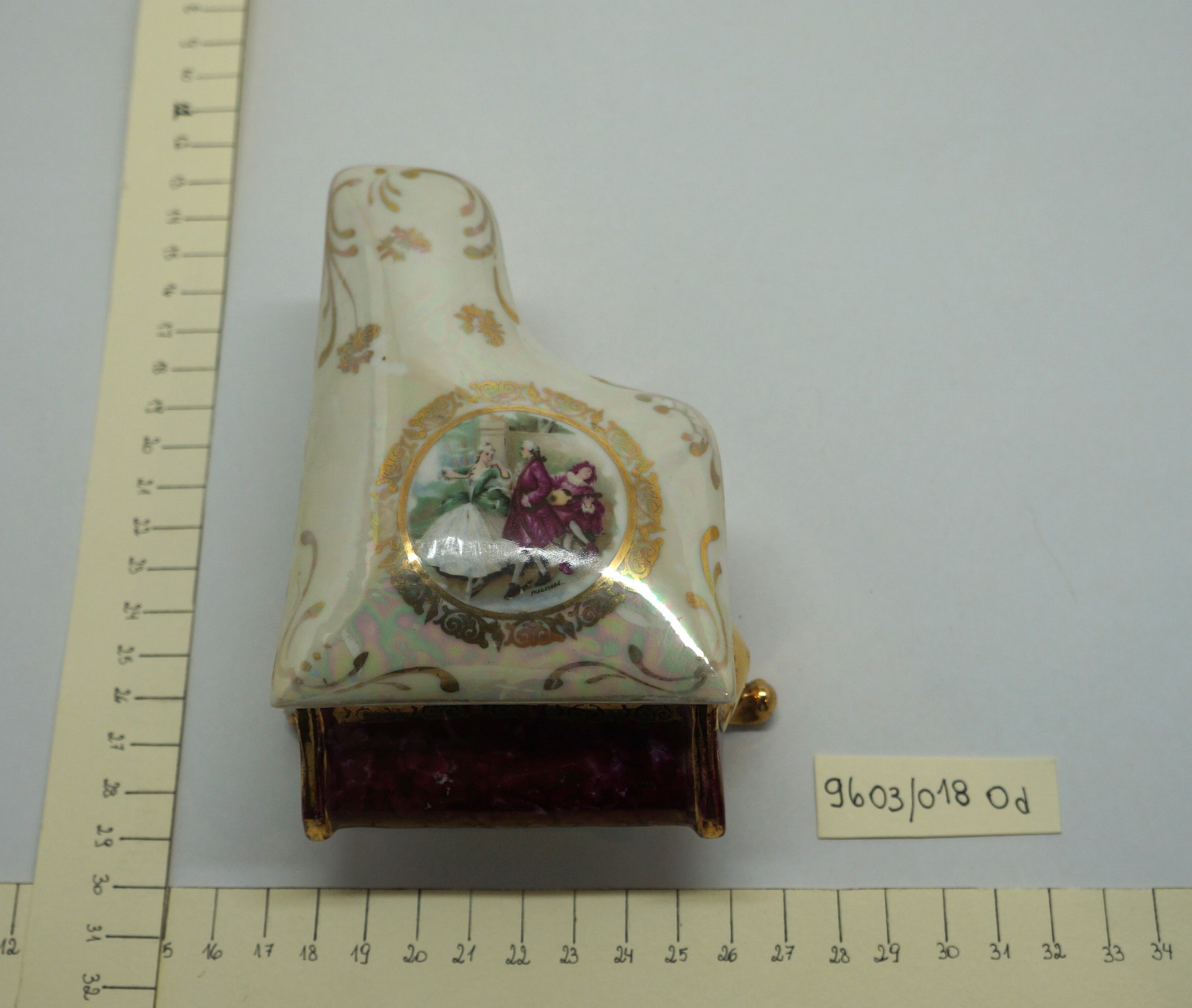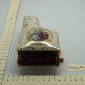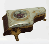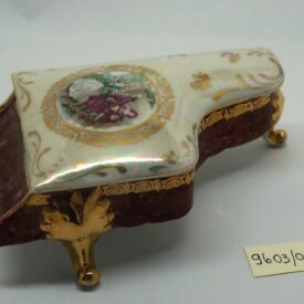 Porta-joia em forma de piano de cauda, pintado de bordô arrematado por um friso dourado em arabescos e um friso dourado liso, parte interna na cor branca; três pés recurvos em dourado. Tampa em formato de piano de cauda, em porcelana multicolorida com arabescos dourados. Na parte mais larga, um círculo em arabescos dourados com uma cena do século XVIII, um casal, rapaz com vestes cor de vinho e moça com traje nas cores verde e branco. Na parte de trás, um tocador de alaúde com vestes na cor bordô.
