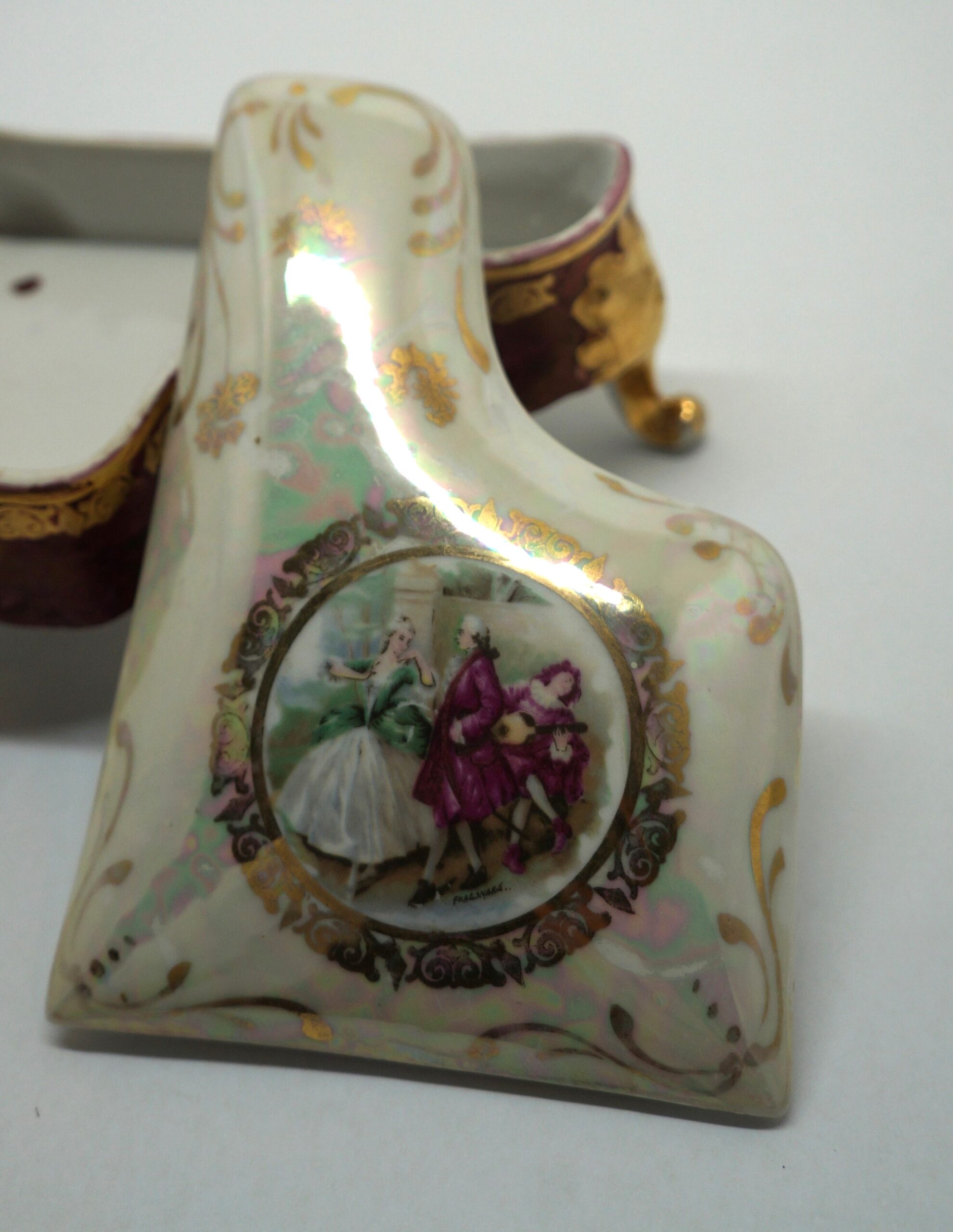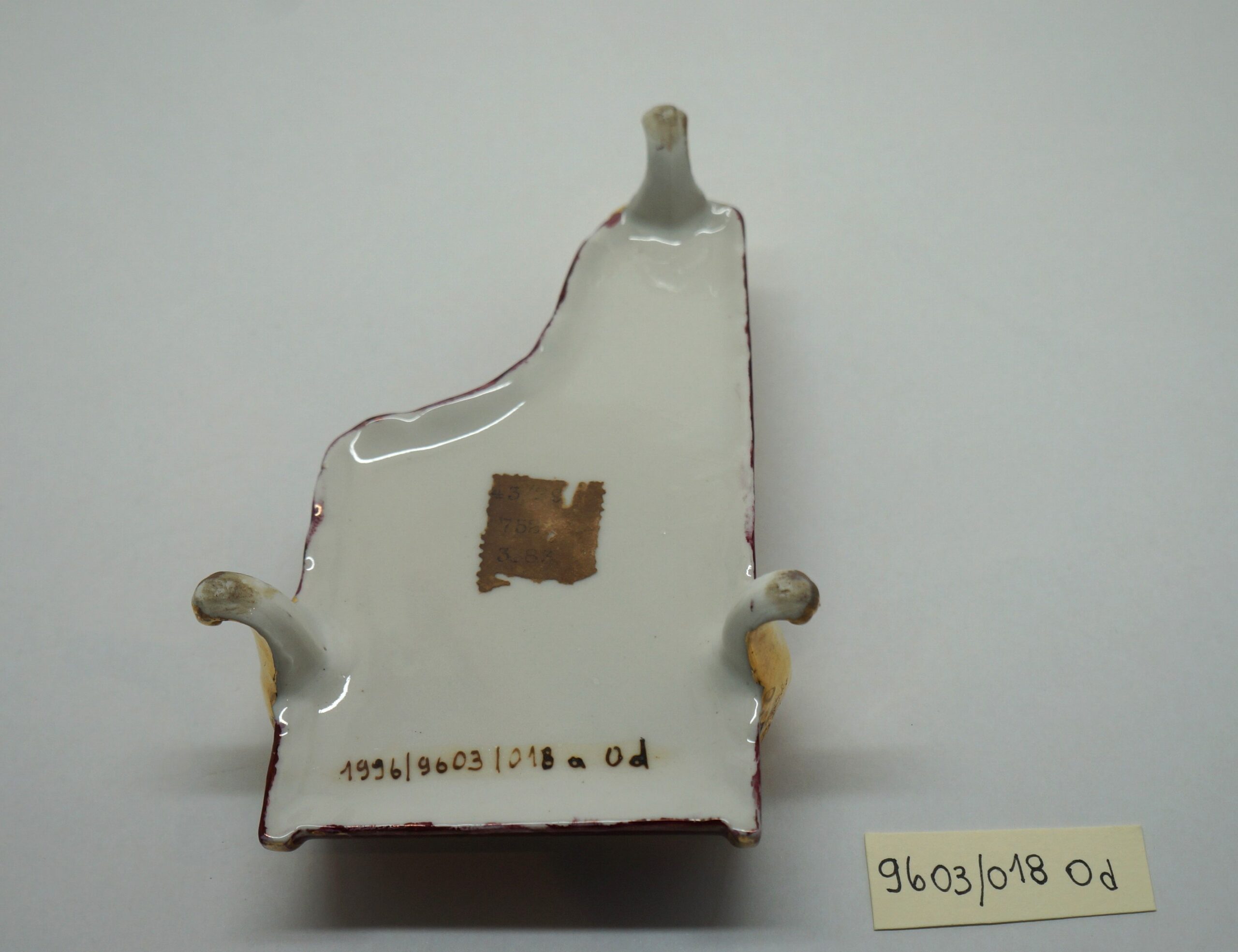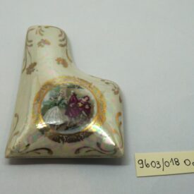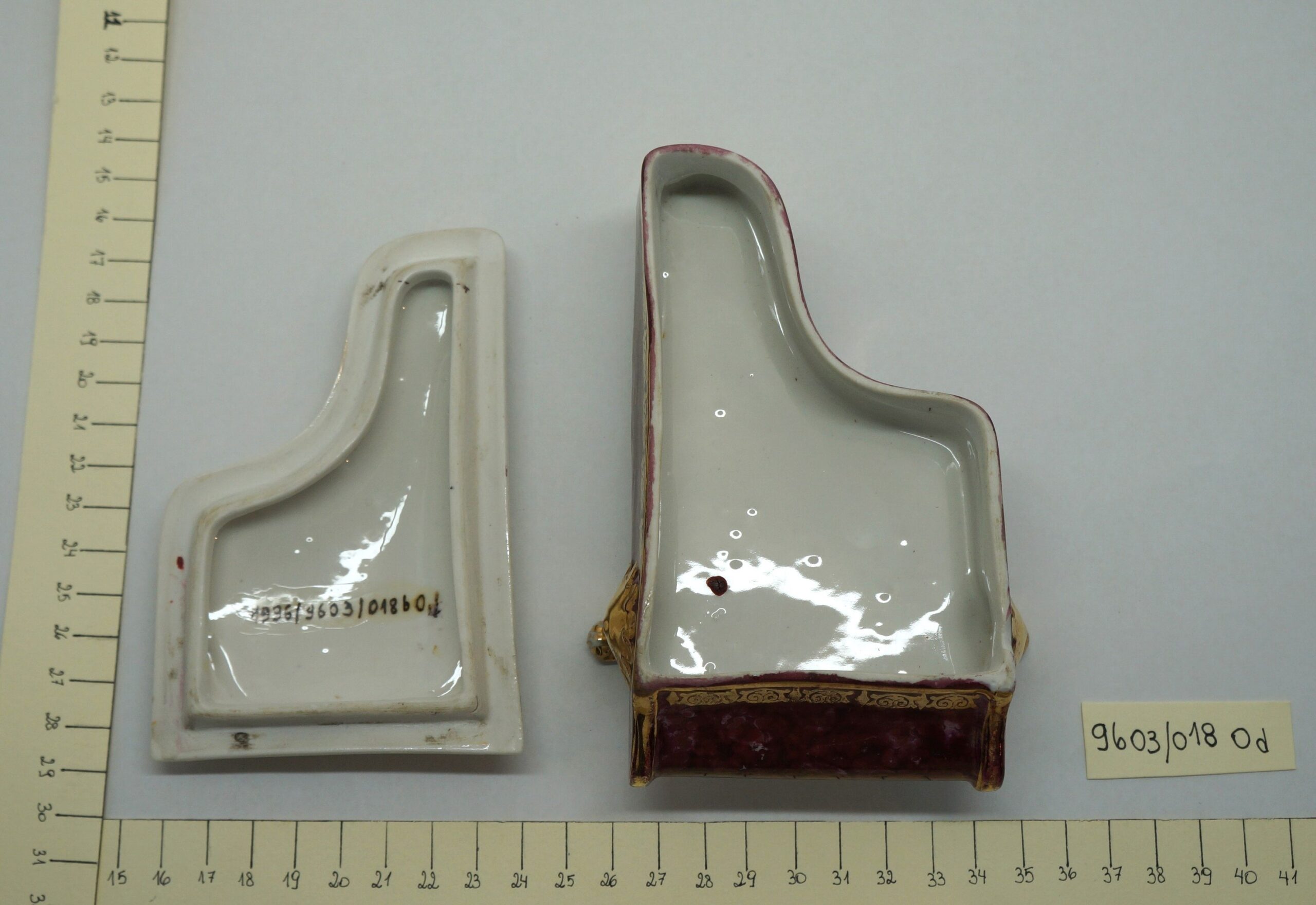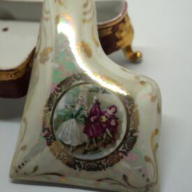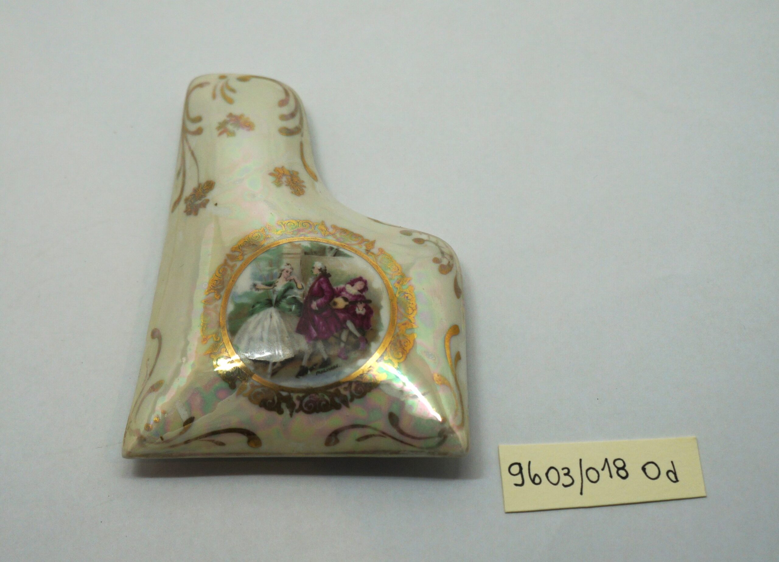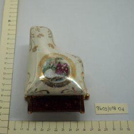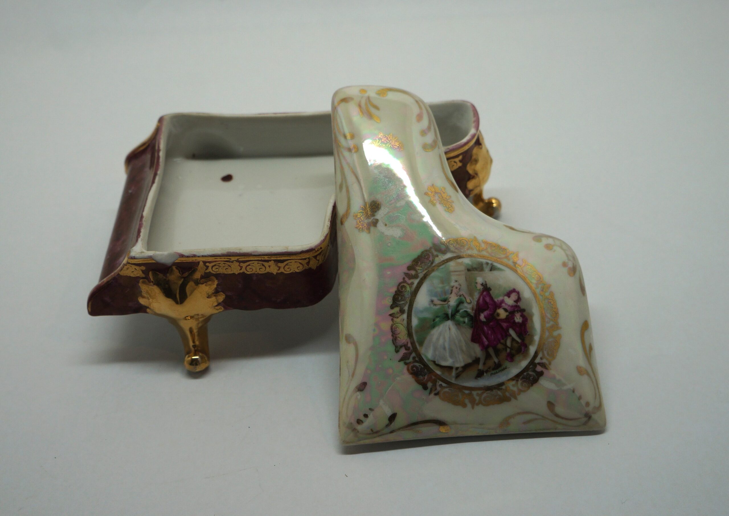 Porta-joia em forma de piano de cauda, pintado de bordô arrematado por um friso dourado em arabescos e um friso dourado liso, parte interna na cor branca; três pés recurvos em dourado. Tampa em formato de piano de cauda, em porcelana multicolorida com arabescos dourados. Na parte mais larga, um círculo em arabescos dourados com uma cena do século XVIII, um casal, rapaz com vestes cor de vinho e moça com traje nas cores verde e branco. Na parte de trás, um tocador de alaúde com vestes na cor bordô.