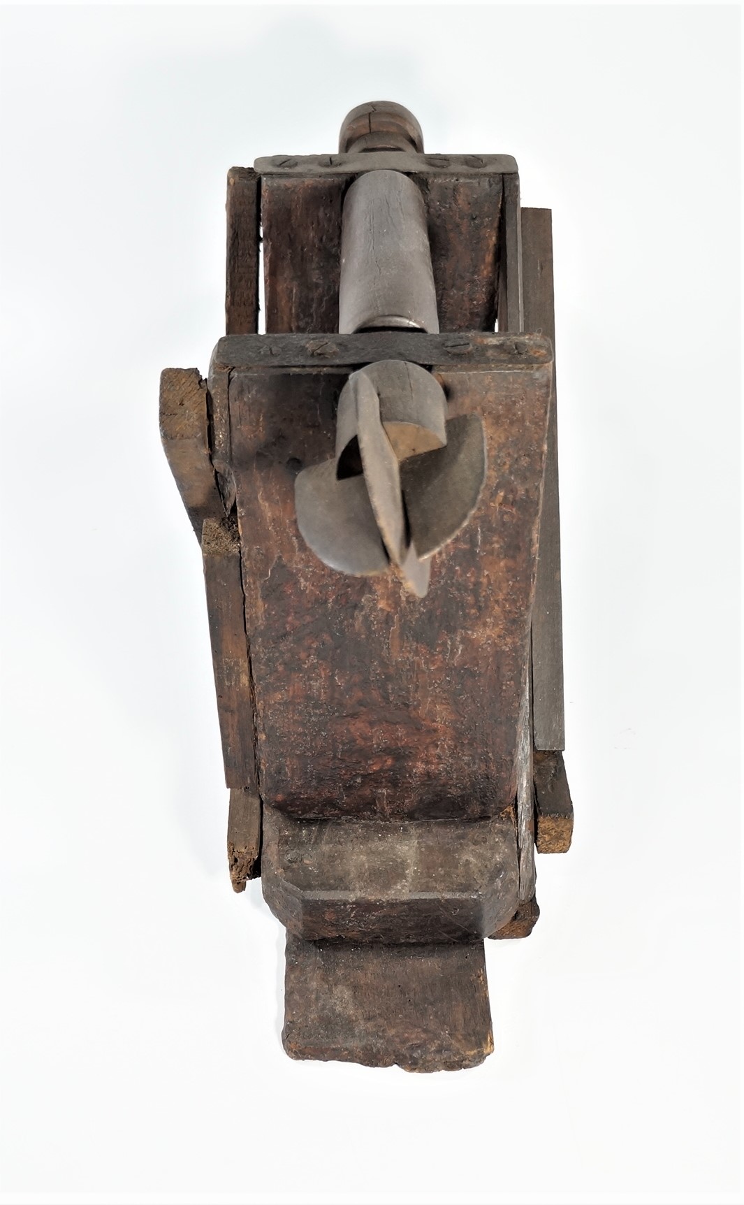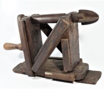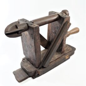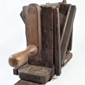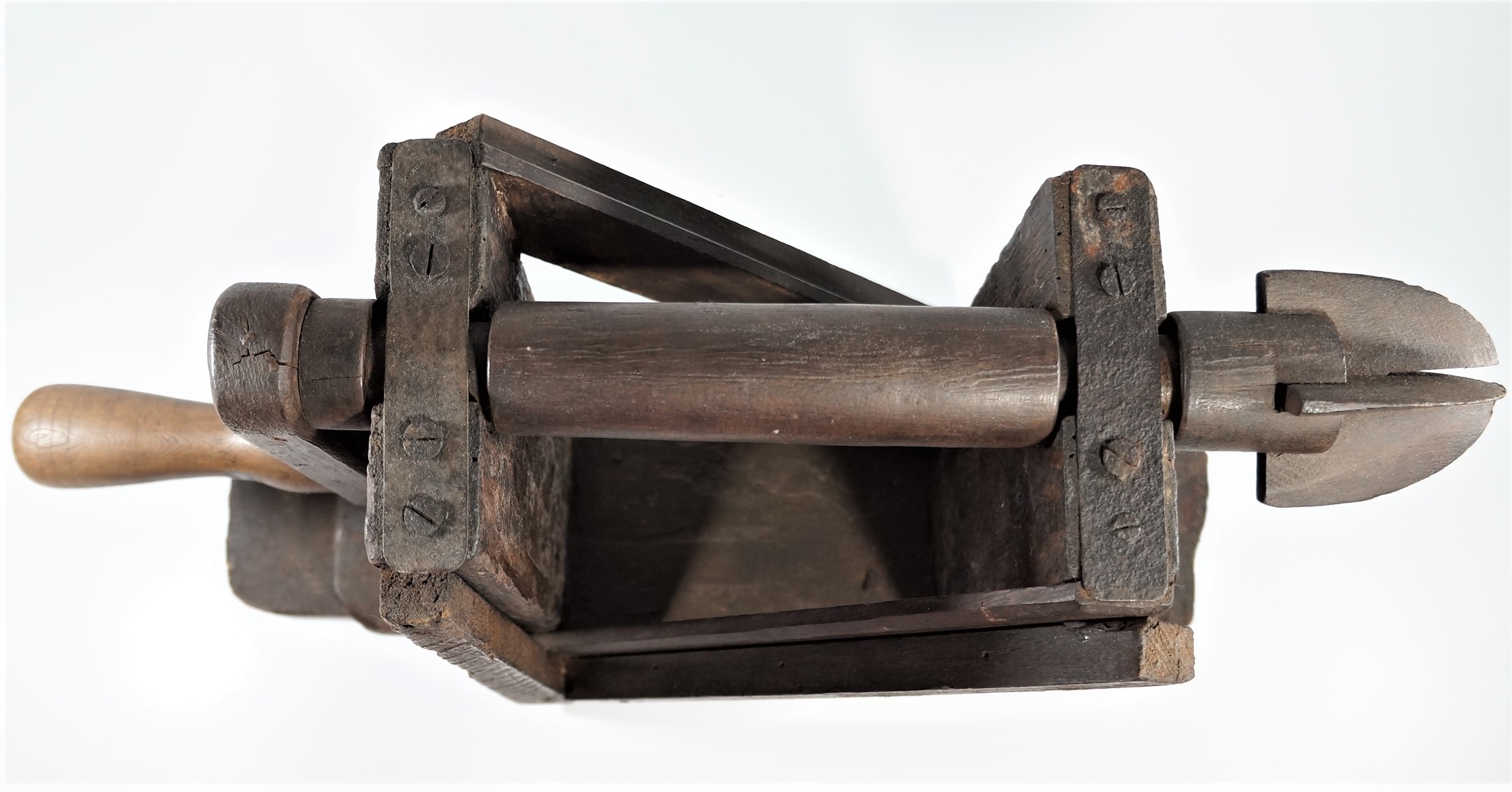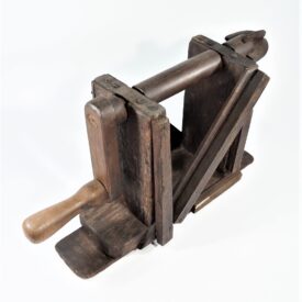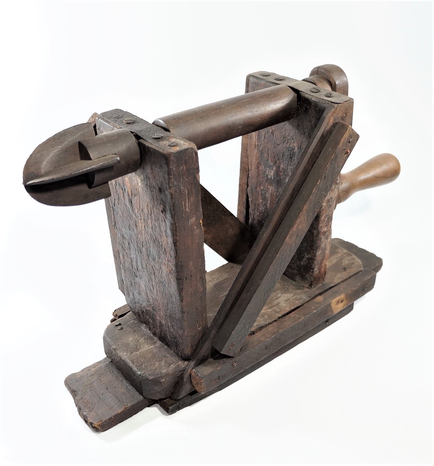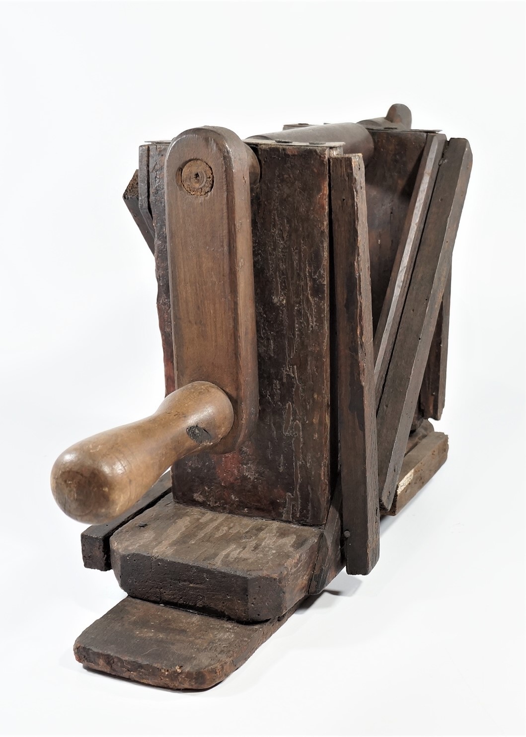 Armação de madeira que sustenta um cilindro móvel, com uma manivela em um lado e no outro duas lâminas entalhadas que se encaixam formando quatro pás arredondadas onde se colocava a meia laranja. A manivela movimenta o conjunto, enquanto duas tiras metálicas parafusadas na parte superior impedem que o cilindro se desprenda do encaixe.