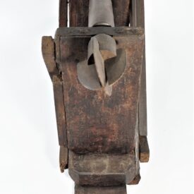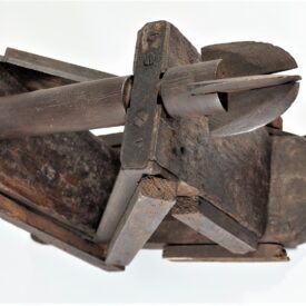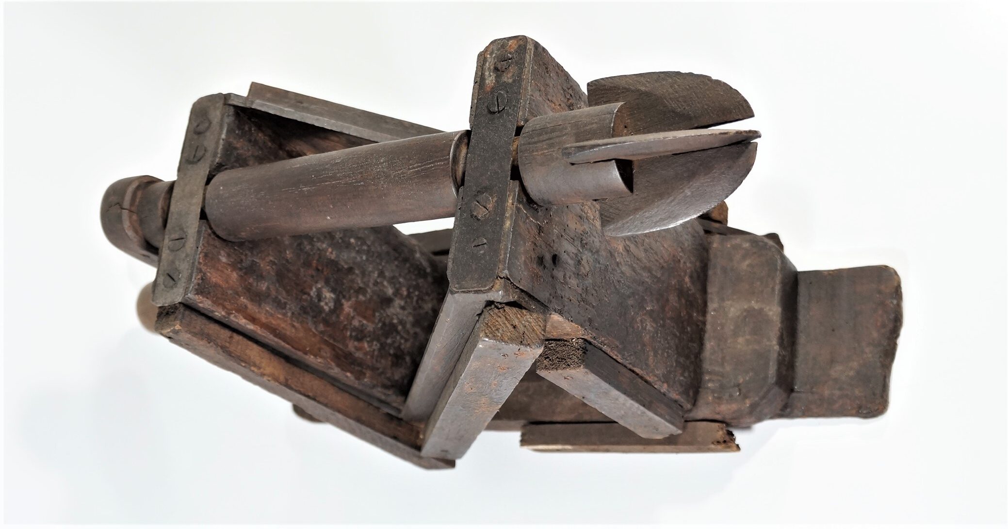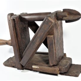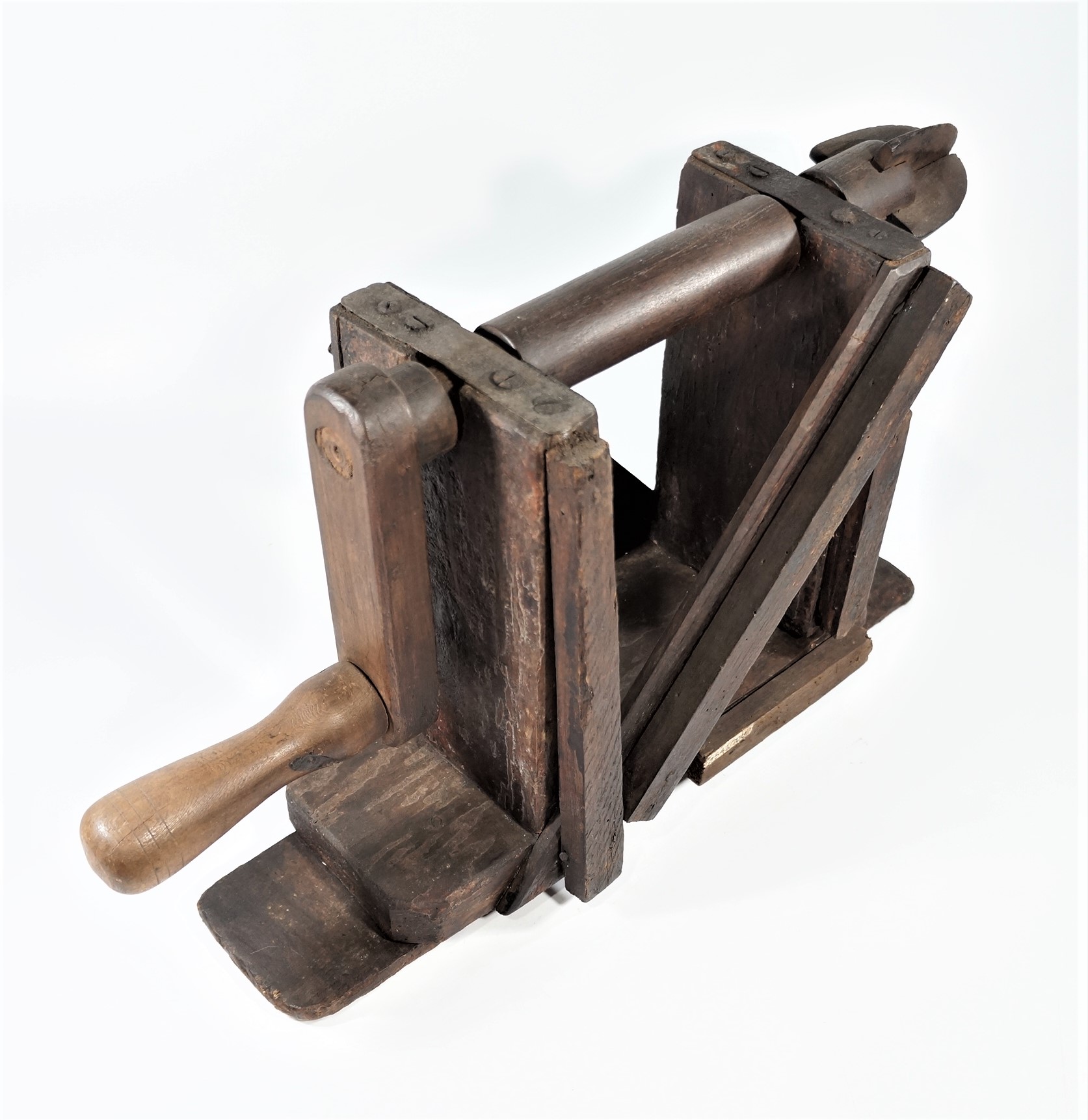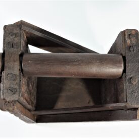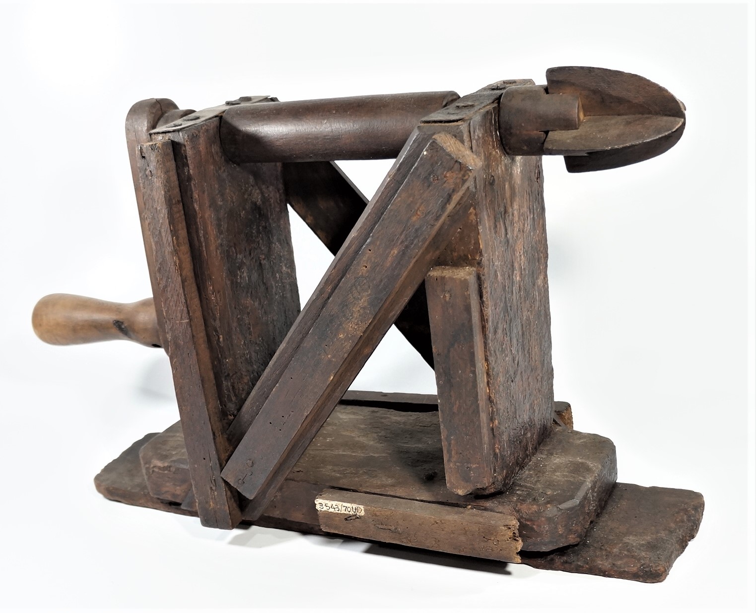 Armação de madeira que sustenta um cilindro móvel, com uma manivela em um lado e no outro duas lâminas entalhadas que se encaixam formando quatro pás arredondadas onde se colocava a meia laranja. A manivela movimenta o conjunto, enquanto duas tiras metálicas parafusadas na parte superior impedem que o cilindro se desprenda do encaixe.