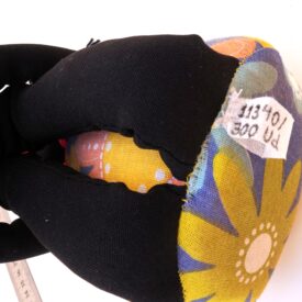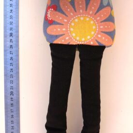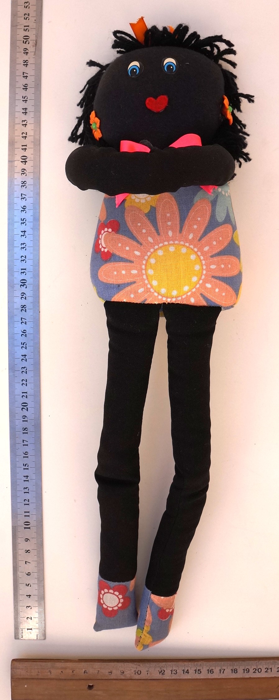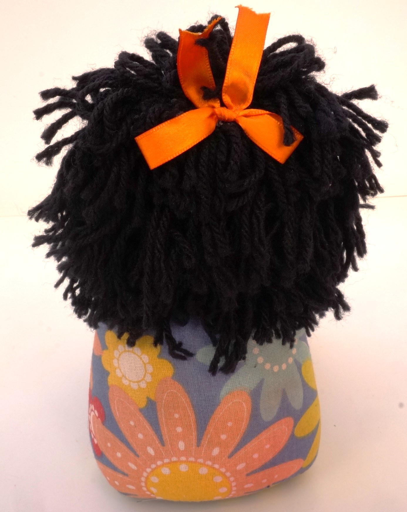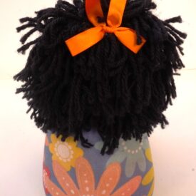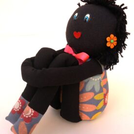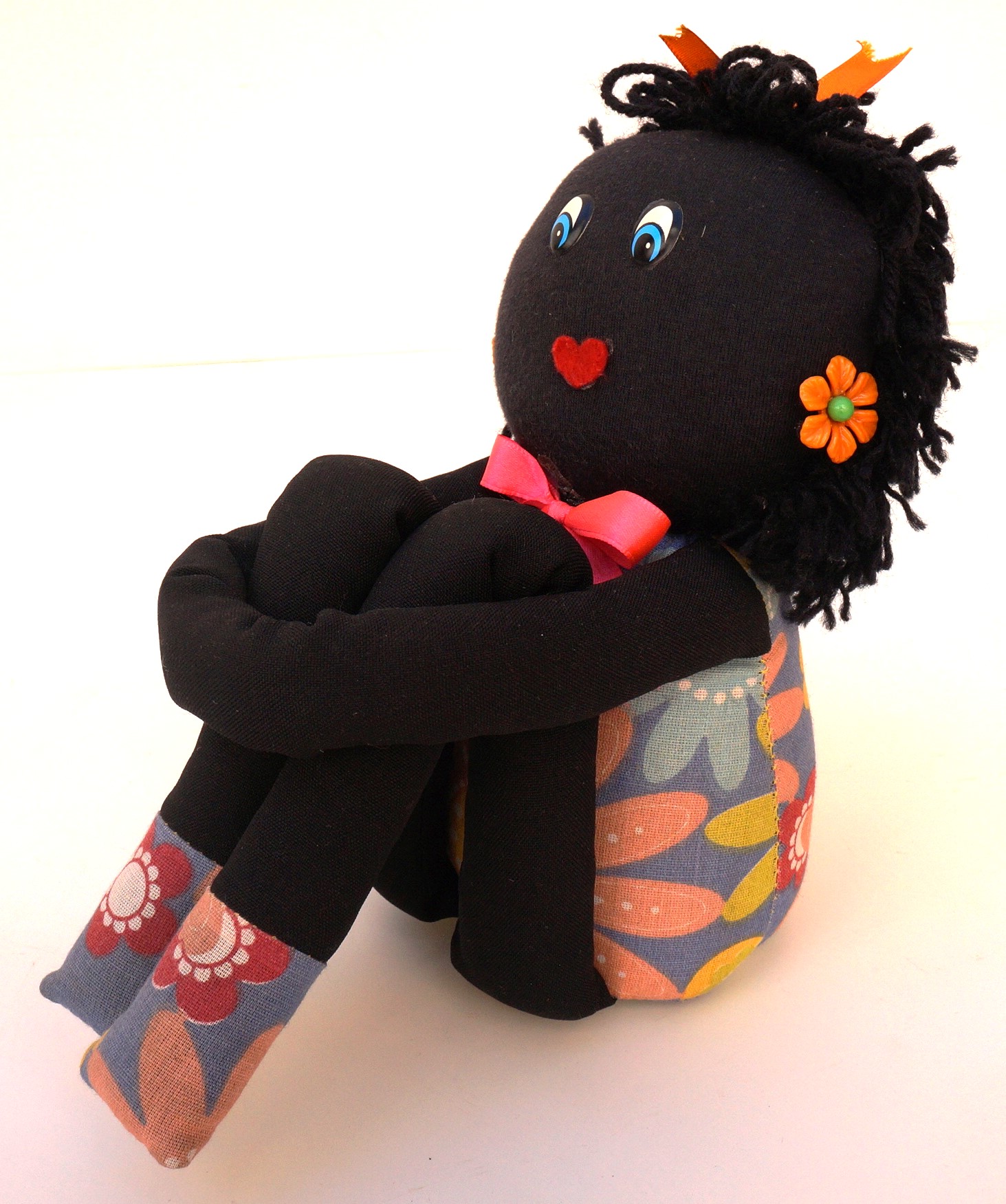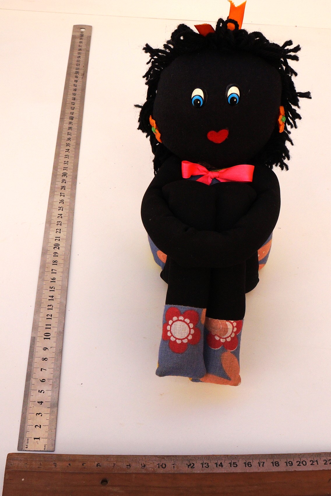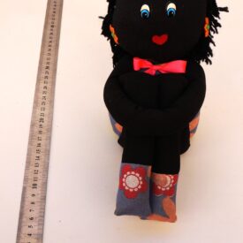 Peso de porta que imita uma boneca de pano. Ela é feita de tecido preto e possui cabelos de fios de lã preta. Ela possui dois olhos azuis de plástico e uma boca vermelha de feltro. Ela usa um vestido azul com flores coloridas, adornado com um laço de cetim rosa choque. Seus acessórios são dois brincos de plástico, que imitam flores laranja, e um laço de cetim laranja. As pernas são compridas e calçam um sapato feito do mesmo tecido do vestido. Os braços são unidos em uma única faixa, feitos para encaixar as pernas em um abraço.