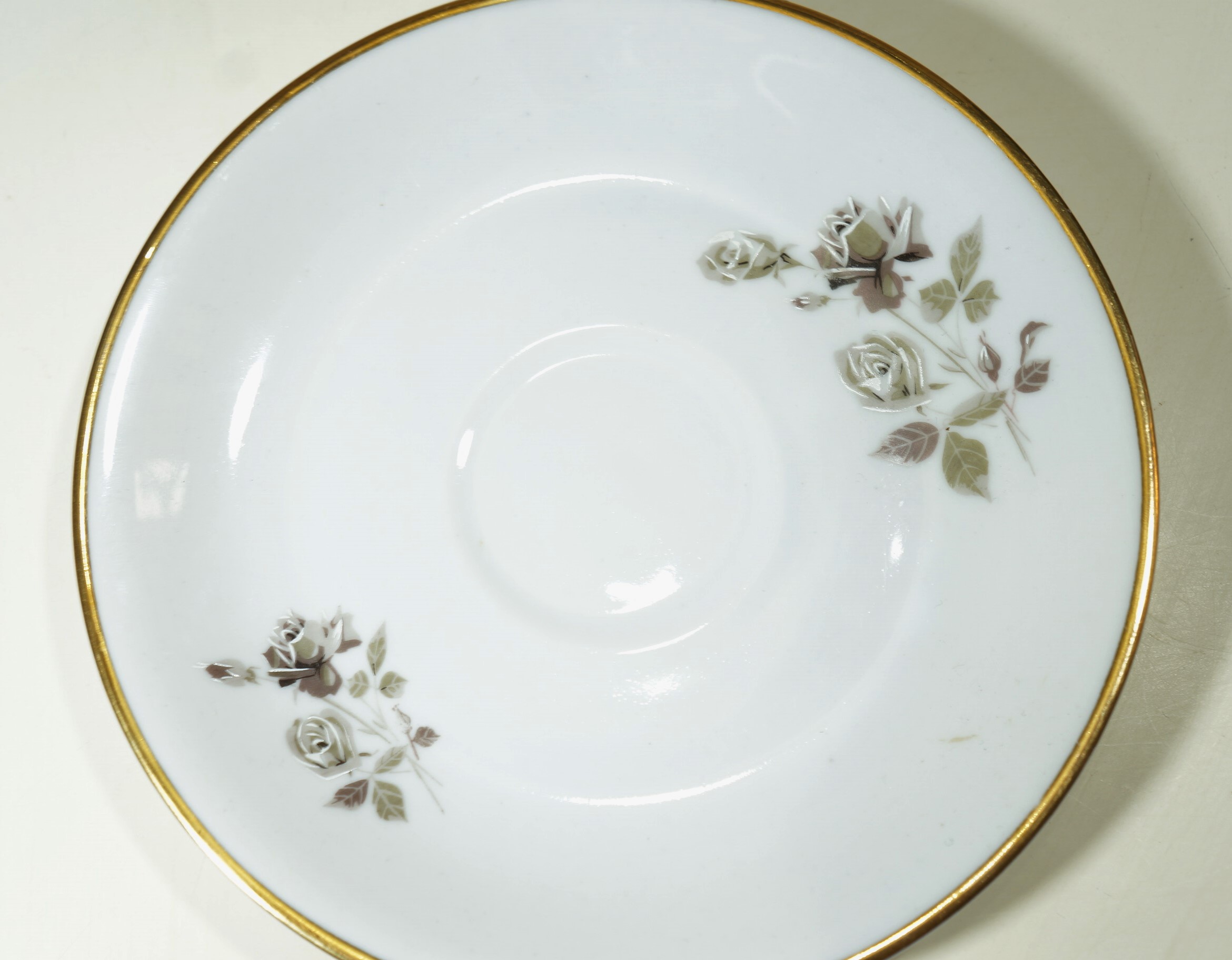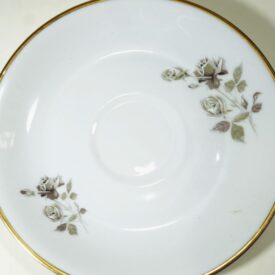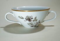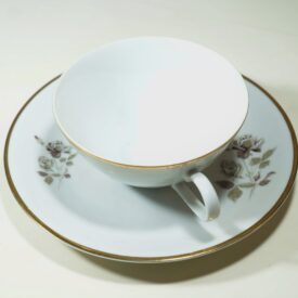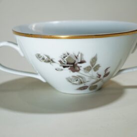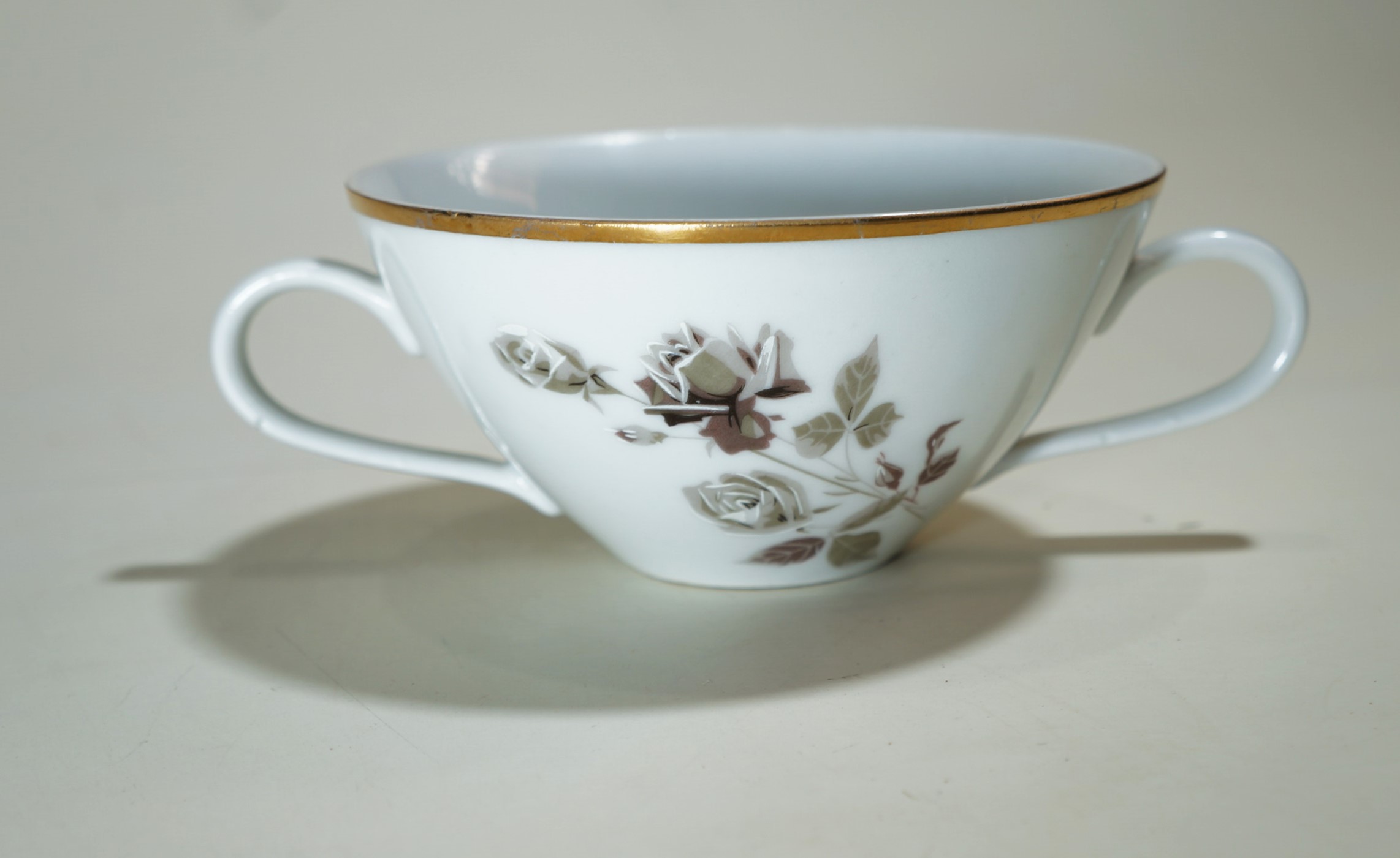 Conjunto de pires com xícara de alça dupla, da marca Porcelana Renner, conforme consta na base das peças. Objetos brancos com desenho floral com rosas em tons terrosos marrons e verdes. Xícara e pires adornados com borda dourada.