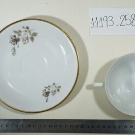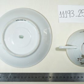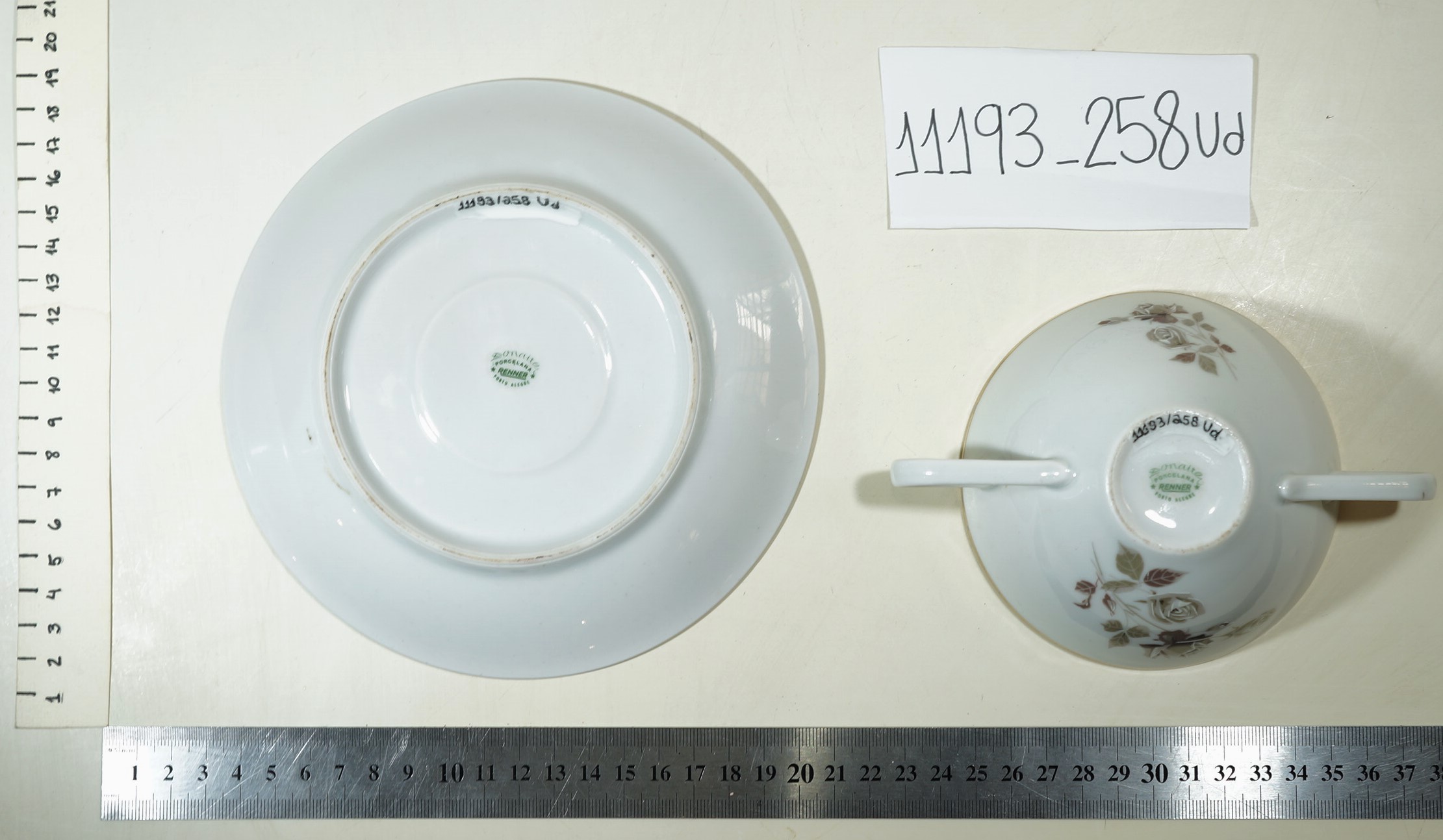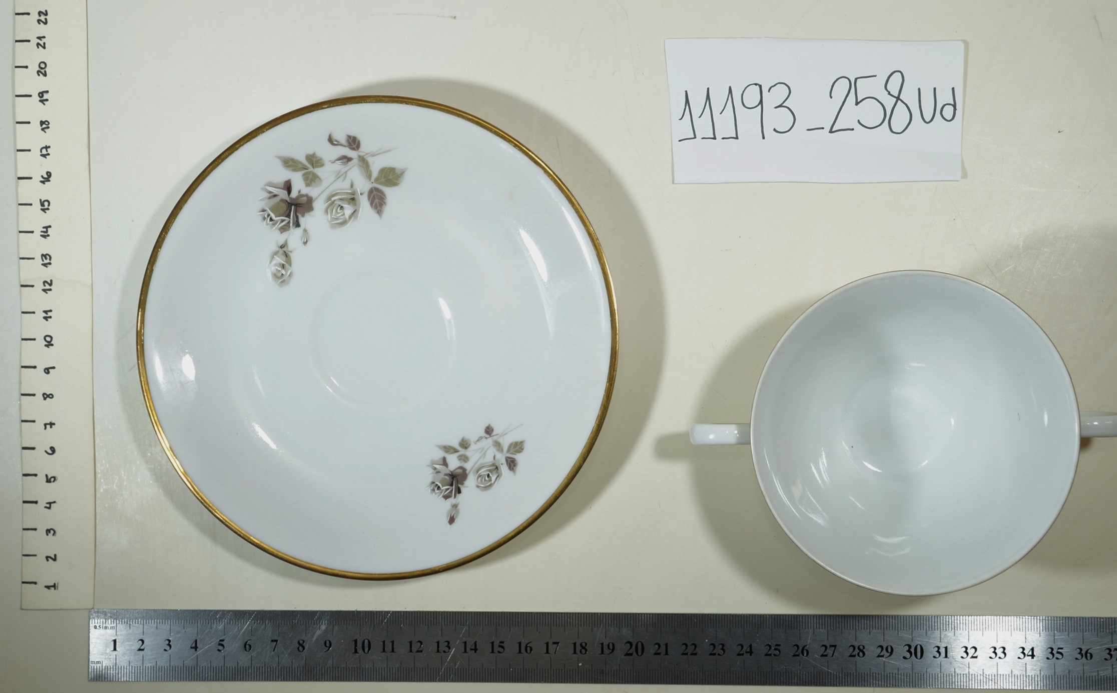 Comprimento 14,5 cm (da extremidade de uma taça à alça da outra); diâmetro 17 cm (pires)