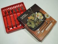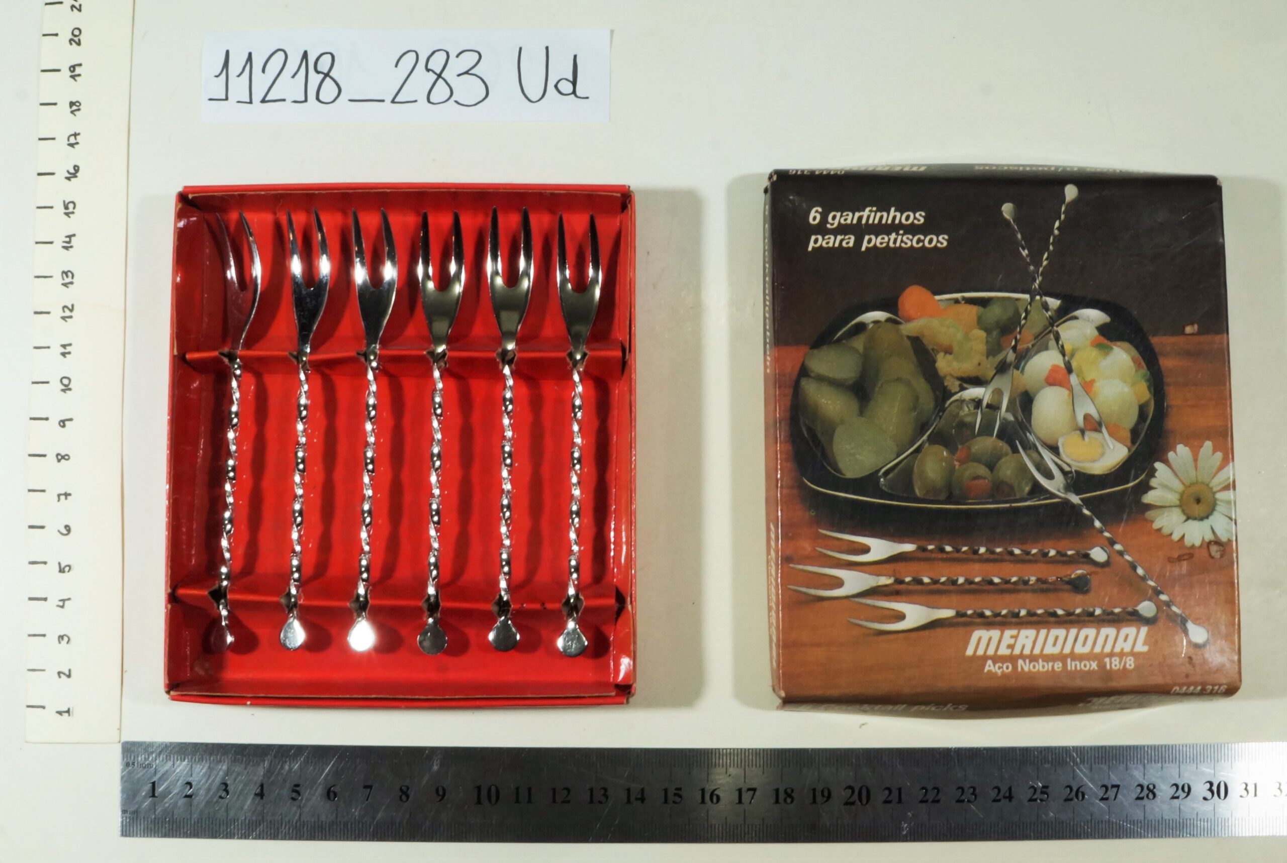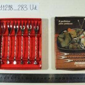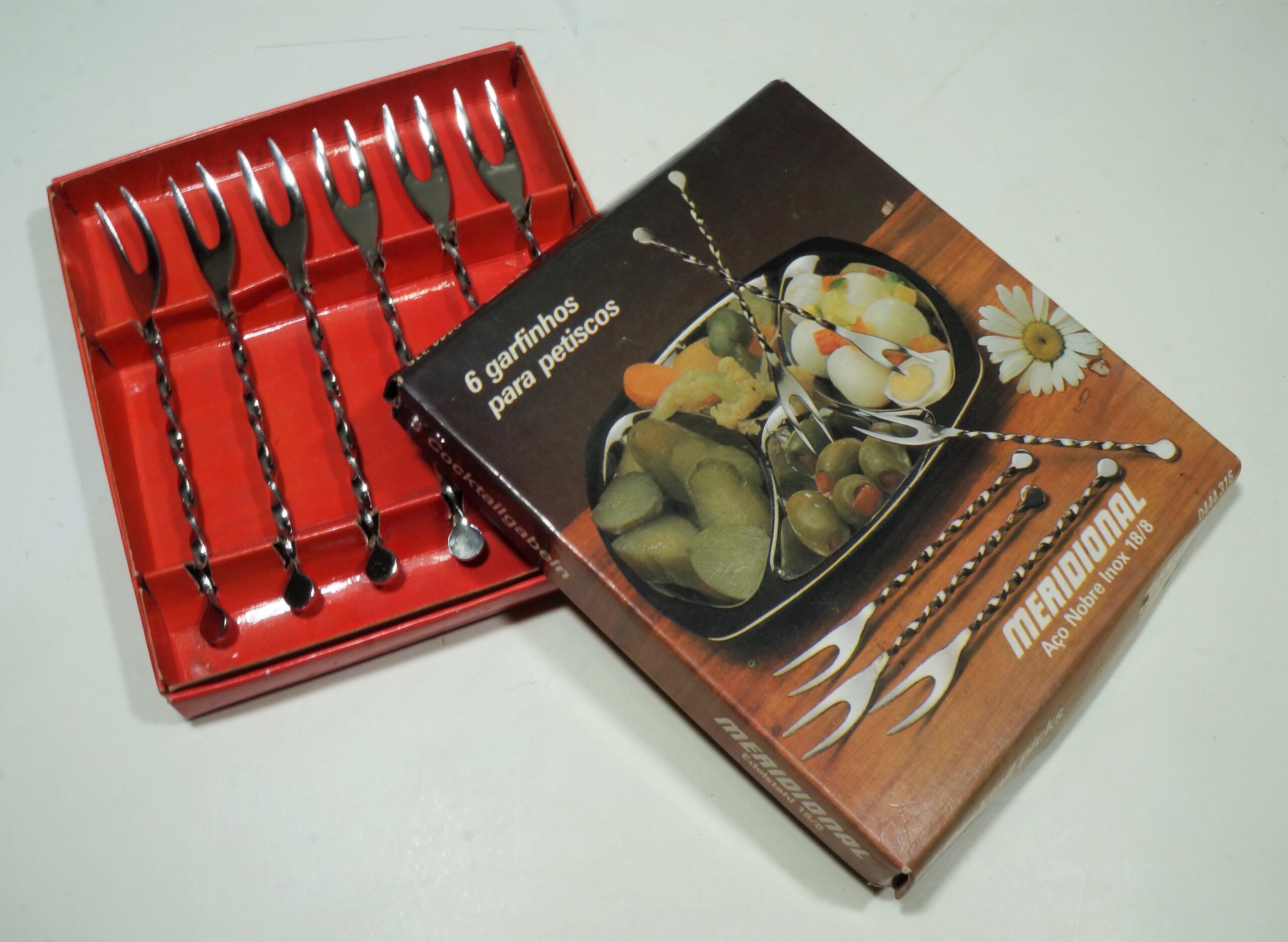 Conjunto de seis garfinhos de aço inox para petisco, de dois dentes cada, com cabo retorcido ( como um detalhe), acondicionados na caixa original. Nesta há a foto de um prato de petiscos com os garfinhos. Internamente, o fundo da caixa é da cor vermelha. A marca é “Meridional”. Caixa está levemente opaca e com manchas amareladas.