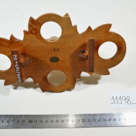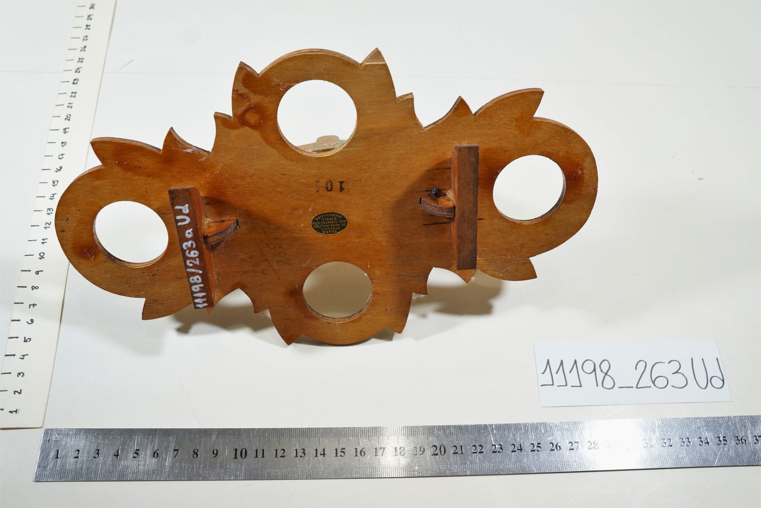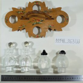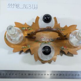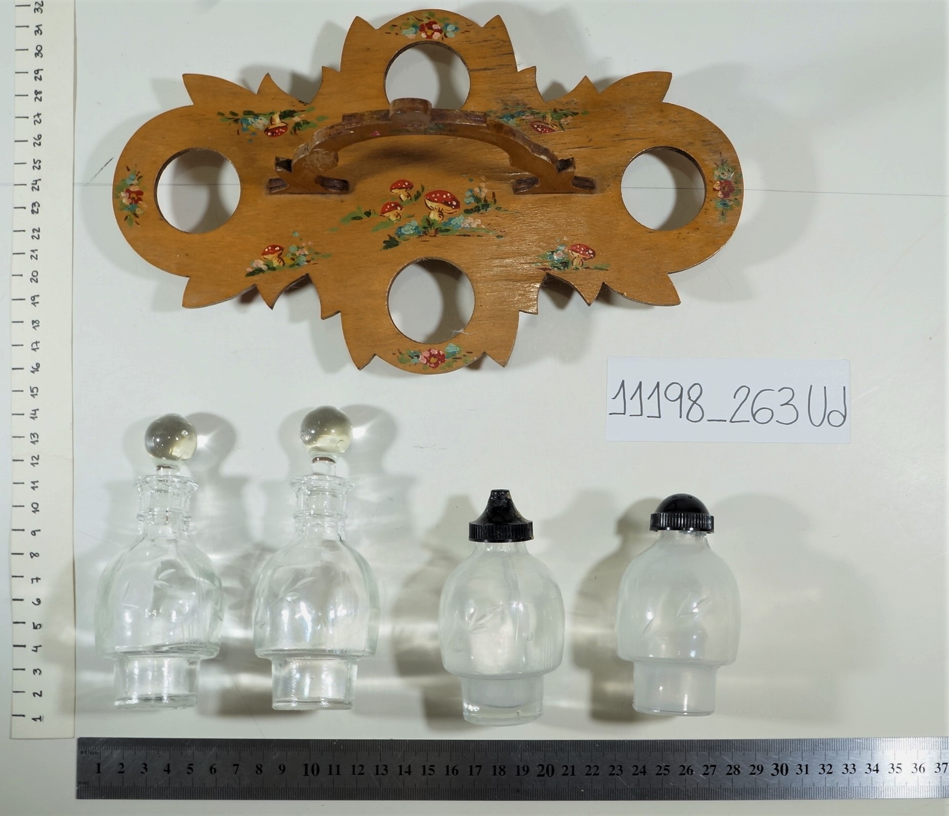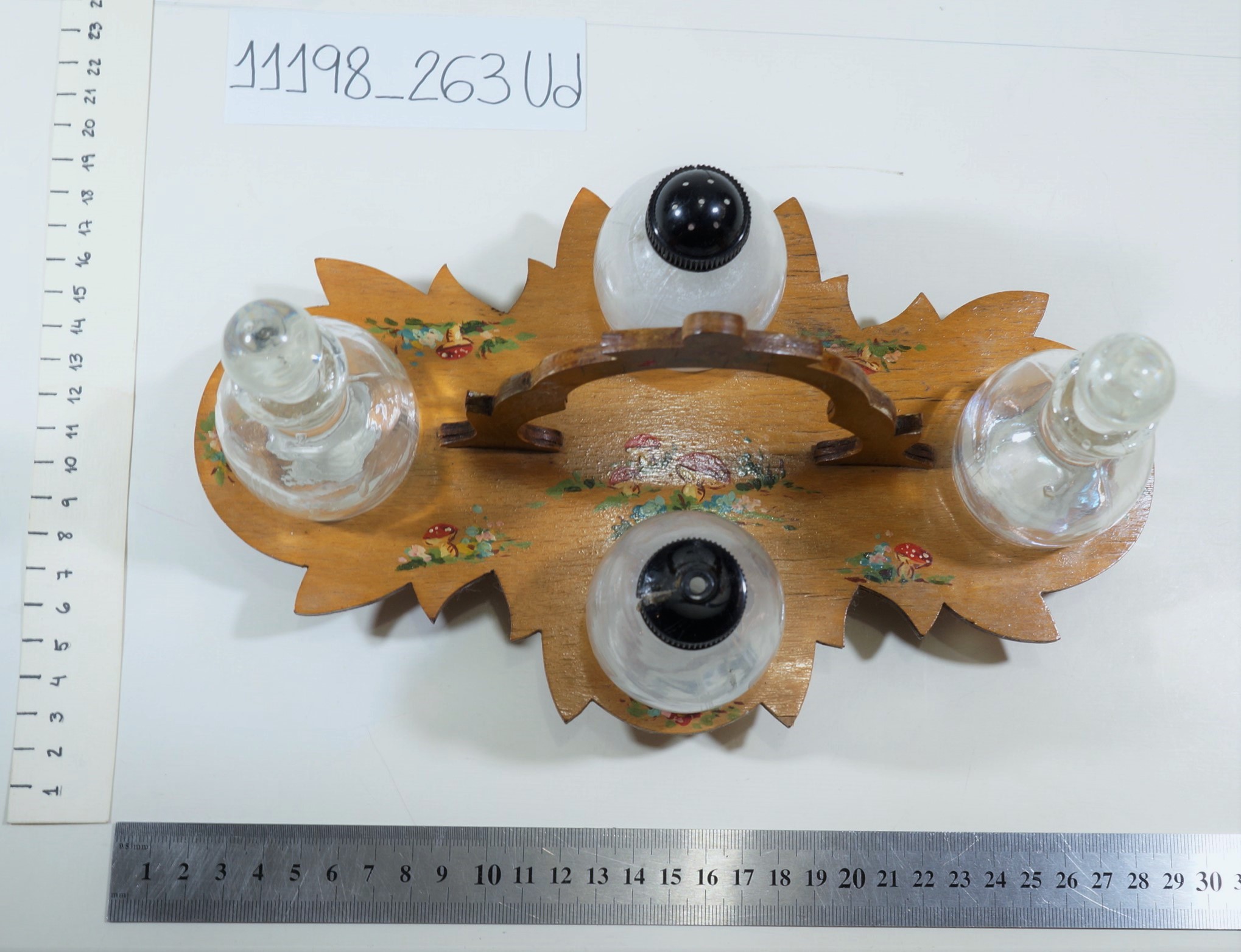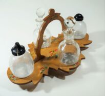 Porta-temperos de madeira, com alça central, decorada com pinturas de flores e cogumelos. Acomoda quatro frascos de vidro com decoração transparente de folhas: saleiro e paliteiro com tampas plásticas na cor preta, e dois recipientes para azeite e vinagre com tampa de vidro. Suporte e tampas com rachaduras.