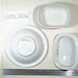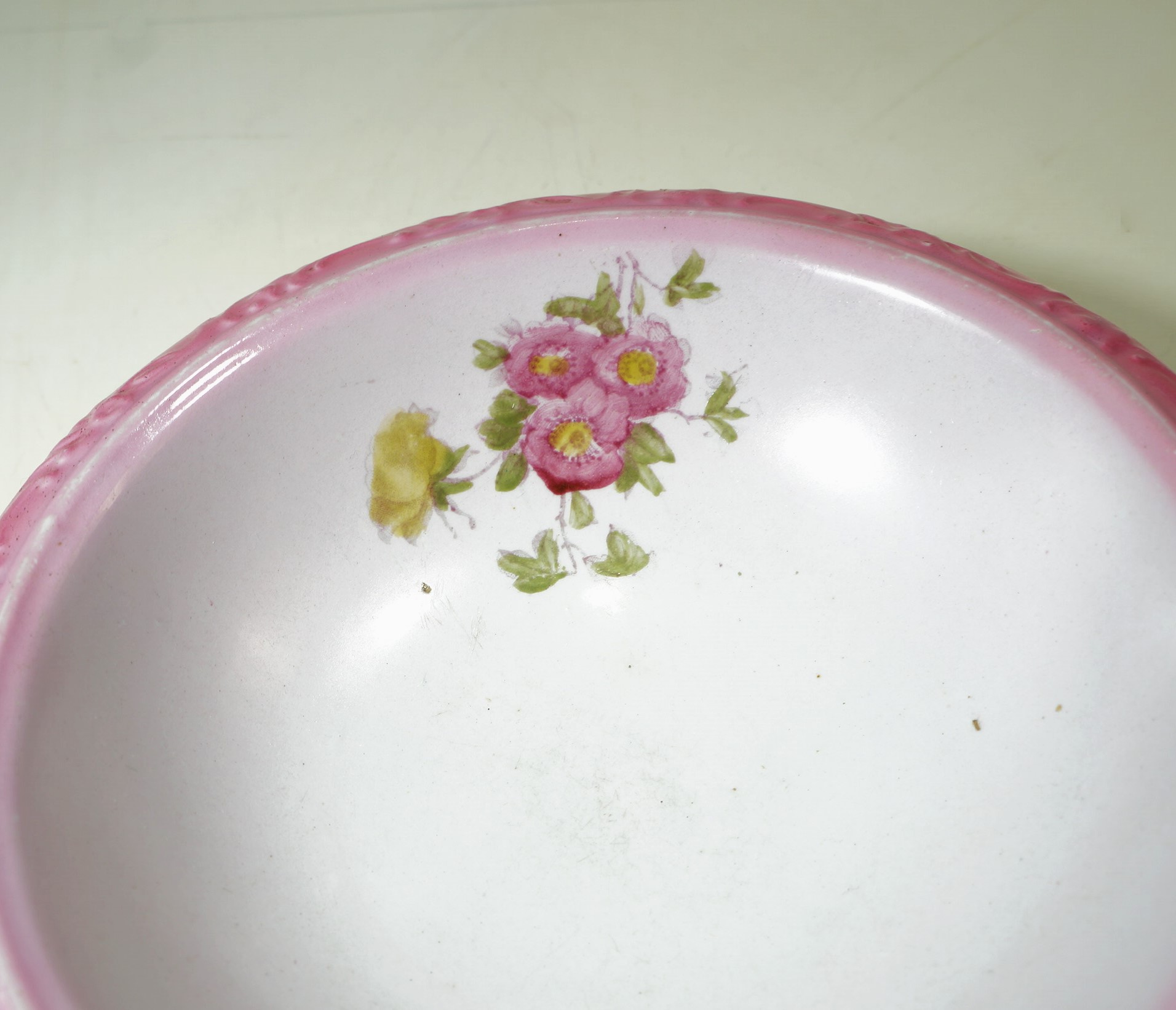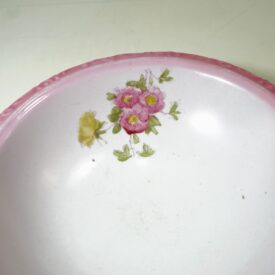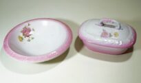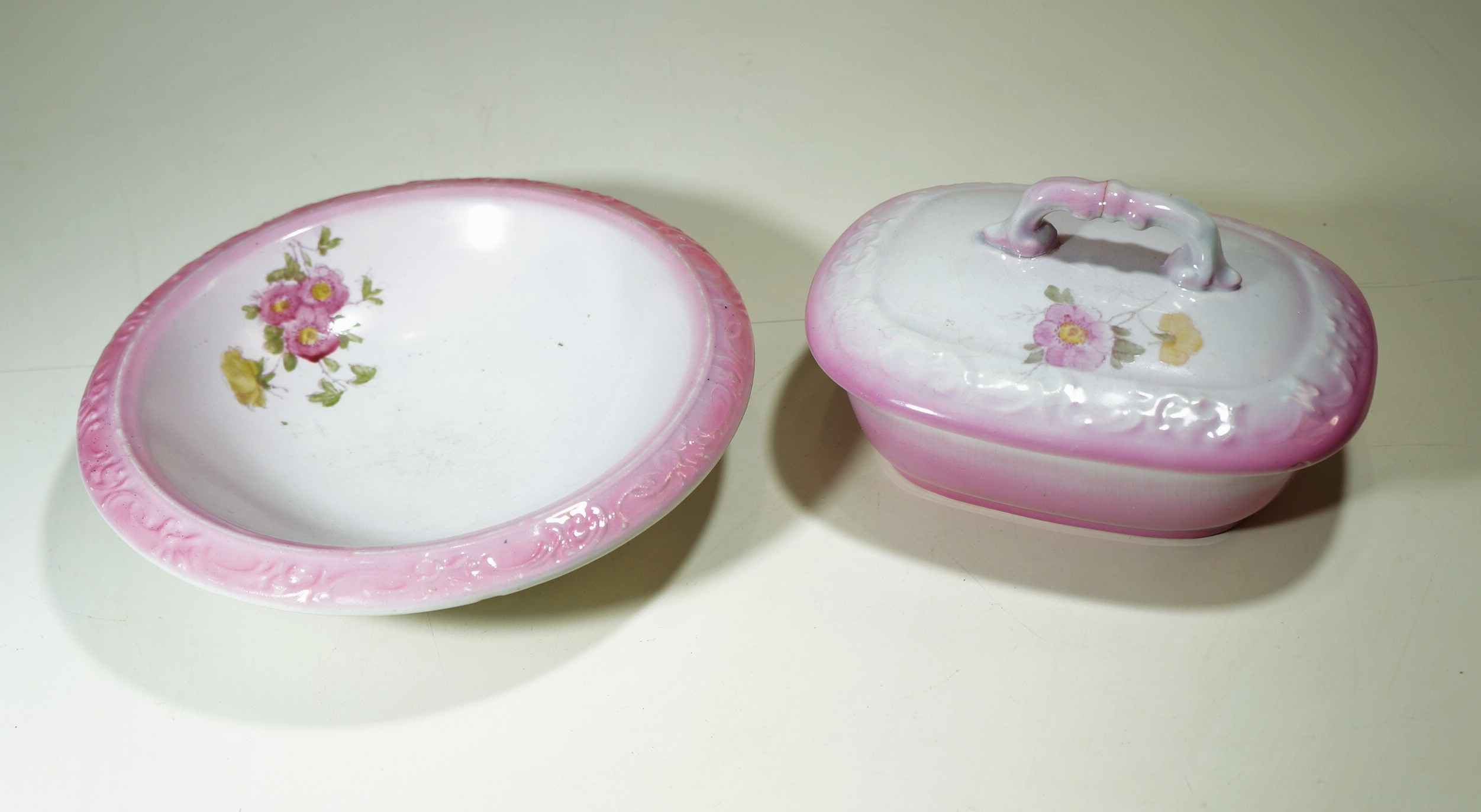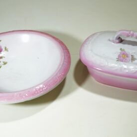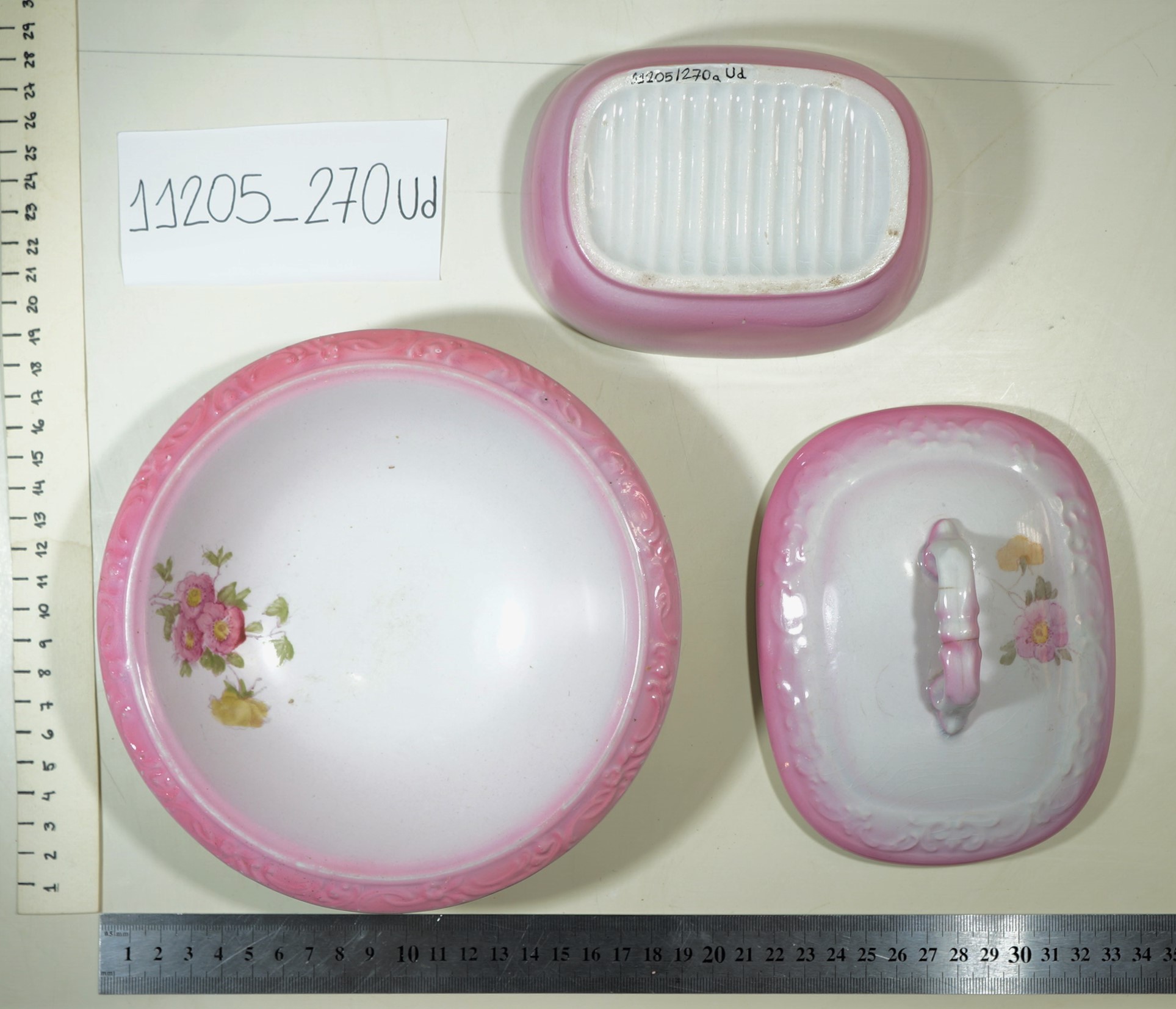 Conjunto de toucador de porcelana, composto por uma saboneteira com tampa e um recipiente (tigela). A tigela possui uma borda saliente decorada com temas florais em relevo e pintada de rosa. No seu interior também há o desenho de três flores da cor rosa, uma verde e de alguns tamos verdes. A saboneteira também possui algumas partes pintadas de rosa, uma alça superior na tampa e a decoração de uma flor rosa com ramos verdes e uma flor amarela. Conjunto apresenta pequenos arranhões, desgastando a camada de tinta rosa. Fundo da tigela possui manchas de sujeira. Tampa da saboneteira possui duas rachaduras. Uma delas circula parcialmente, e a outra circula completamente a alça.