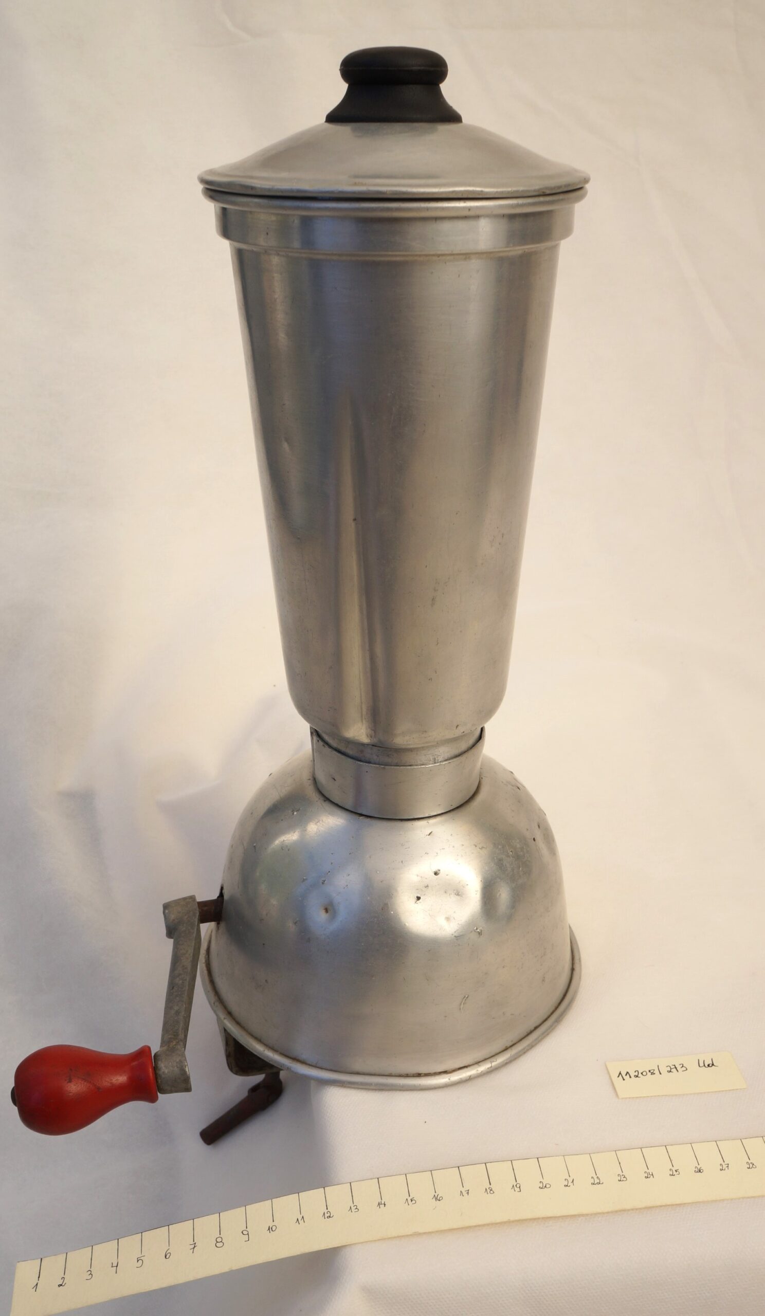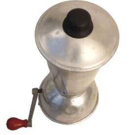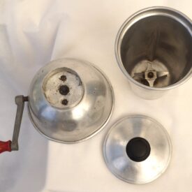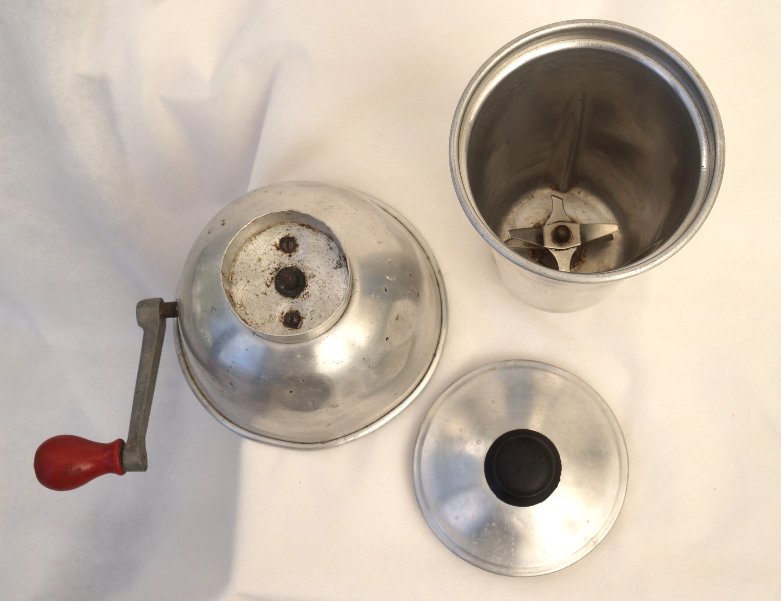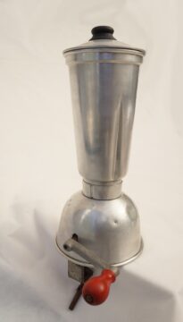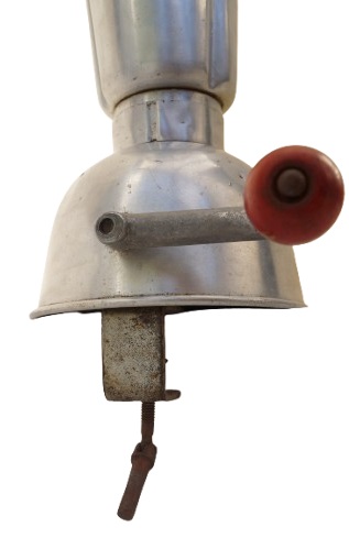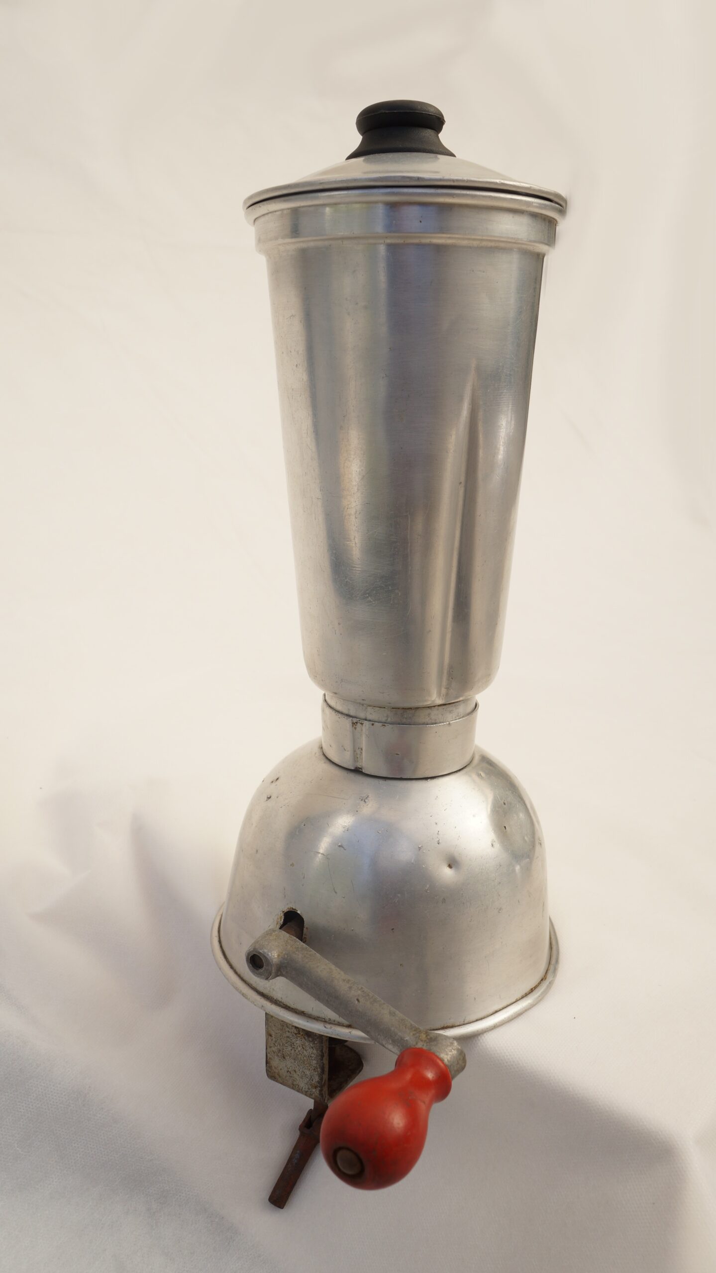 Liquidificador de alumínio manual da marca “ Martau’, composto pela base e pelo copo. A base possui um dispositivo para fixação em mesa e uma manivela na cor vermelha. O copo possui tampa e hélice de trituração/moagem.