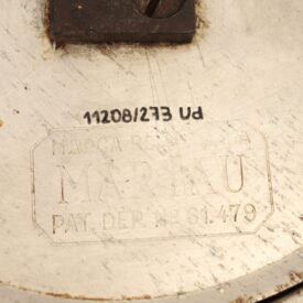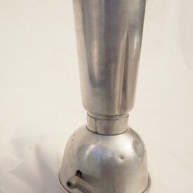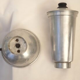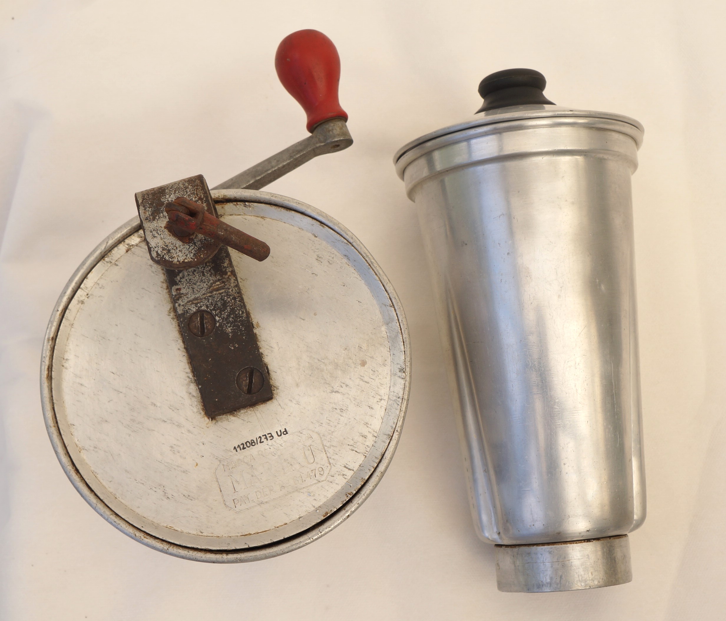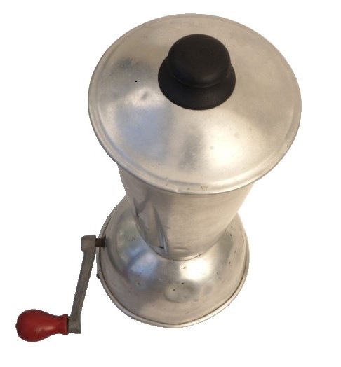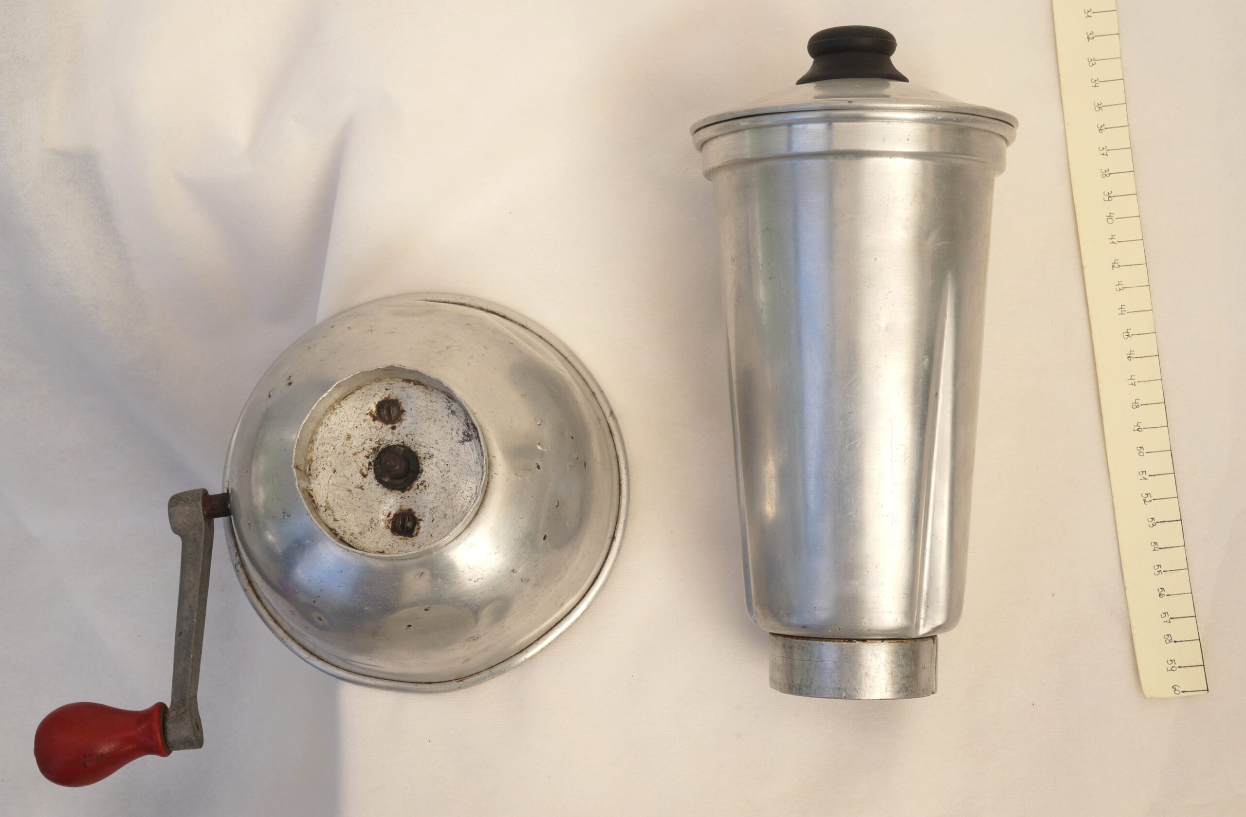 Liquidificador de alumínio manual da marca “ Martau’, composto pela base e pelo copo. A base possui um dispositivo para fixação em mesa e uma manivela na cor vermelha. O copo possui tampa e hélice de trituração/moagem.