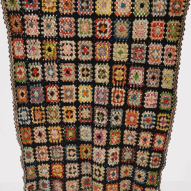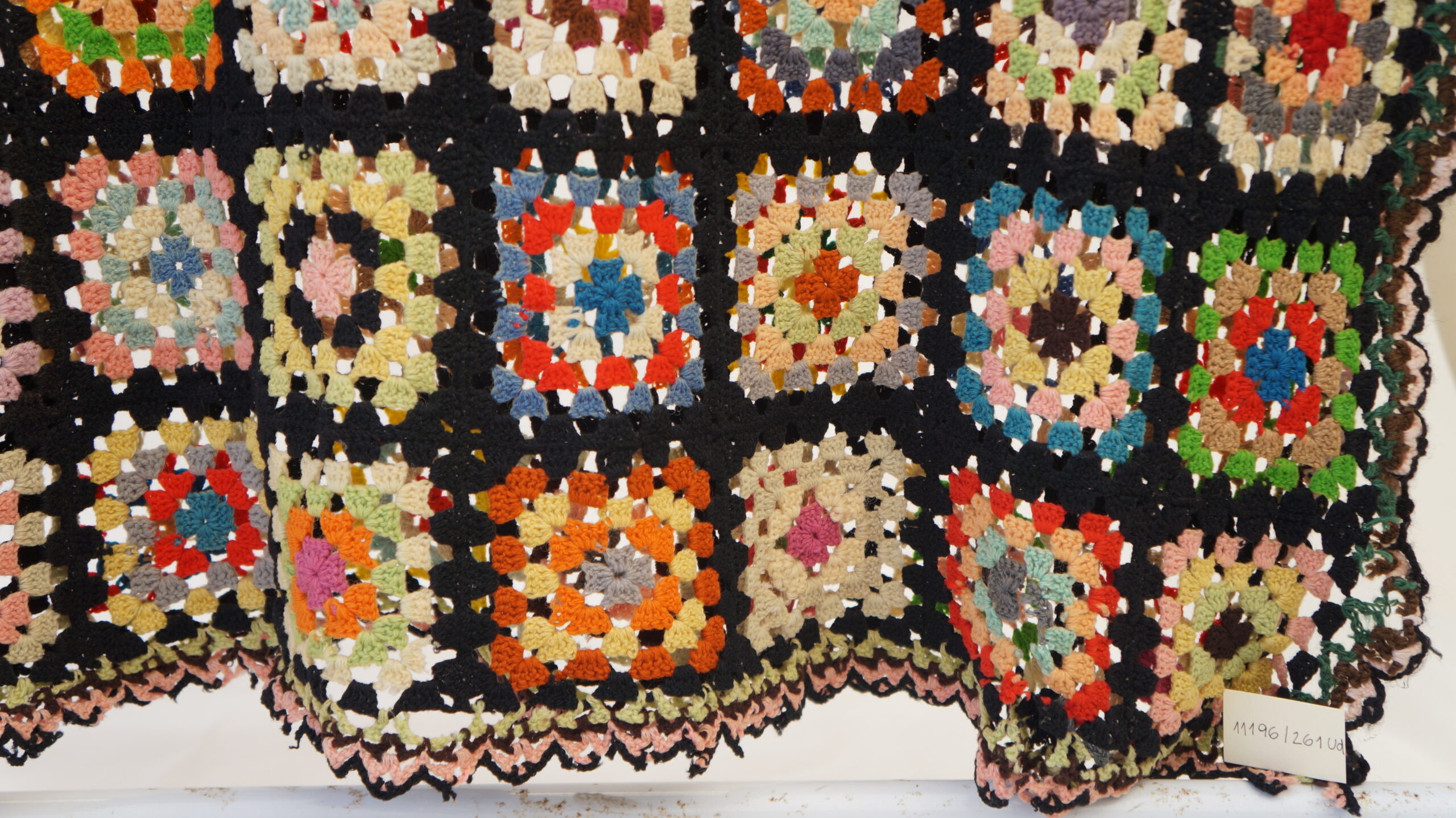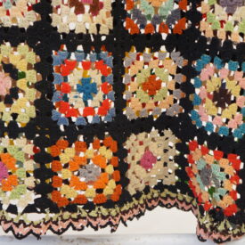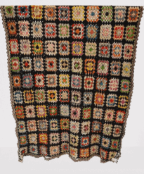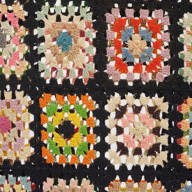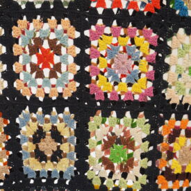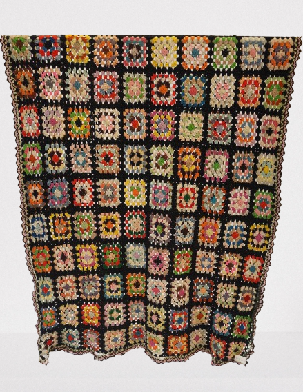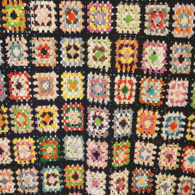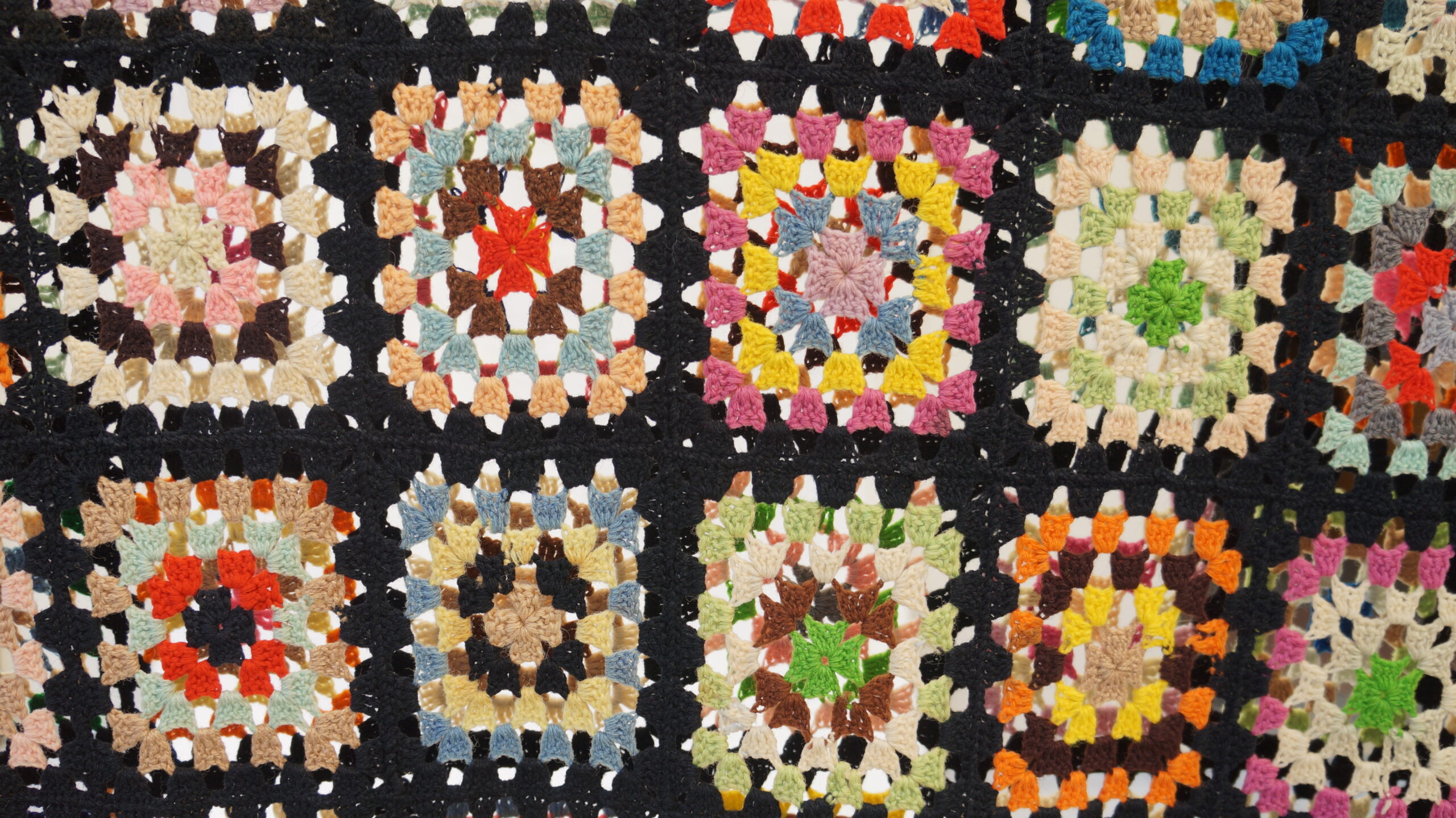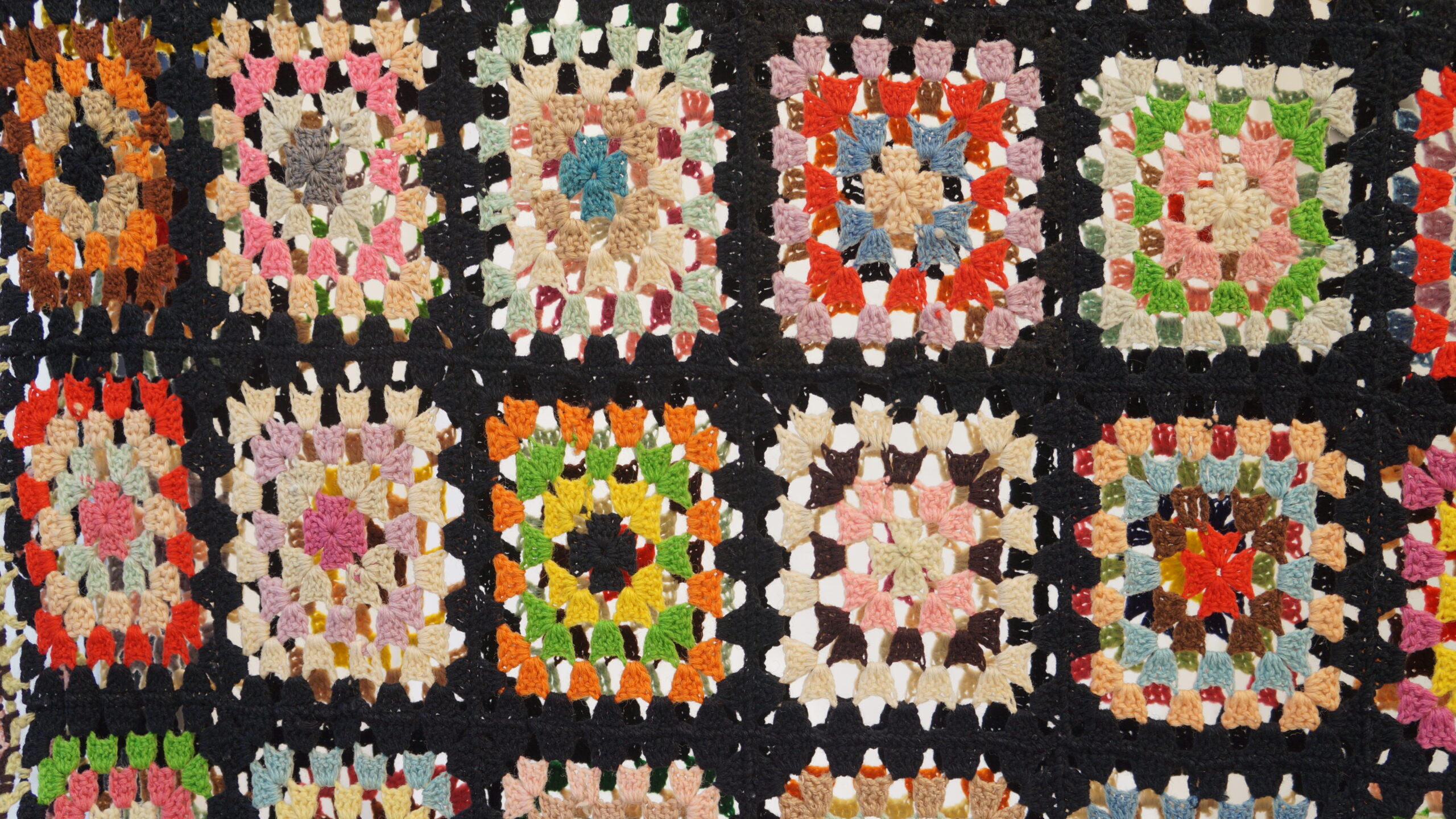 Colcha de crochê colorida composta por vários quadrados, estilo "granny squares", cada um com cores e padrões diferentes, todos contornados por linha preta. Nas bordas há detalhes em rosa e verde-claro.