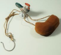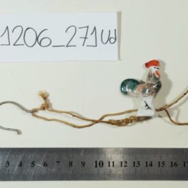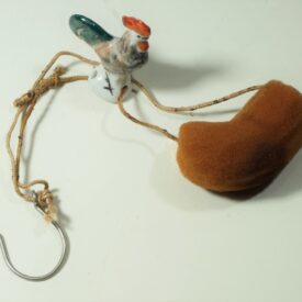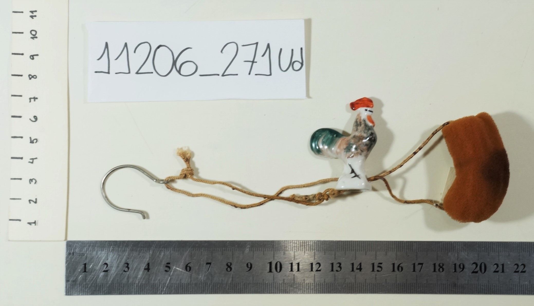 Objeto composto por um galo de porcelana, com a crista laraja e corpo nas cores verde e marrom, amarrado por uma corda a um pedaço de esponja. Na mesma encontra-se amarrado também um metal em formato de gancho. Corda está seca, manchada e quebradiça. Foi mantida junta com dois nós pequenos. Esponja possui uma mancha escura no meio.