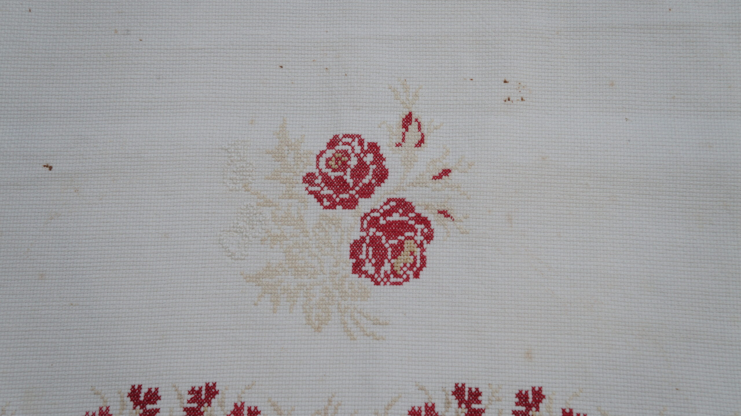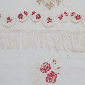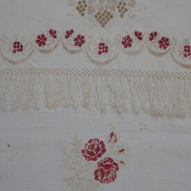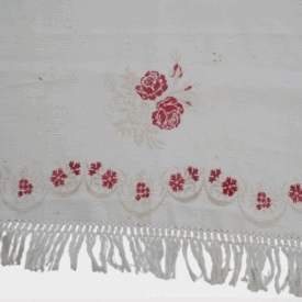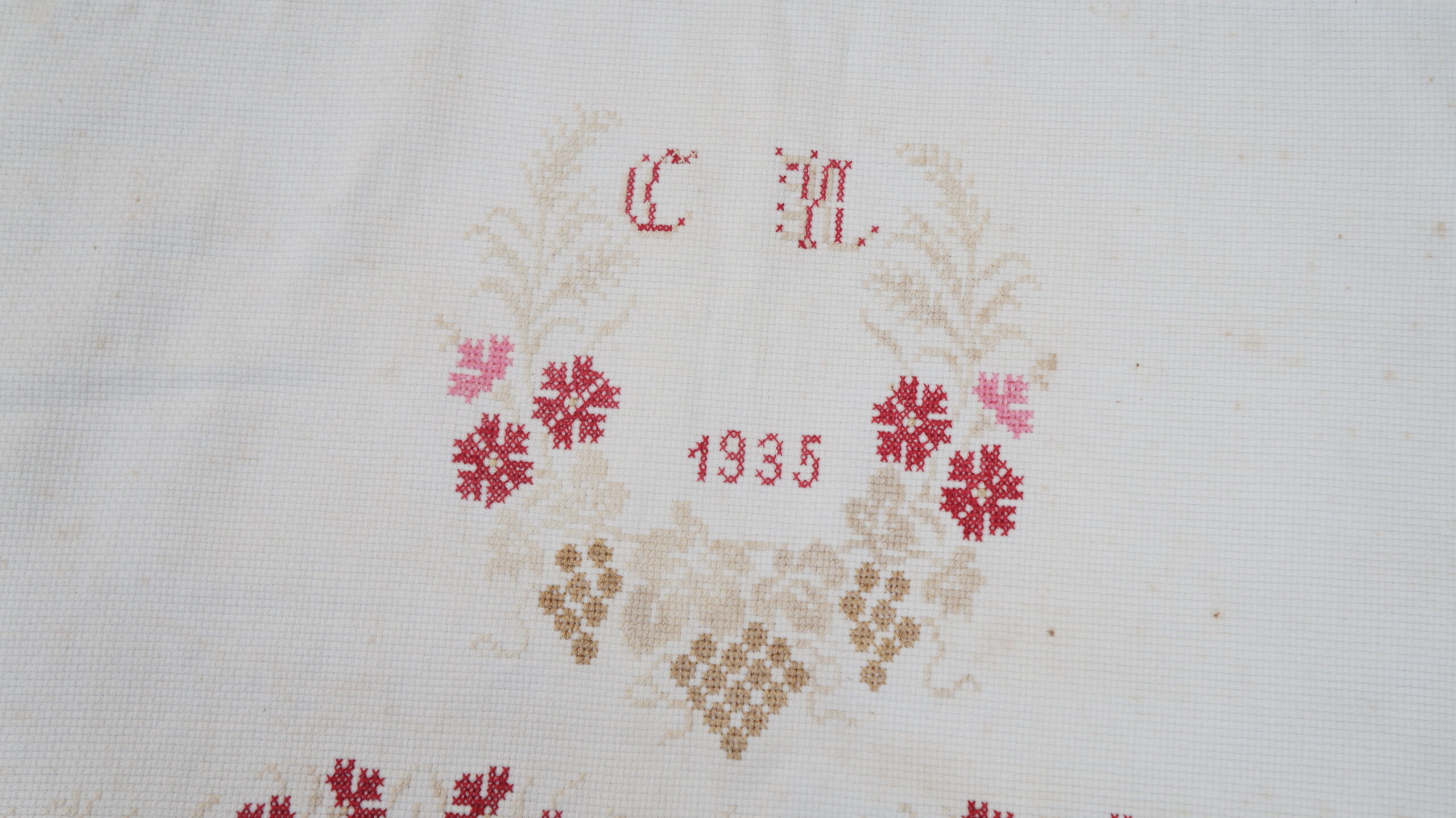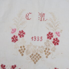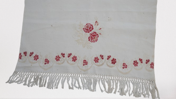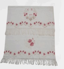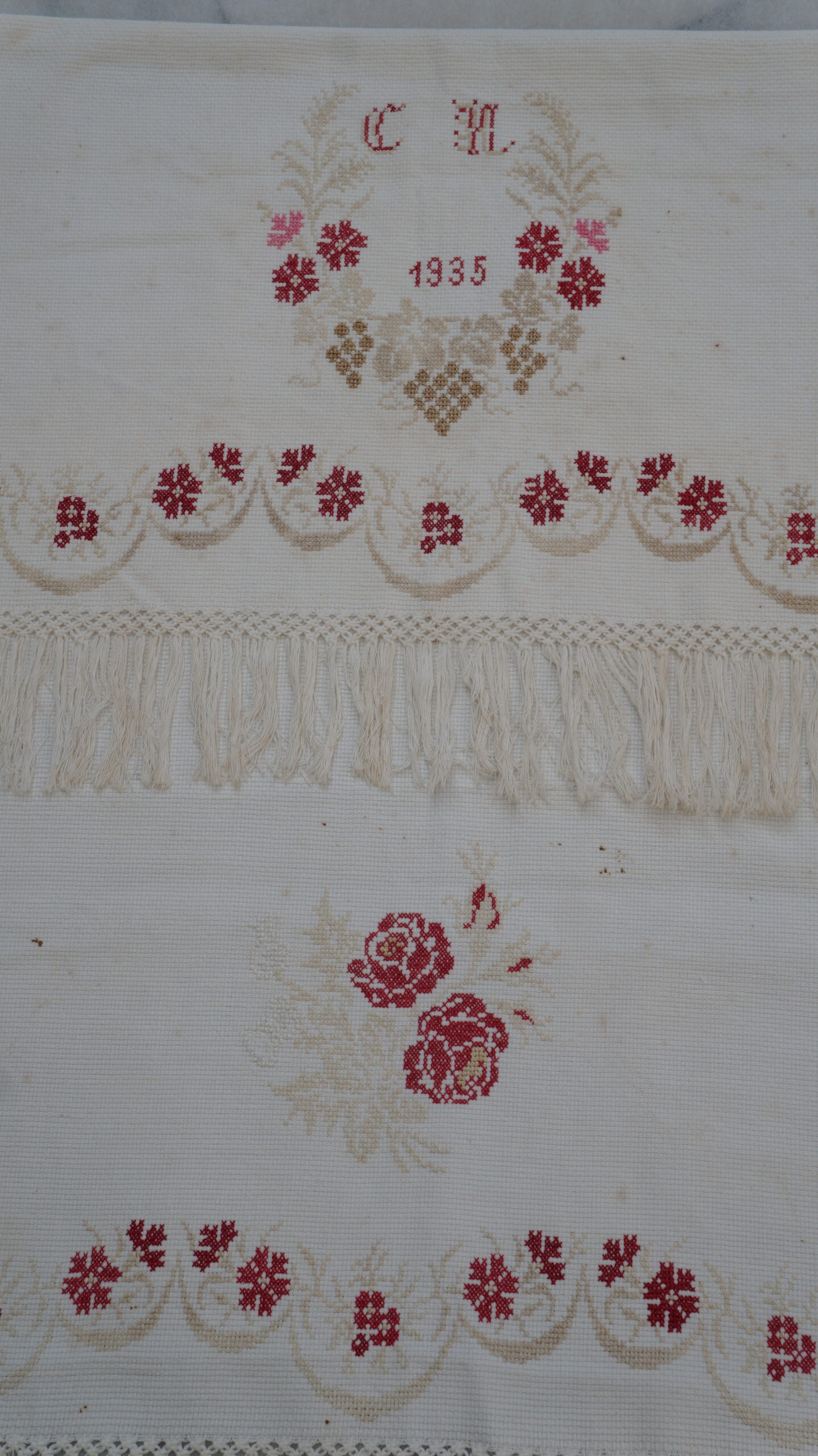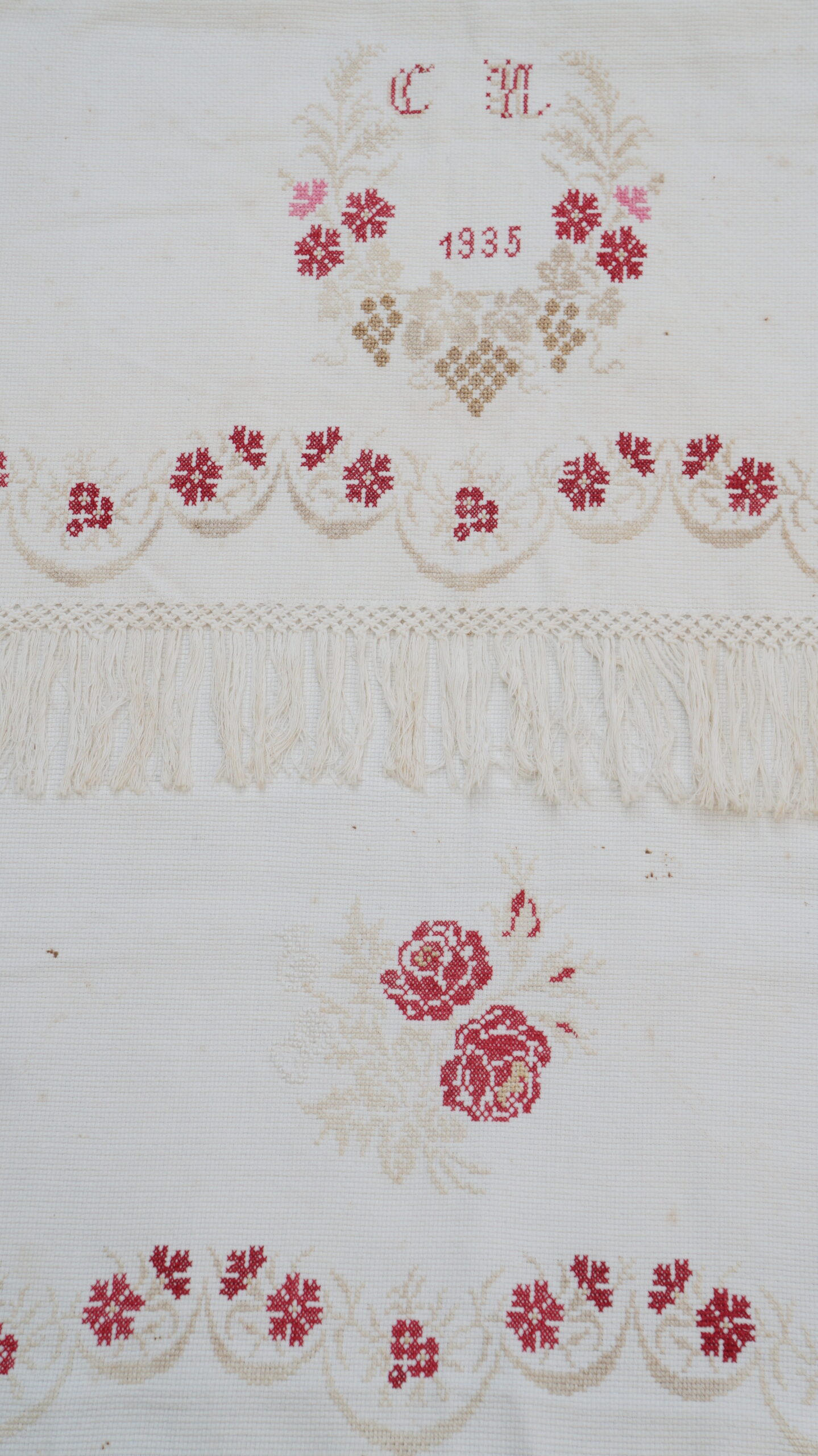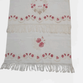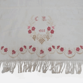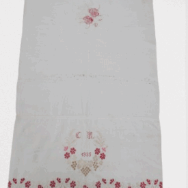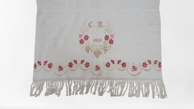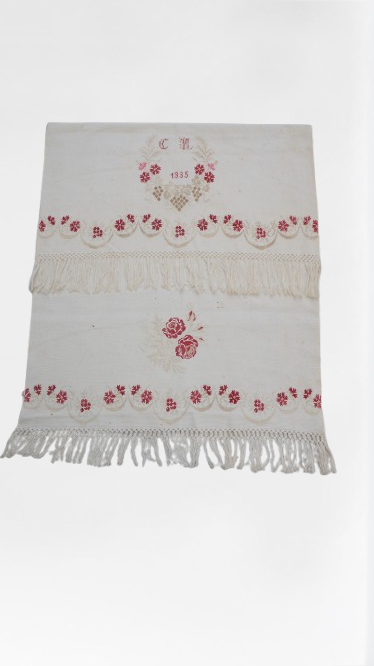 Pano decorativo confeccionado em tecido branco com bordados em vermelho e bege. Os detalhes incluem franja de macramê nas extremidades, padrões florais bordados ao longo das bordas e, no centro, um bordado em forma de coração com as iniciais "C" e "M" e o ano "1935".