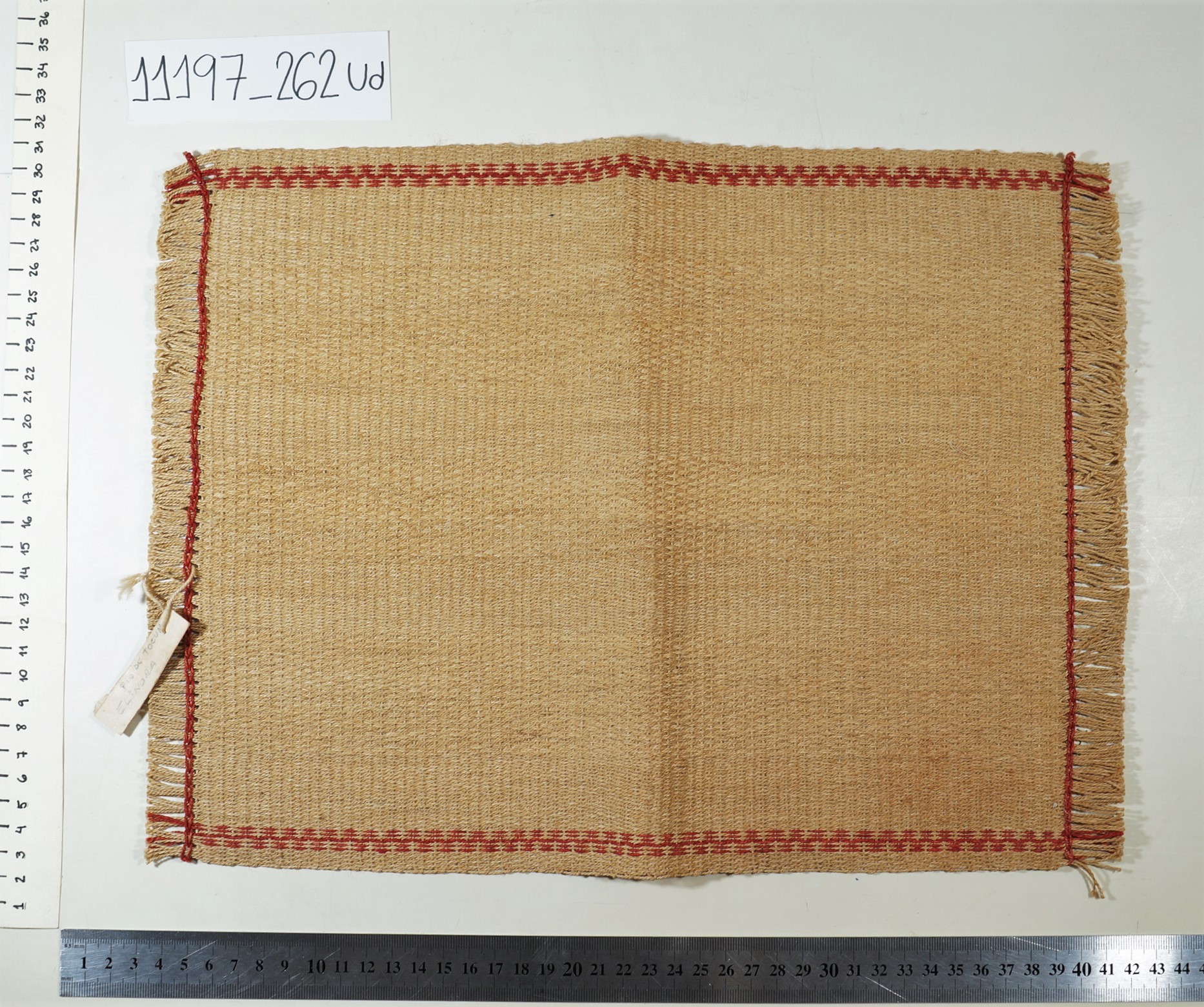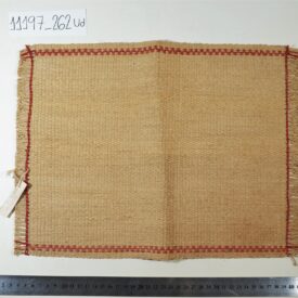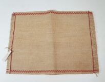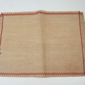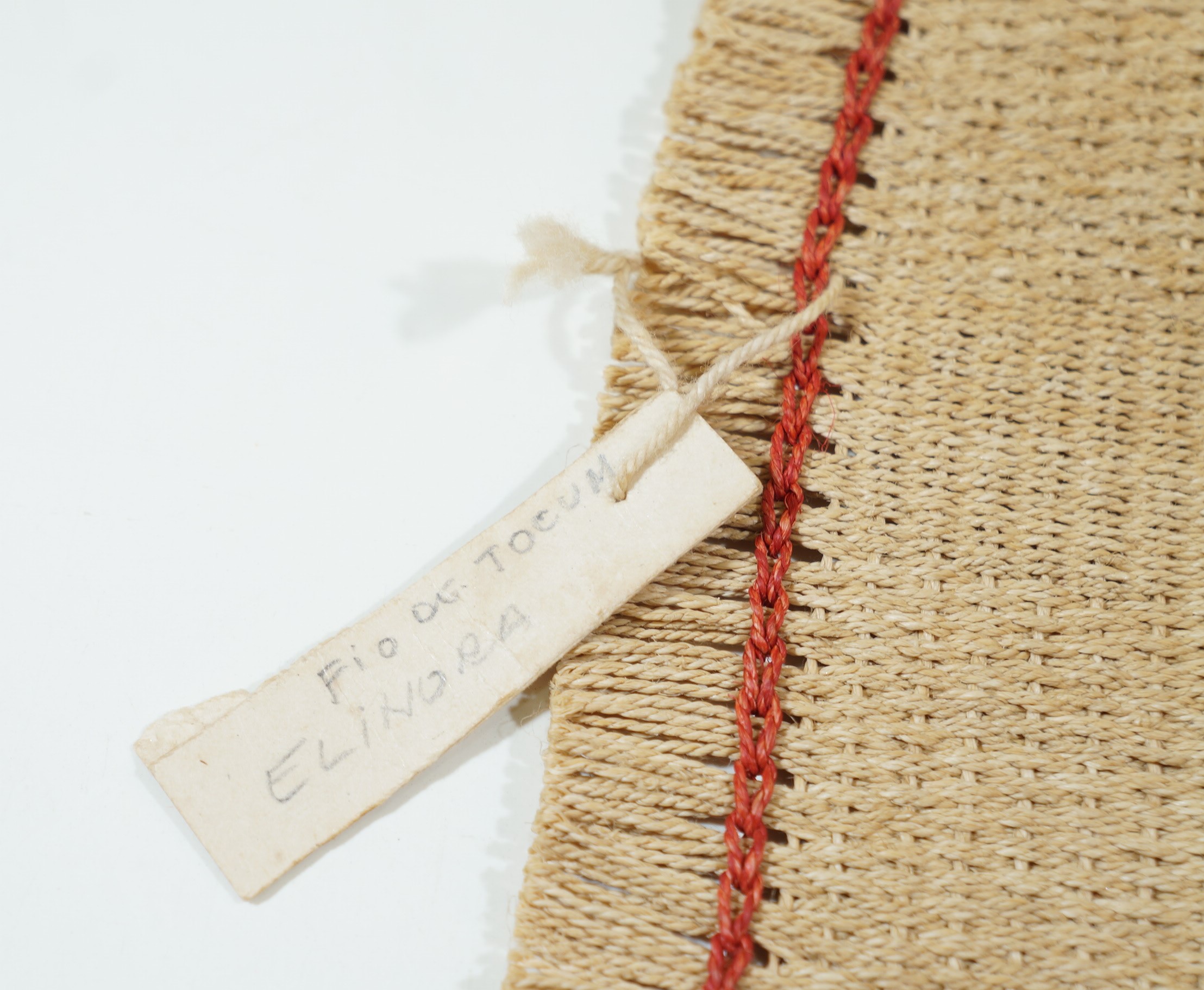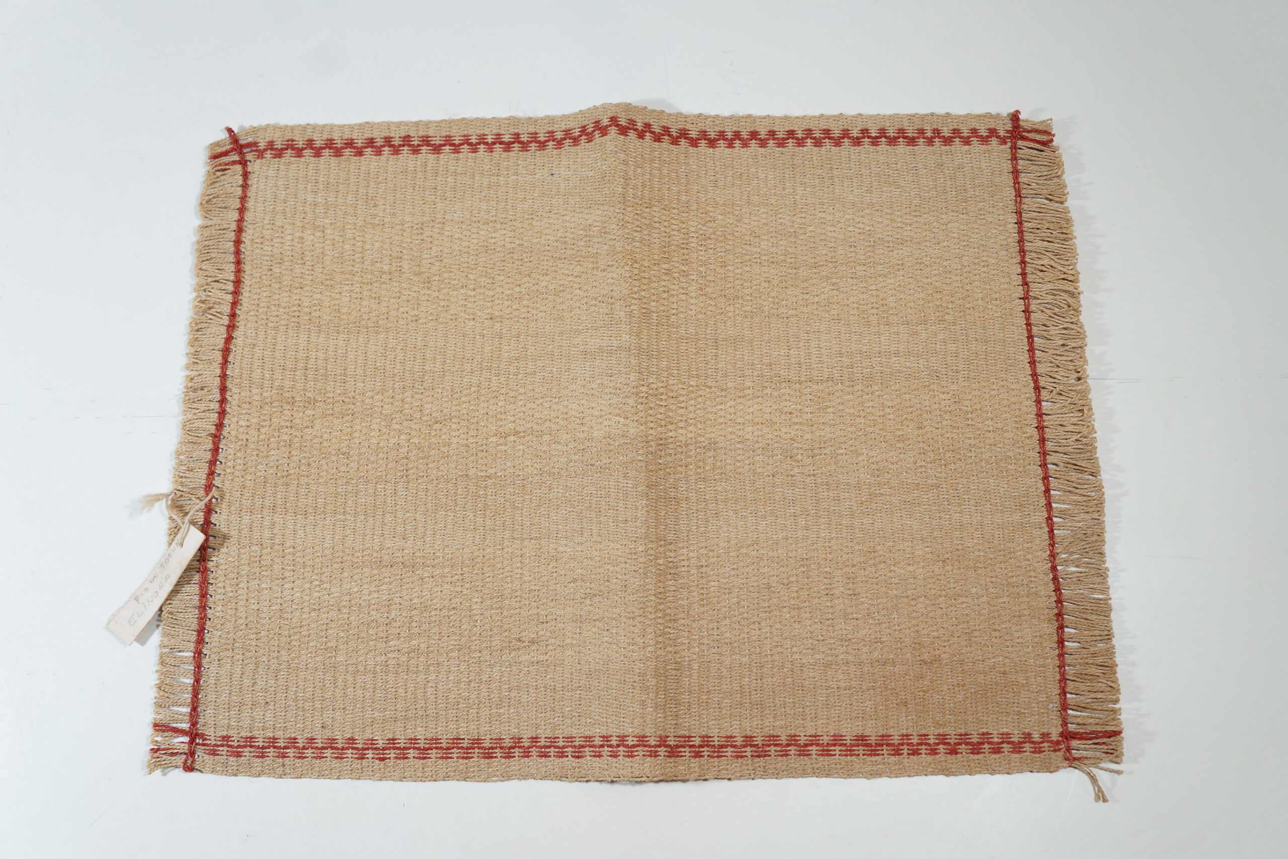 Jogo americano em fibra natural na cor cru com bordas desfiadas. Costura em linha reta feita com linha vermelha ao longo das bordas. Etiqueta presa na lateral onde se lê FIO DE TOCUM/ELINORA.