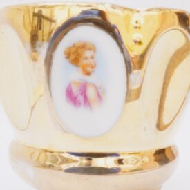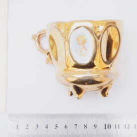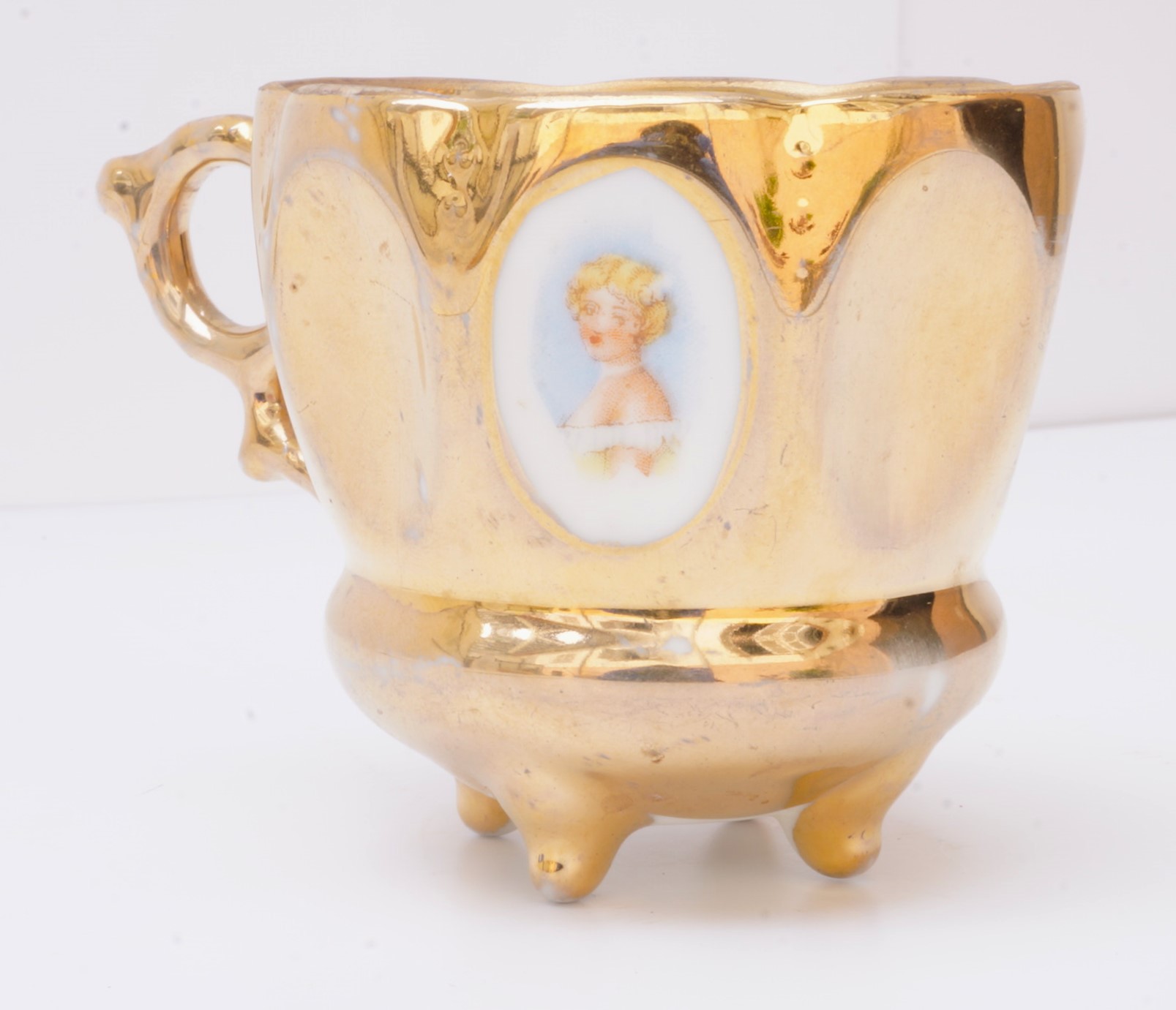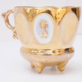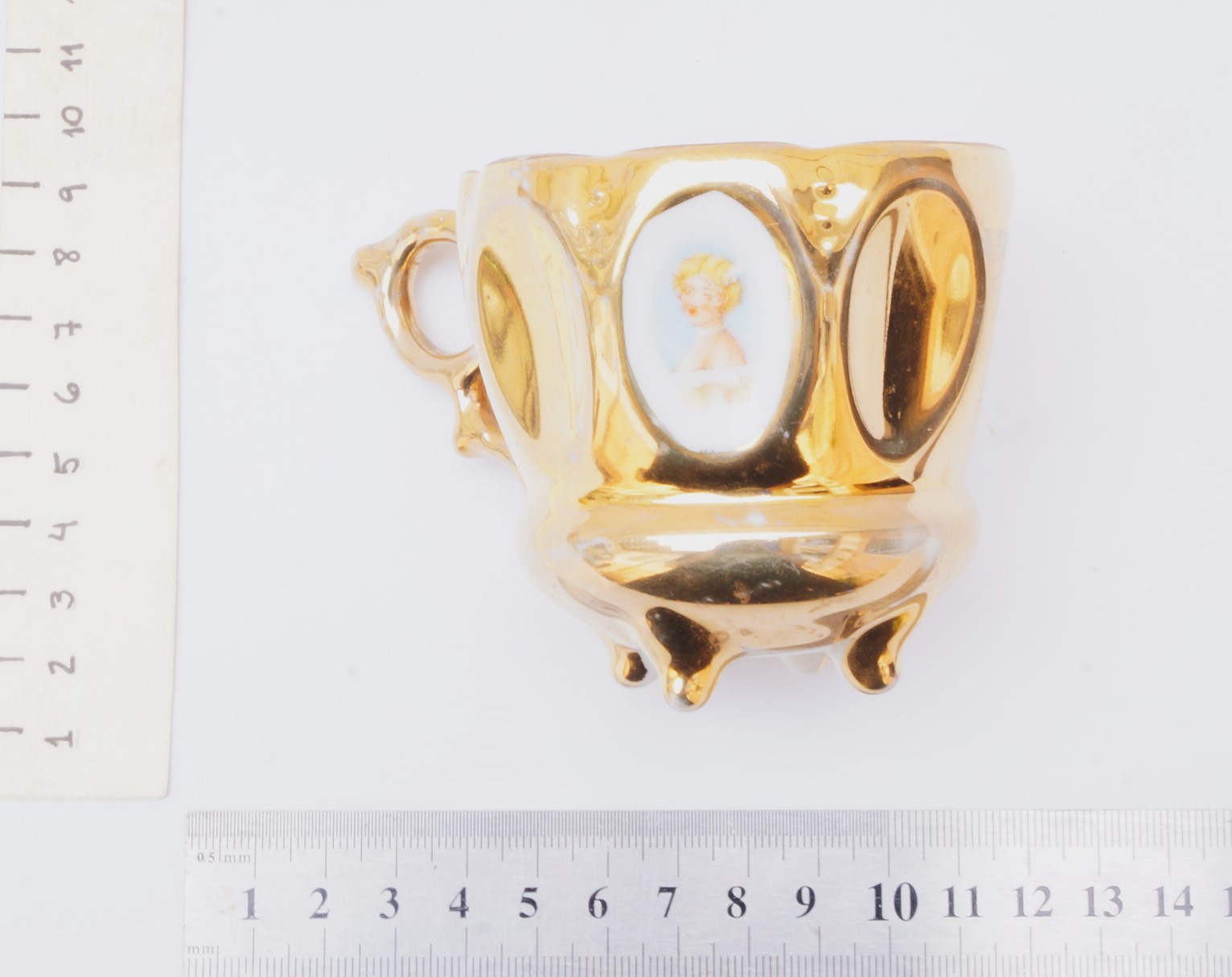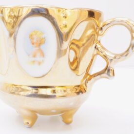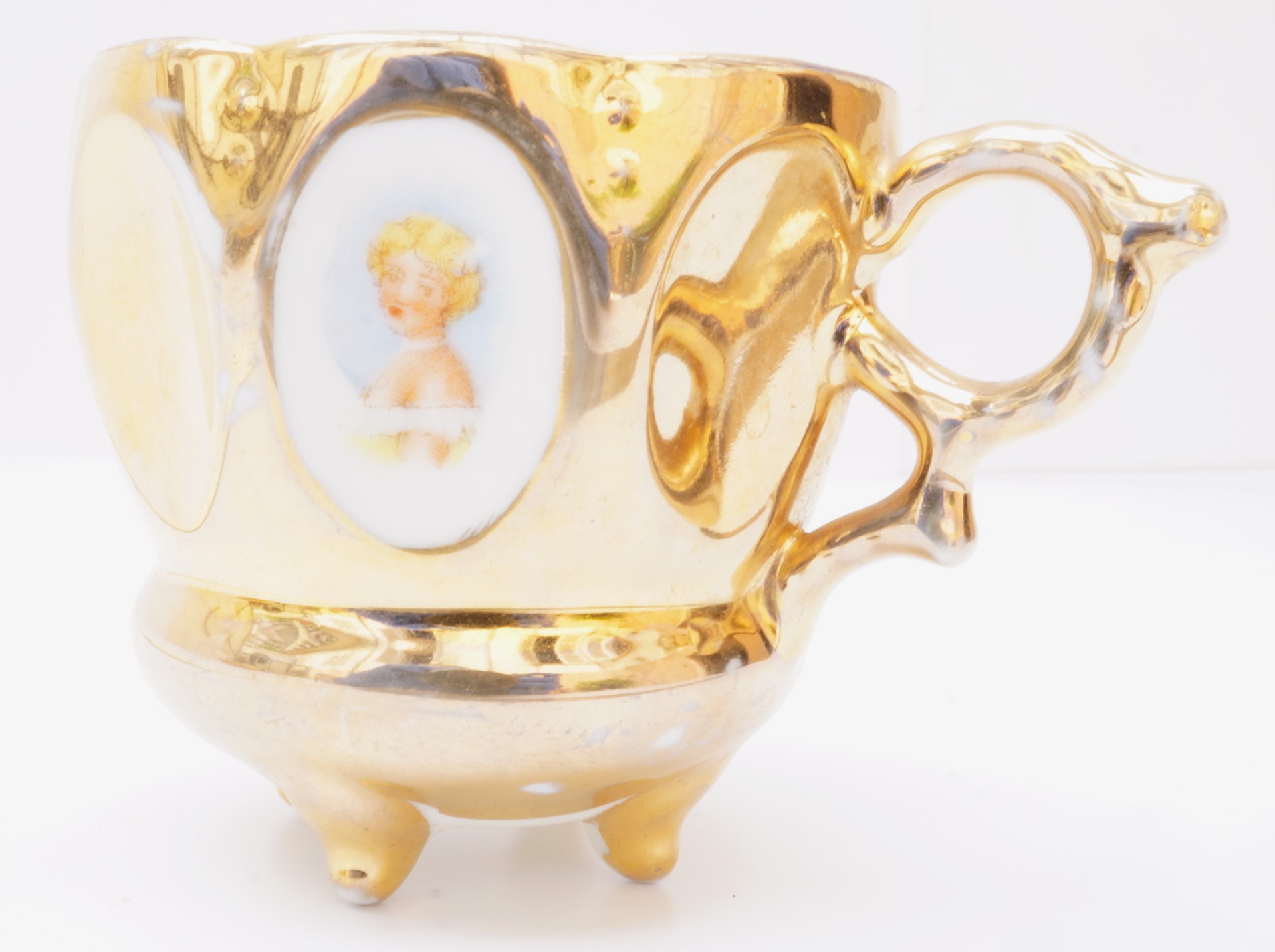Xícara de plástico com alça lateral curva, quatro pés. Parte externa pintada na cor dourada, parte interna na cor branca. Quatro imagens em formato oval, duas com mulheres, uma de cabelo castanho com coque e outra de cabelo loiro escuro. Base da xícara com etiqueta do fabricante J.H Made in Japan.